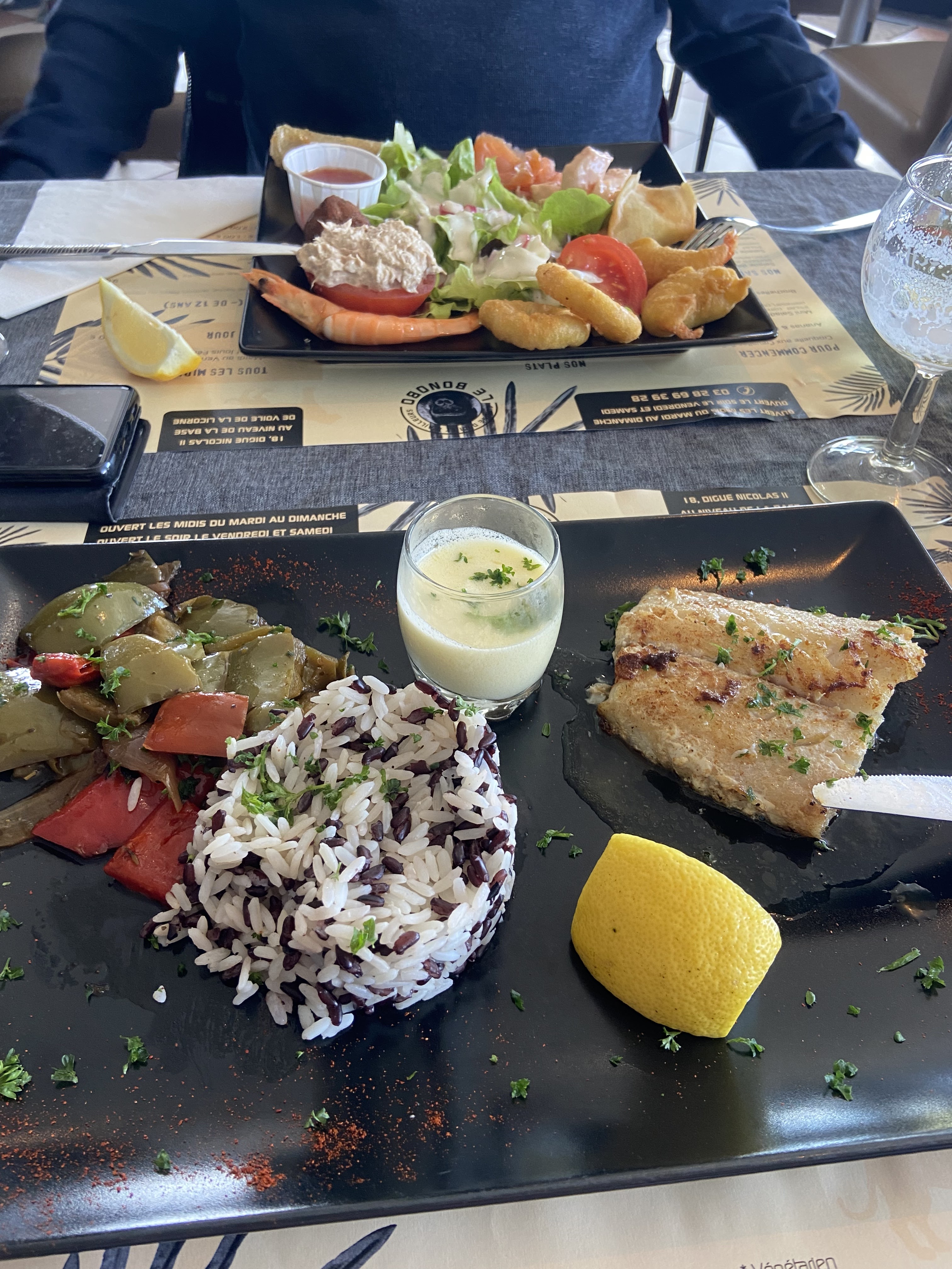 Nous sommes venus en famille ce midi ... accueil très chaleureux ! Nous avons été servis par une stagiaire très souriante ! Ayant un enfant de deux ans nous avons commandé son plat en même temps que les apéritifs mais celui ci n'est arrivé qu'en même temps que les plats pour adulte ... Je trouve cela dommage surtout que nous avions commandé quelque chose de simple et non fait maison (la serveuse nous a dit que c'était des croustibat) Quelle déception pour un restaurant en bord de mer qui propose en plus plusieurs plats à base de poisson pour les plus grands ! Cependant malgré ce point négatif, mon plat était tout simplement délicieux : un filet de Saint Pierre avec une tranche de saumon fumé (petit bémol sur les accompagnements : riz nature et ratatouille *je suis allergique aux aubergines donc je n'ai pas pu goûter* qui n'ont pas été précisés lors de la commande) ! Le plat du jour et la salade Océane ont été appréciés également !