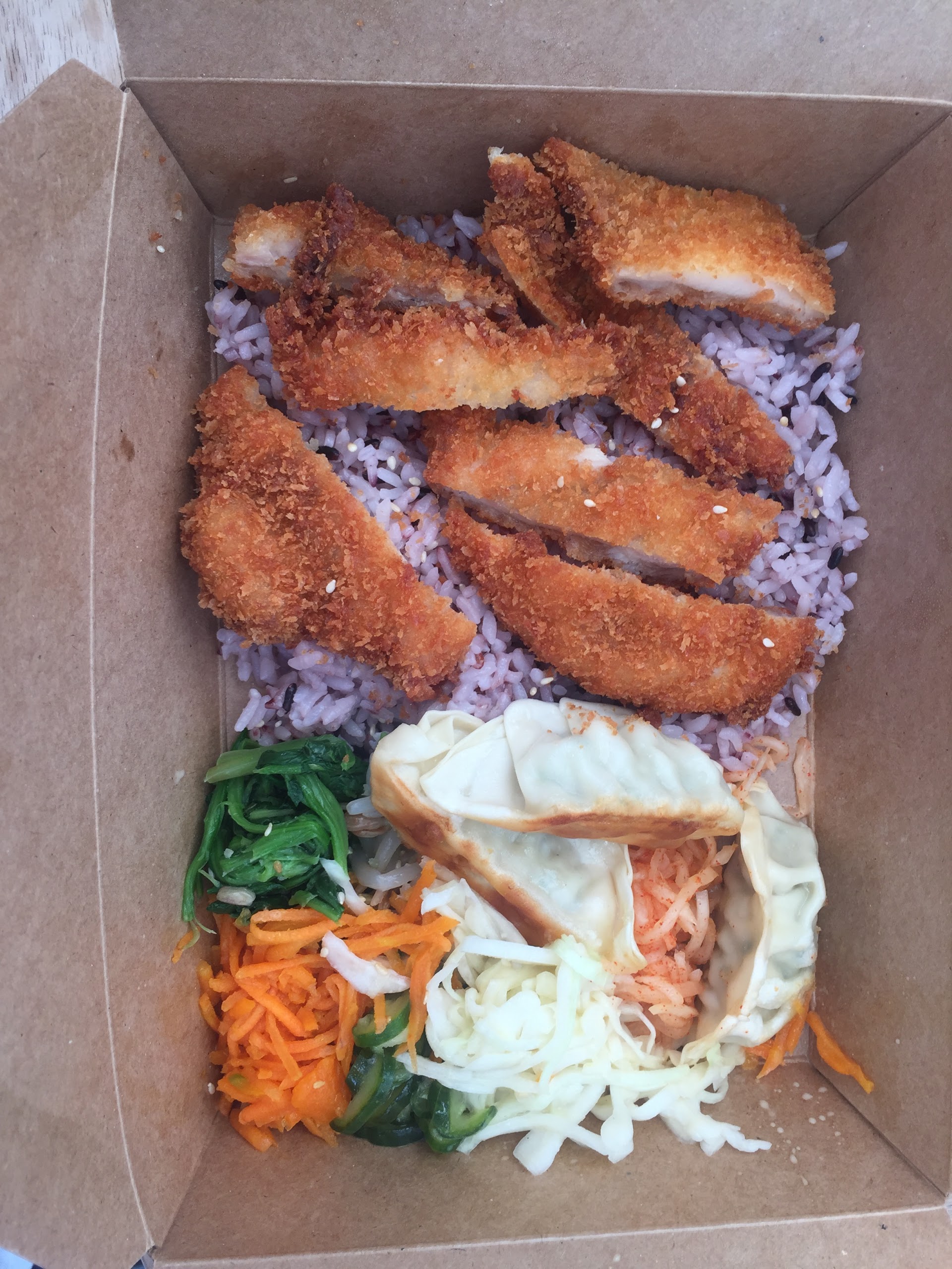 L’accueil est souriant. Le bibimbap à emporter est composé de légumes marinés et goûteux, d’une protéine et de riz blanc et noir qui mériterait d’être agrémenté avec par exemple des graines de sésame grillées