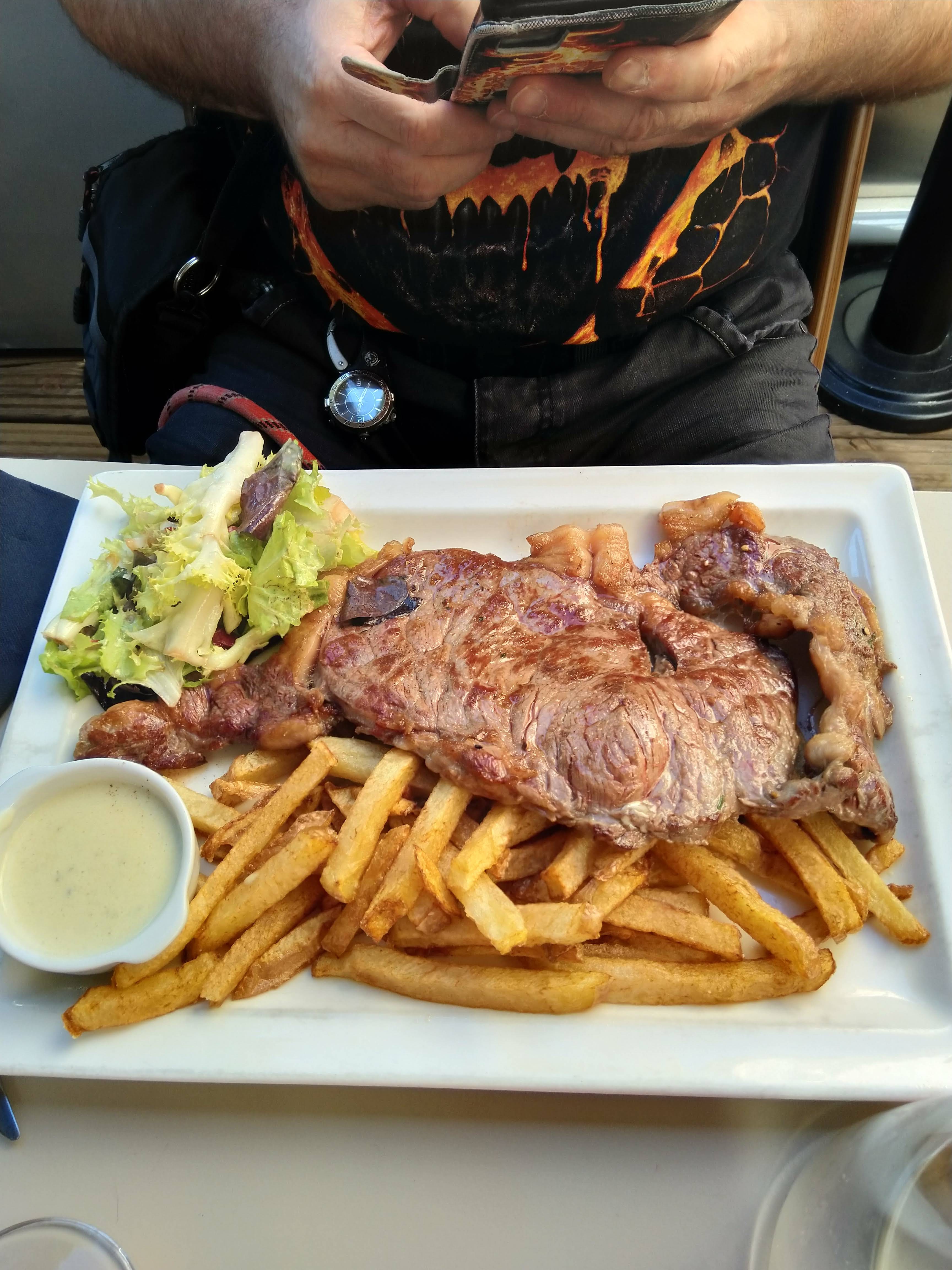 DES entrecôtes taillées tellement fine qu’il est impossible de la cuire correctement et pour 26€ avec 12 frites congelées et deux feuilles de salade … Des côtes de veaux sans côte car certainement coupées en deux, demandées rosées arrivant bien cuite , idem que les entrecôtes pour la garniture. Des vins aux alentours de 25/30€ sans aucun intérêt alors que la région fourmille de jolies petites choses. Mon conseil passé votre chemin et continuer 50 m plus loin aux « remparts » accueil et vrai cuisine.