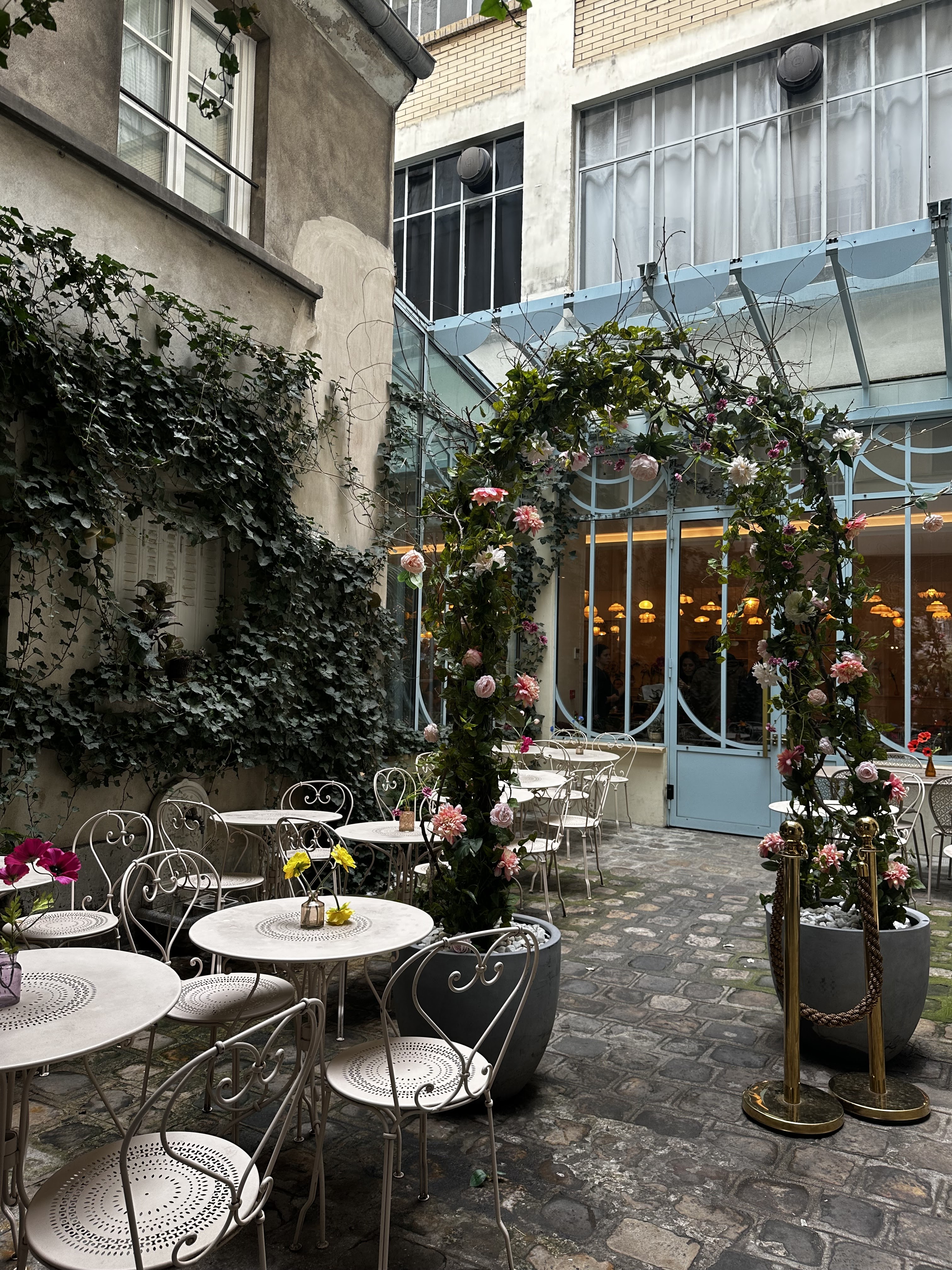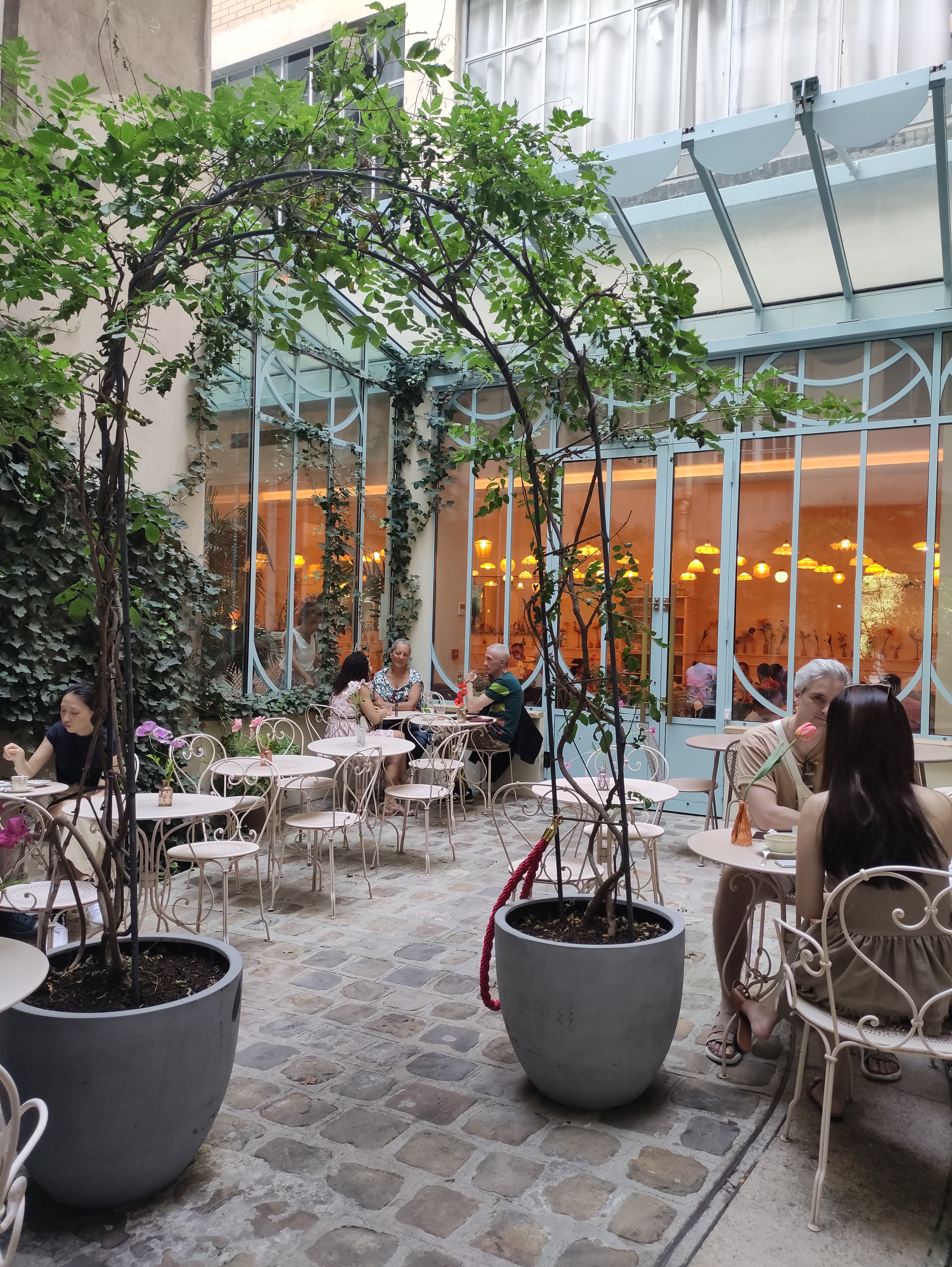Voici une adresse des plus agréables après être passé sous un discret porche, vous arrivez dans une courette au calme. Là, si vous avez une réservation, vous attendez qq minutes avant d'être placé. La déco de la salle est très simple et très douce. Des luminaires au plafond , des compositions de fausses fleurs aux murs, des tables assez basses ( un peu trop à mon goût) , des fauteuils, tabourets et canapés en velours, des teintes douces, une vaisselle raffinée...Le décor est posé. Un service souriant, aimable, rapide, organisé et aux petits soins. Et enfin, Last but not Least une assiette savoureuse : pour les adultes un menu brunch à 45€. Un jus frais parfumé à l'eau de rose, du très bon pain avec un super beurre et de la confiture très goutue. Des viennoiseries ultra fraîches. (Croisant un rien un peu gras). Puis des petits buns thon ou chorizo feuilleté sablé. Un plat avocado saumon ou épaule d'agneau...et des desserts, ceux de la pâtisserie qui fait devanture sur le rue. Paris splendeur ou Paris Bontemps au choix. Boissons chaudes au choix. Mais une seule fois. En fin de dej on vous propose un café payant à 3.80€ alors qu'à 7 dont 3 culottes courtes (enfants dans le texte) vous lâchez 270€...ça mériterait d'offrir l'expresso ou de proposer à la clientèle thé et café sans restriction ni supplément. Cet endroit selon moi vaut 5 étoiles mais en perd une par mercantilisme excessif. Dernier mot : la serveuse qui s'est occupée de nous était vraiment très sympa. Efficace et souriante. Un vrai plaisir. Une jeune femme aux cheveux châtains, Sandy je crois...:-) Bref cette adresse vaut le détours et le retour. Point à améliorer les boissons chaudes à volonté et sans supplément.