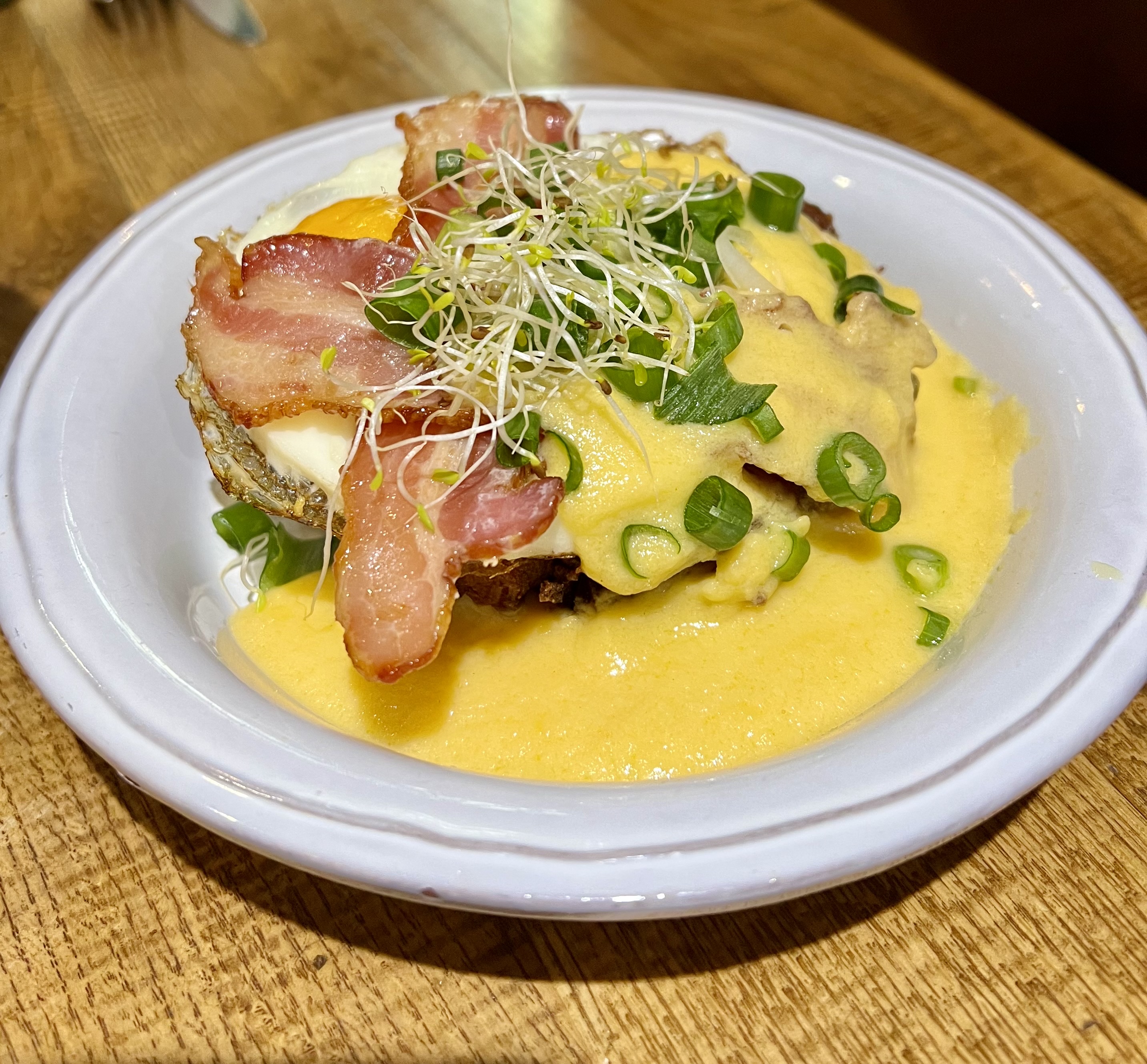 25€ le brunch. Déjà on espère que l'arnaque aura bon goût. Mais non. Le rösti bacon était infame. Une galette de pomme de terre filandreuse qui vous reste sur le ventre, d'autant plus qu'elle baigne dans une épaisse mixture orangeatre non-identifiée de crème au cheddar. C'est grossier, gras et sans aucune finesse. Sans parler du bacon qui ressemble à de l'écorce. Pancake froids, granuleux, friables : une misère que la sauce industrielle badigeonnée dessus ne saurait masquer. Délicieux crumble neanmoins.