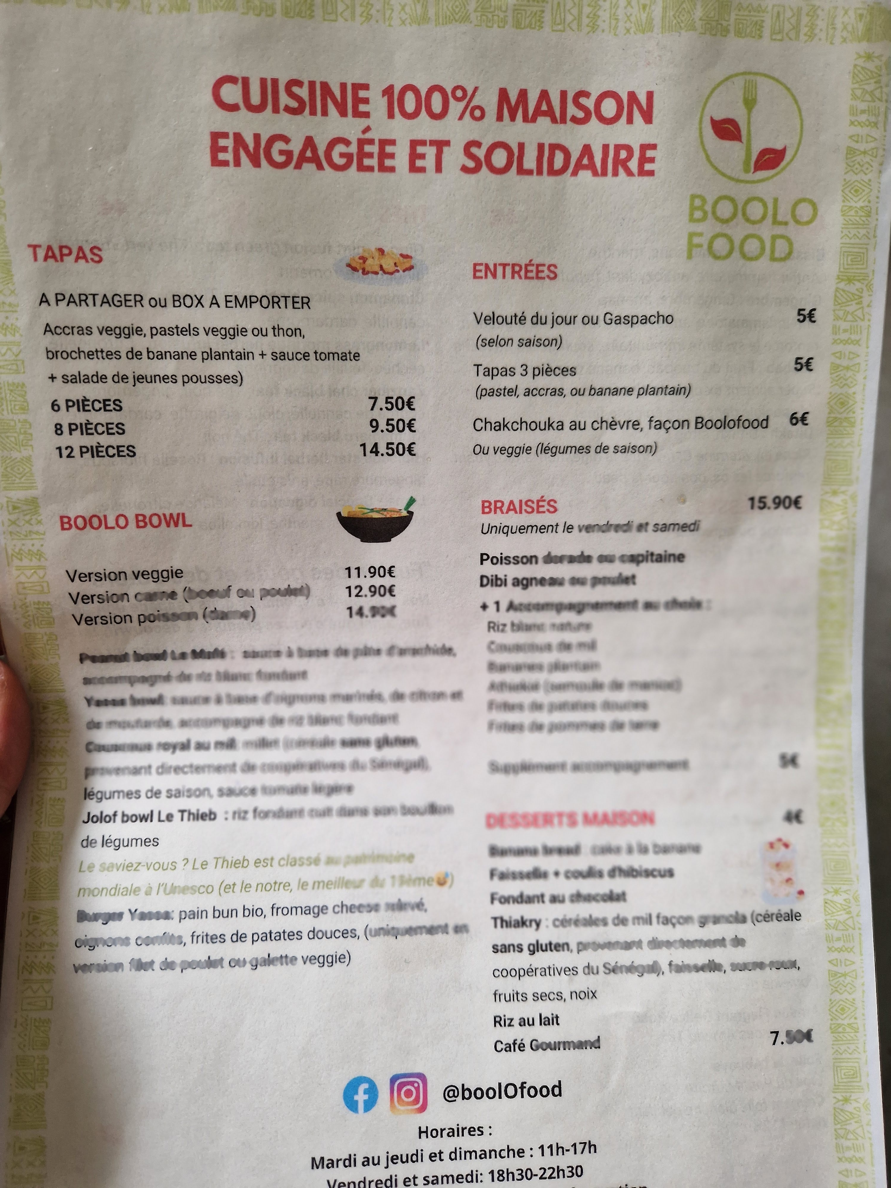 J'ai découvert Boolofood grâce à une application contre le gaspillage alimentaire. Quelle belle découverte ! Les plats sont succulents. C'est presque aussi bons de ceux de ma mère ! 😁 L'équipe est très accueillante et chaleureuse. Merci beaucoup pour cette expérience.