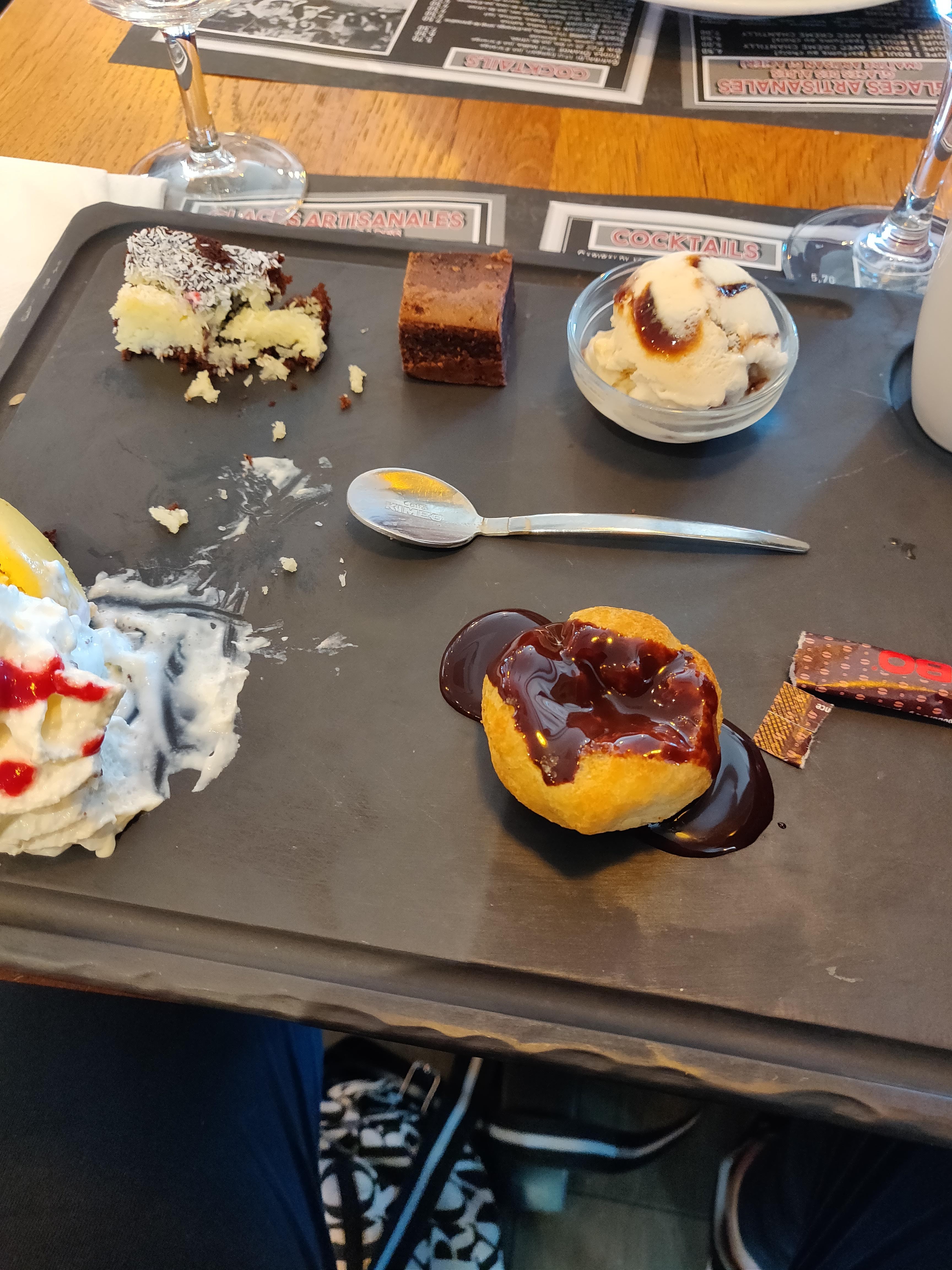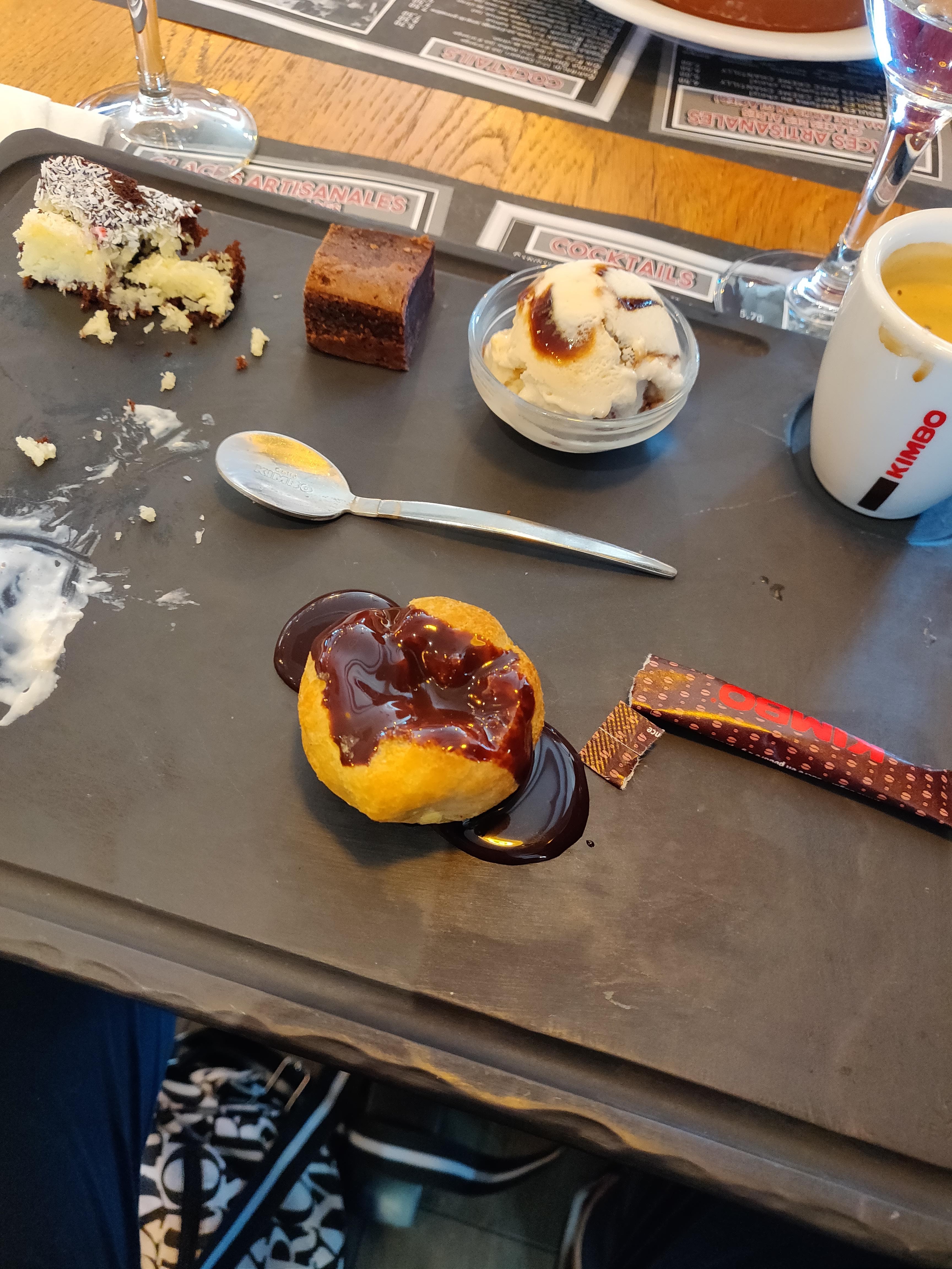 L Escalope était immangeable et la sauce des spaghettis n était pas à mon goût. Néanmoins les pizzas et les déserts de mes enfants étaient bonnes ! Je pense que le pain et deserts du café gourmand sont Congelés! Serveur sympathique malgré des erreurs de service.