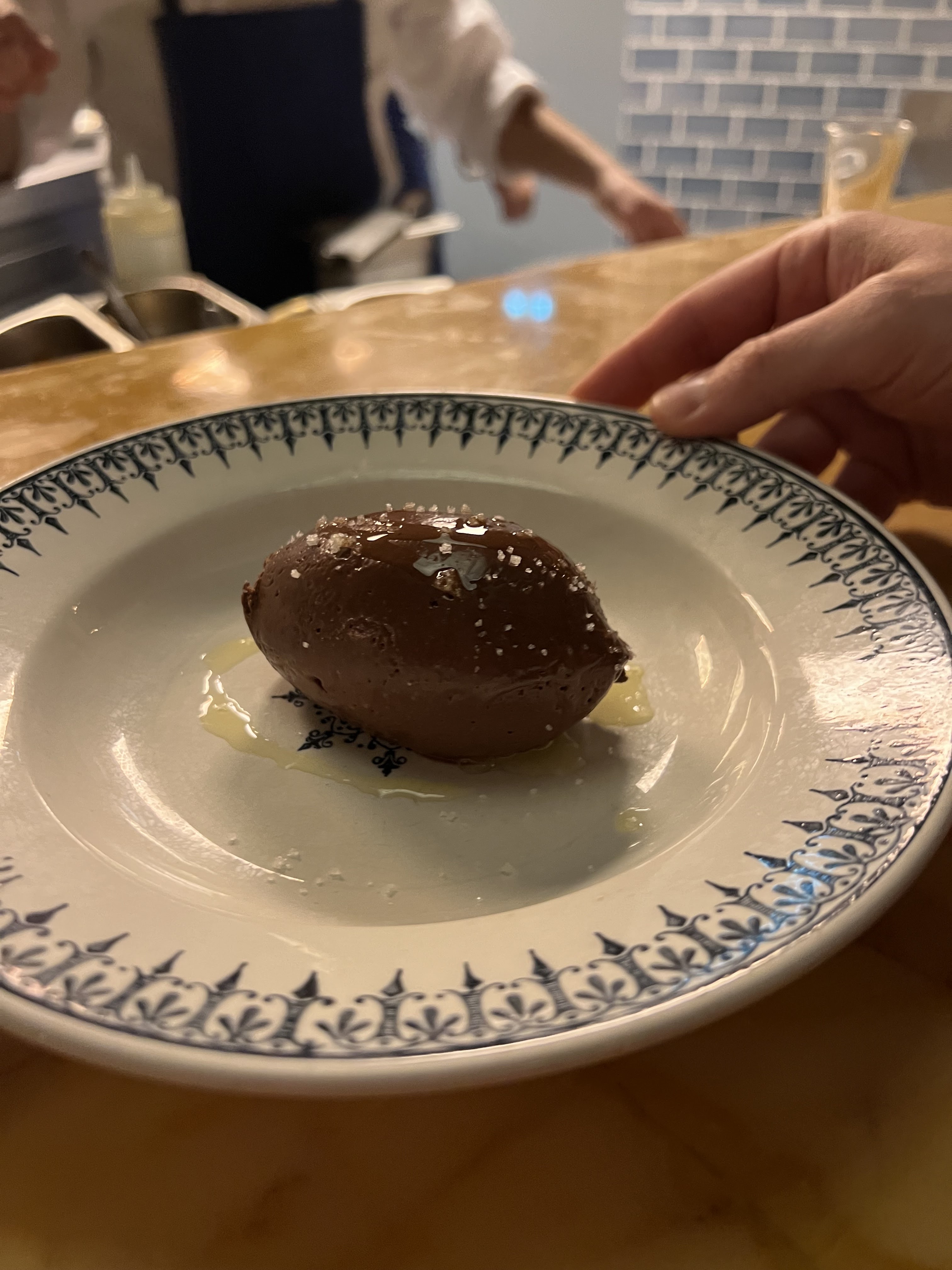 Une des meilleures expériences culinaires que j’ai eues depuis un certain temps. J'ai mangé dans un endroit qui donnait sur la cuisine et tous les chefs étaient serviables et gentils. Ils nous ont également donné quelques choses supplémentaires, ce qui était charmant. Chaque plat était merveilleux. Je recommande vivement le foie de poulet, la mousse au chocolat et le hareng mariné, même si vous ne pouvez vous tromper avec rien de ce menu, je parie. Merci!