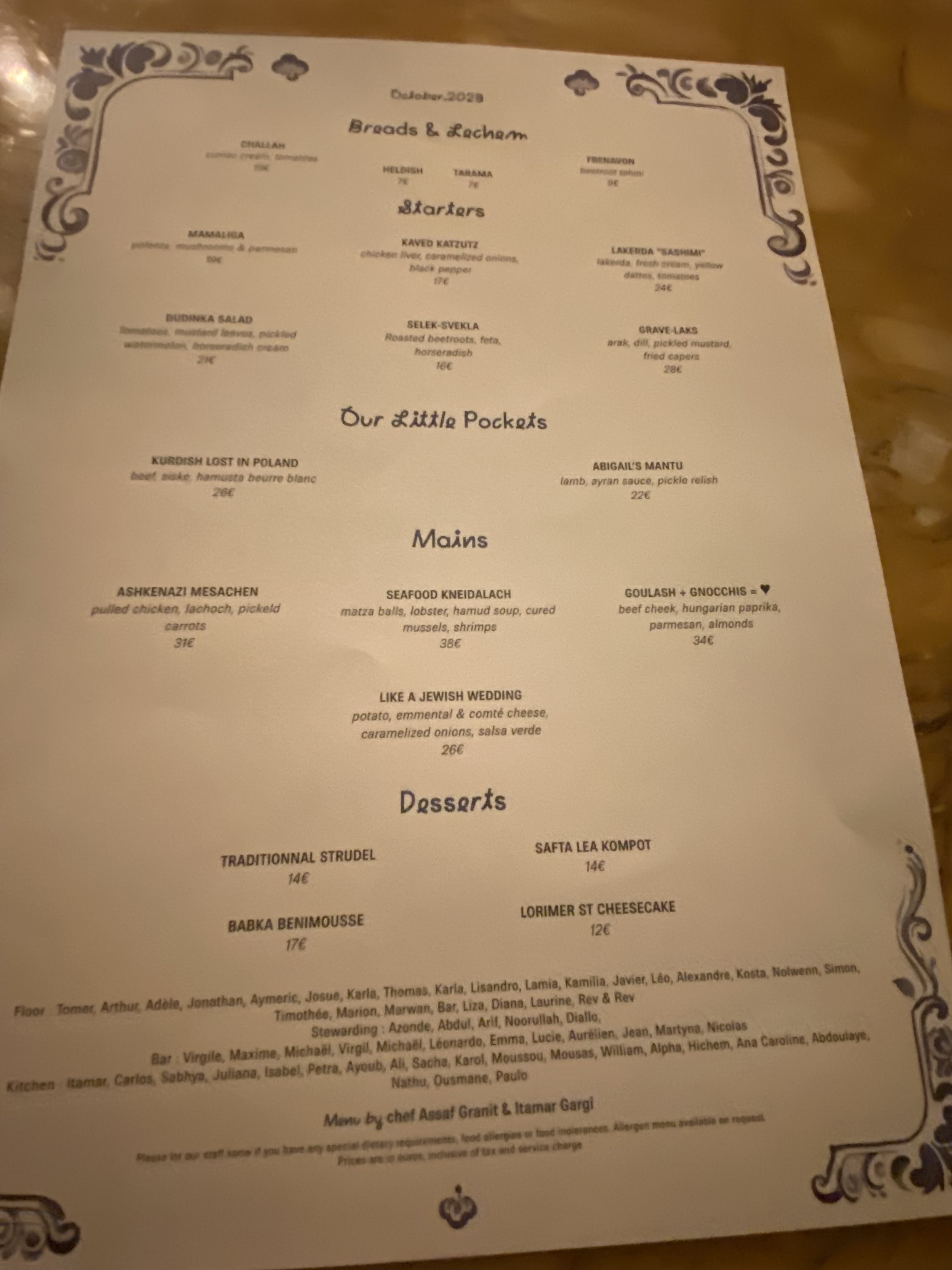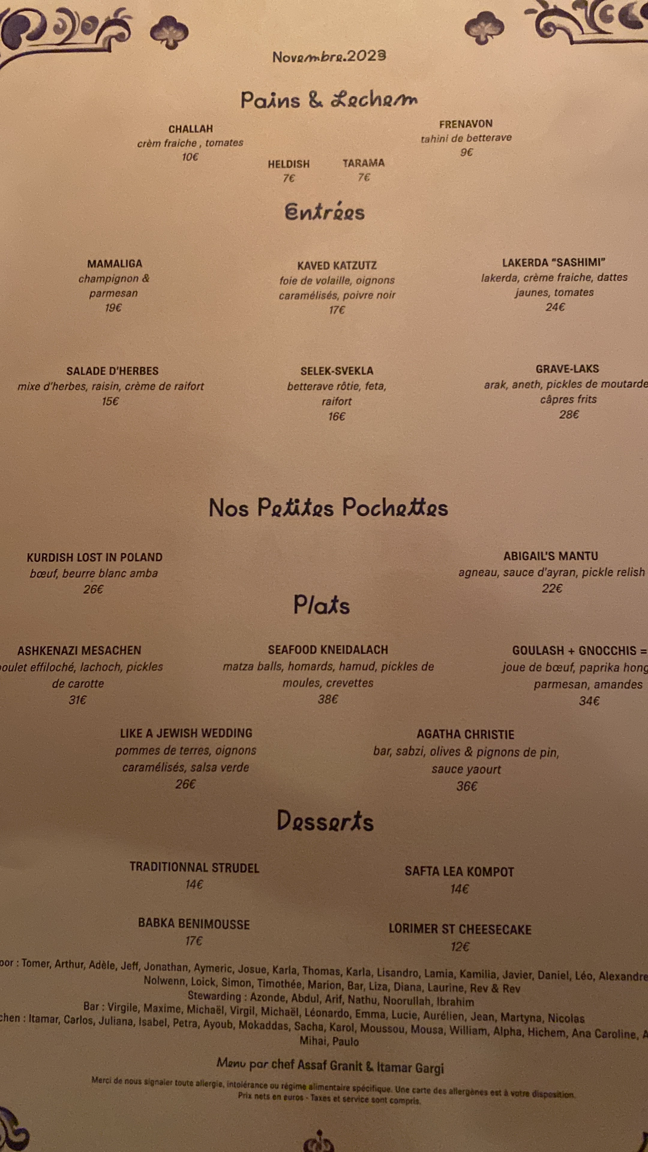 les plats : ASHKENAZE rien à n'avoir, y compris les desserts. les .hallots c'étaient des brioches ...???? bof!!! bof!!! sans compter l'addition bien salée.....Un flop!!!!! En revanche, le décor, la vaisselle, me rappelait bien mes aïeuls..... Le personnel très sympathique, la musique bien trop forte dommage, l'ensemble, décevant.!!!!!
