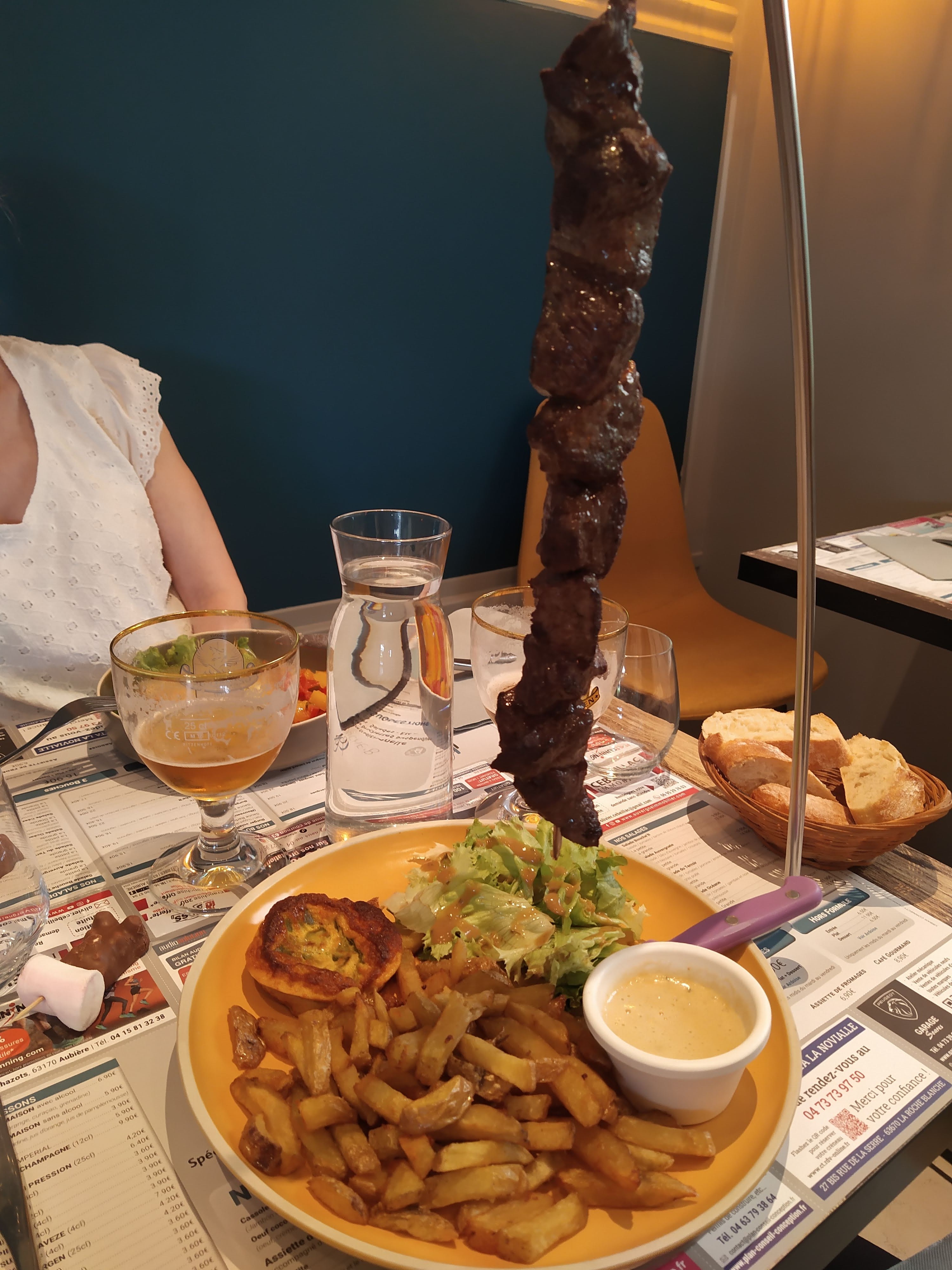 Nous sommes venus manger ce soir (24/09/2020), sur recommandation de la part d’un couple d’amis. Nous sommes arrivés dans un restaurant avec un accueil très agréable, on a pu y manger des brochettes délicieuses. Brochette de bœuf pour moi, très copieuse, viande tendre, cuisson parfaite. Brochette de magret de canard pour monsieur, viande excellente et cuisson top. Frites maison et délicieuses, ce que l’on voit malheureusement de moins en moins en restaurant et également légumes de saisons cuisinés maison également comme expliqué par le patron. En dessert nous avons pris la brioche façon pain perdu qui était également très bonne ! Une très belle découverte, nous y reviendrons avec plaisir pour la qualité du repas mais aussi pour cette bonne humeur et cette sympathie.
