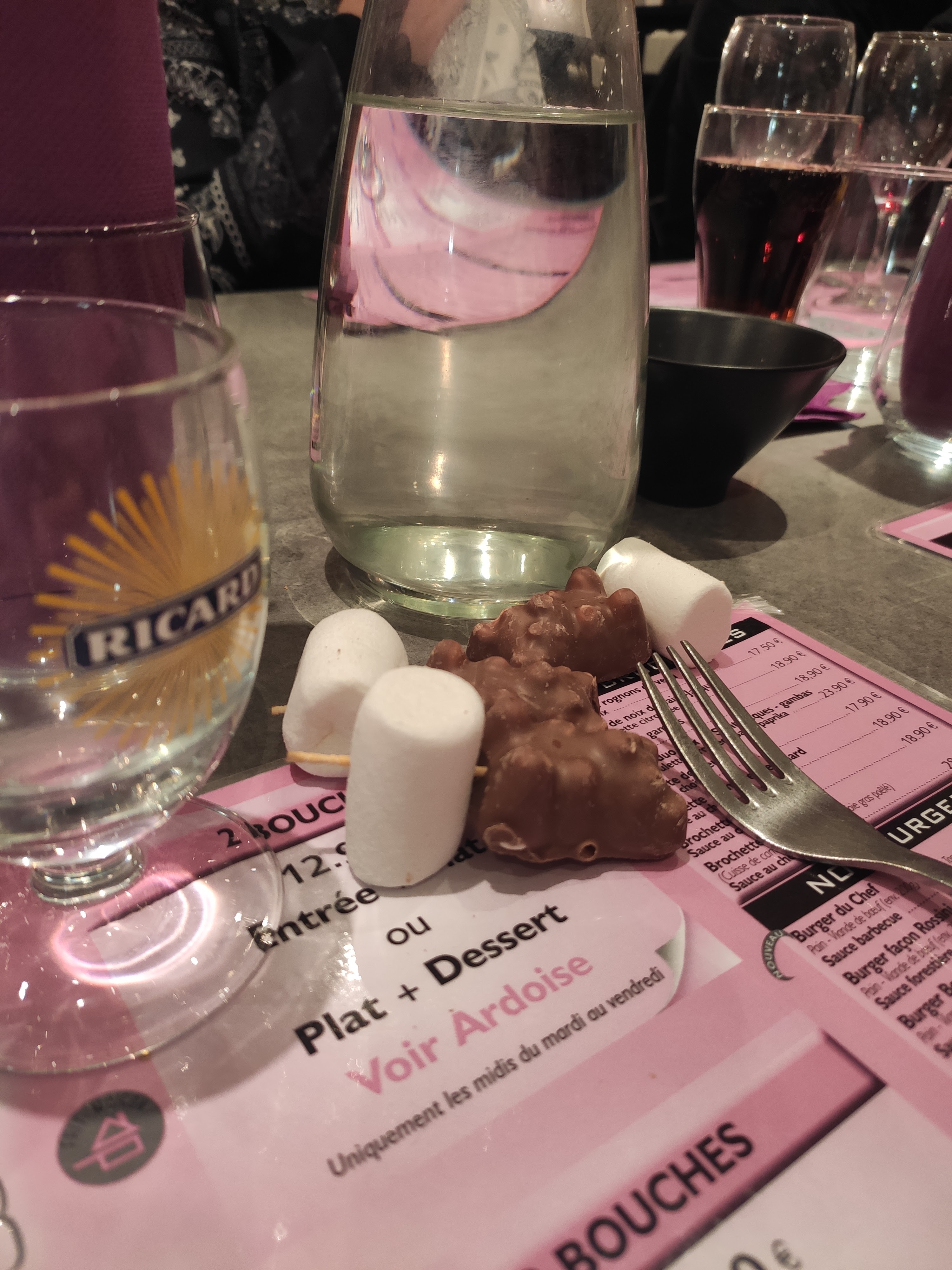 Petite déception sur les cuisses de grenouilles car elles étaient sur une face carbonisées. Ça enlevait tout le goût de la cuisse sinon le reste était bien la brochette suspendue son accompagnement et le dessert