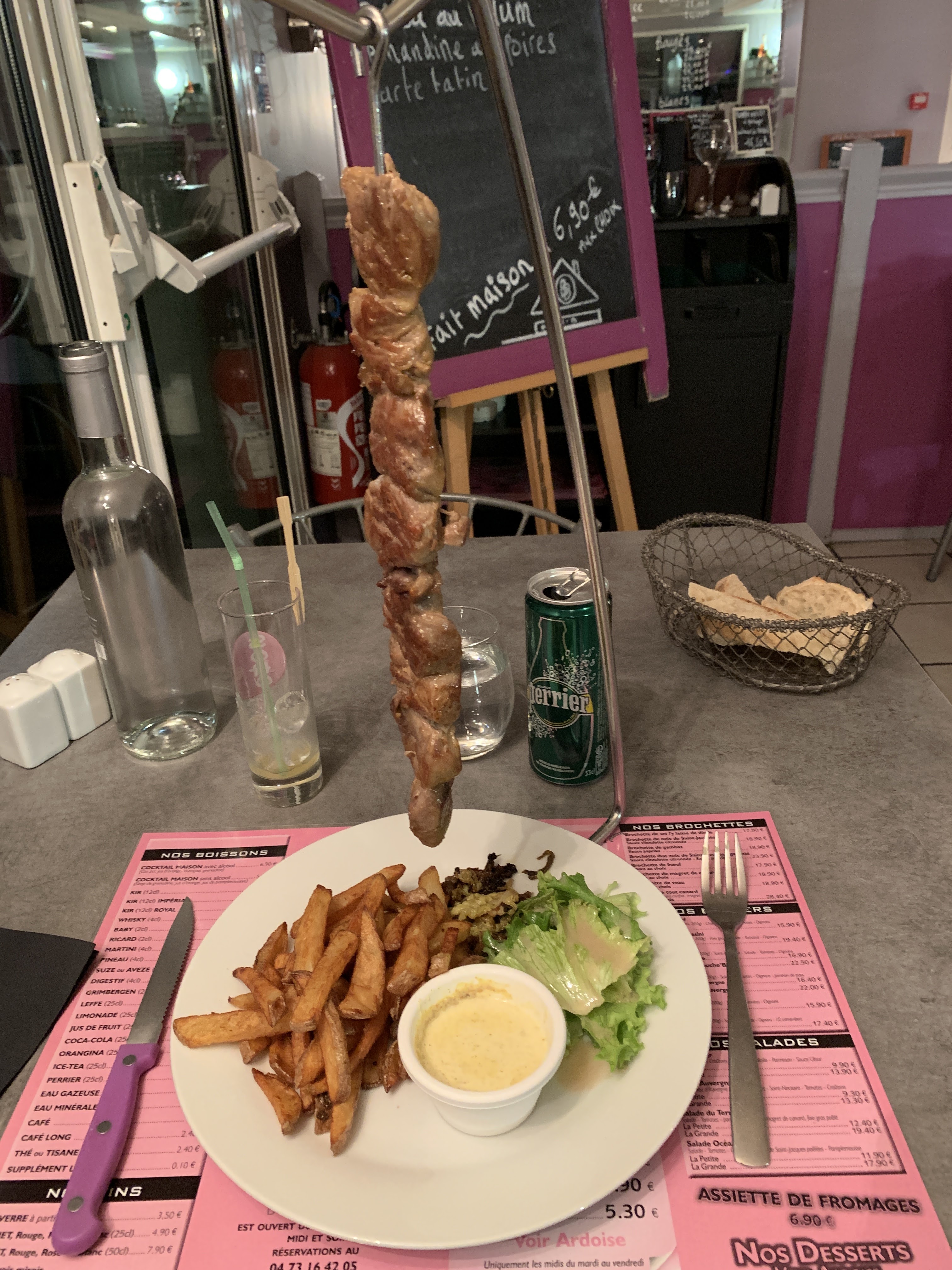 Belle découverte !! C'est le concept brochette suspendue qui nous a attiré et nous n'avons pas été déçu ! Une brochette de bœuf délicieuse, viande très tendre. Pour ma part un hamburger au chèvre très bon, une sauce chèvre moutarde qui change un bleu de l'éternel bleu d'Auvergne. Une mention particulière pour les frites maison qui étaient parfaites. Un personnel sympathique, pas de chichis, une déco sympa bref un très bon moment. Nous y retournerons avec plaisir pour faire découvrir ce lieu à nos ados.