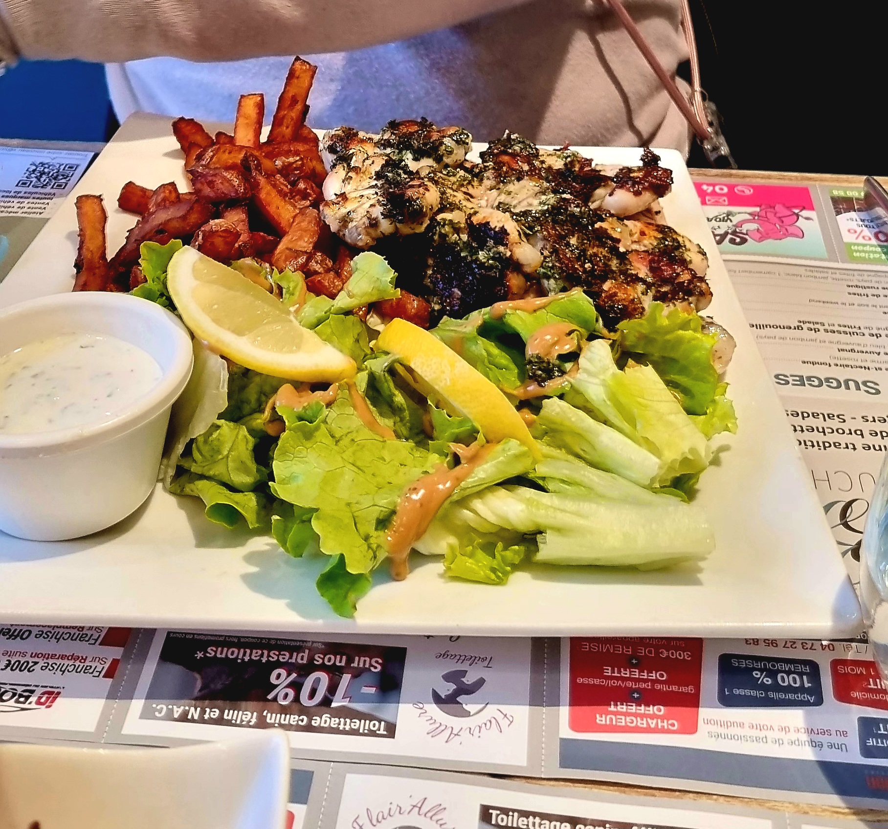 Gambas pateuses. Seule les frites maisons étaient bonnes. Dessert coupe bounty pas très maison. Rapport qualité prix cher.