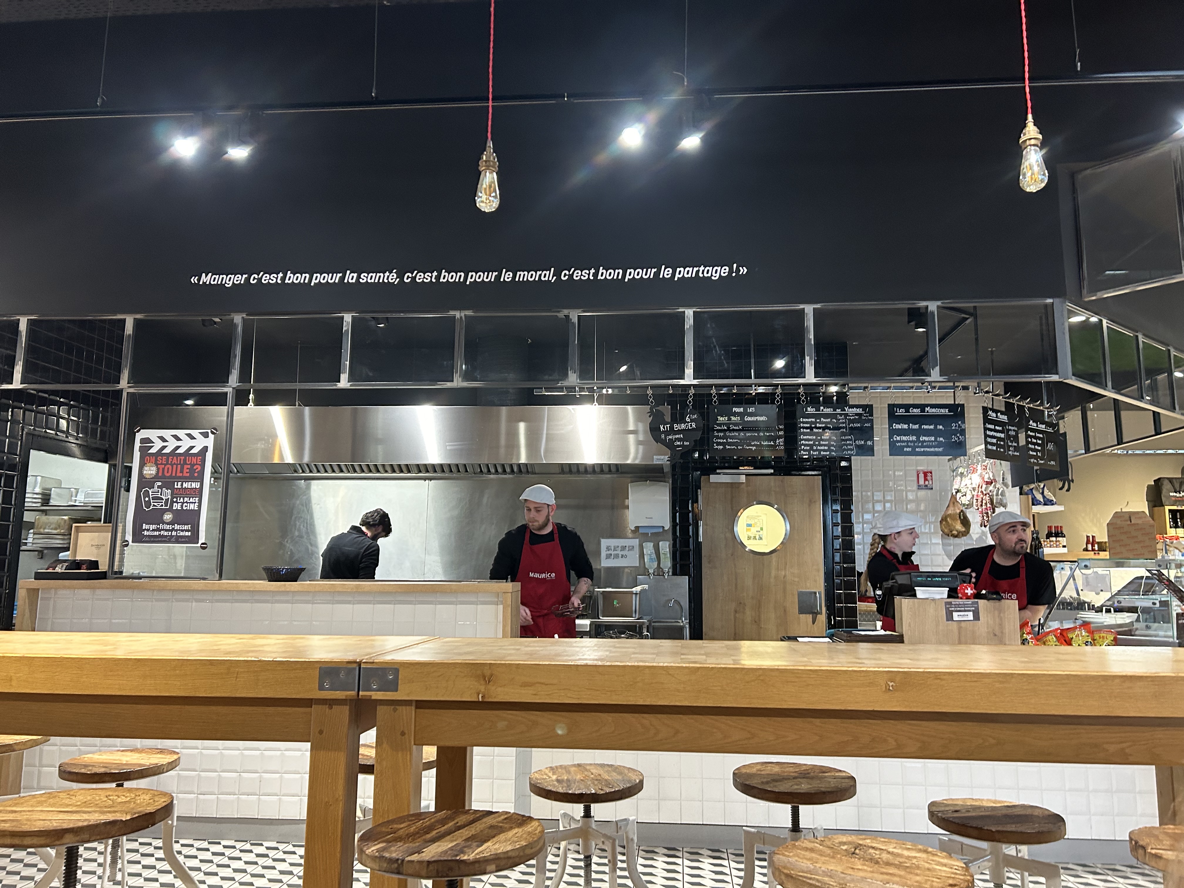Je n'ai testé que la partie restauration, pas le côté magasin mais ça donne envie, surtout les bons poulets rôtis à l'entrée. Je mets la note de 4 car ce sont des bons produits, frais et locaux, par contre, j'aurai apprécié un peu plus de choix et d'originalité quand même au niveau des burgers. Au niveau des desserts le yaourt myrtilles est un pur délice, crémeux à souhaits ! On adore le fait que les sauces soient en libre service avec de tout petits contenants en carton pour éviter le gaspillage... Le personnel est sympathique et le service rapide malgré le monde à midi. Prix vraiment correct vu la qualité et fraîcheur des produits je recommande!