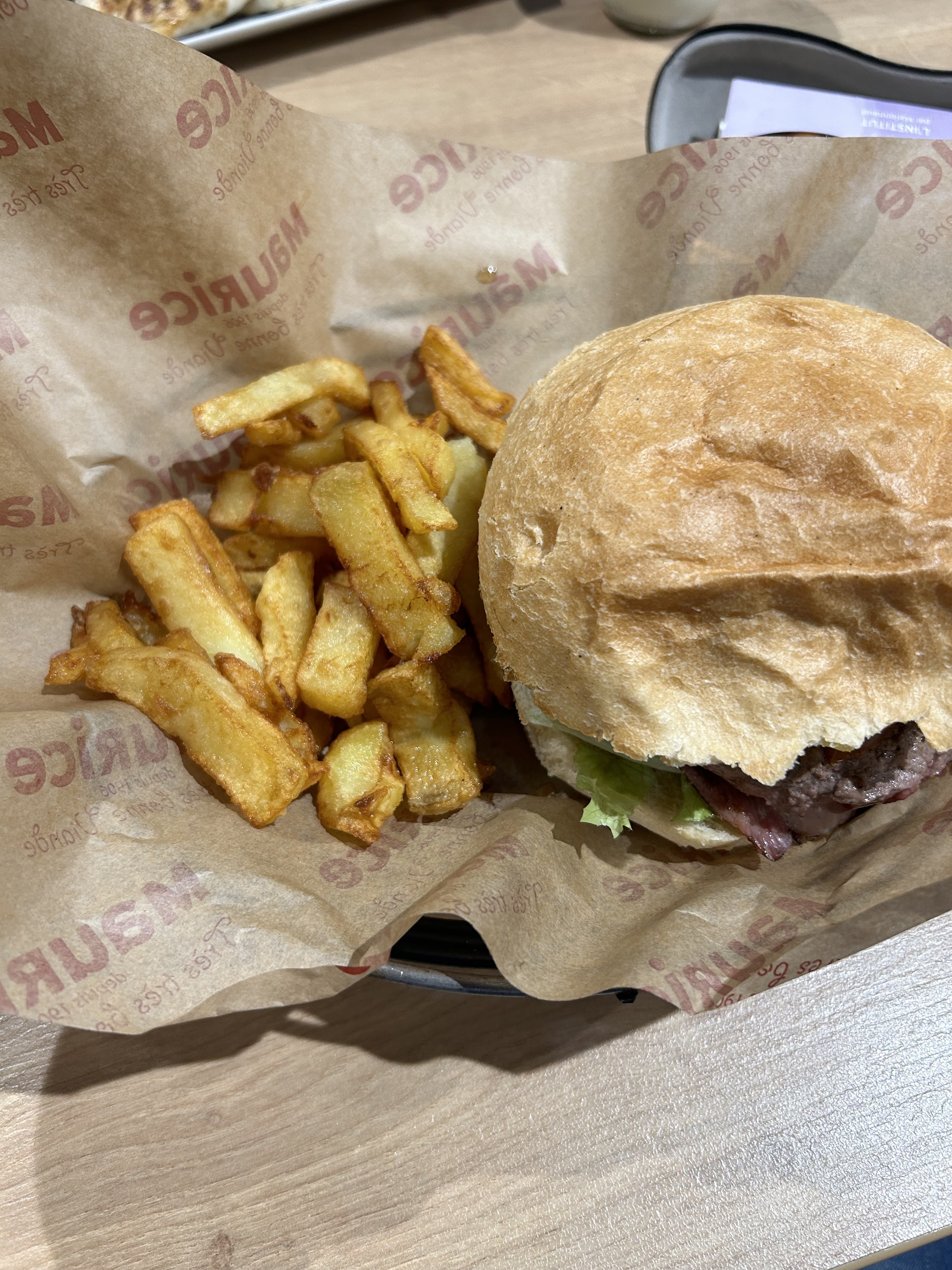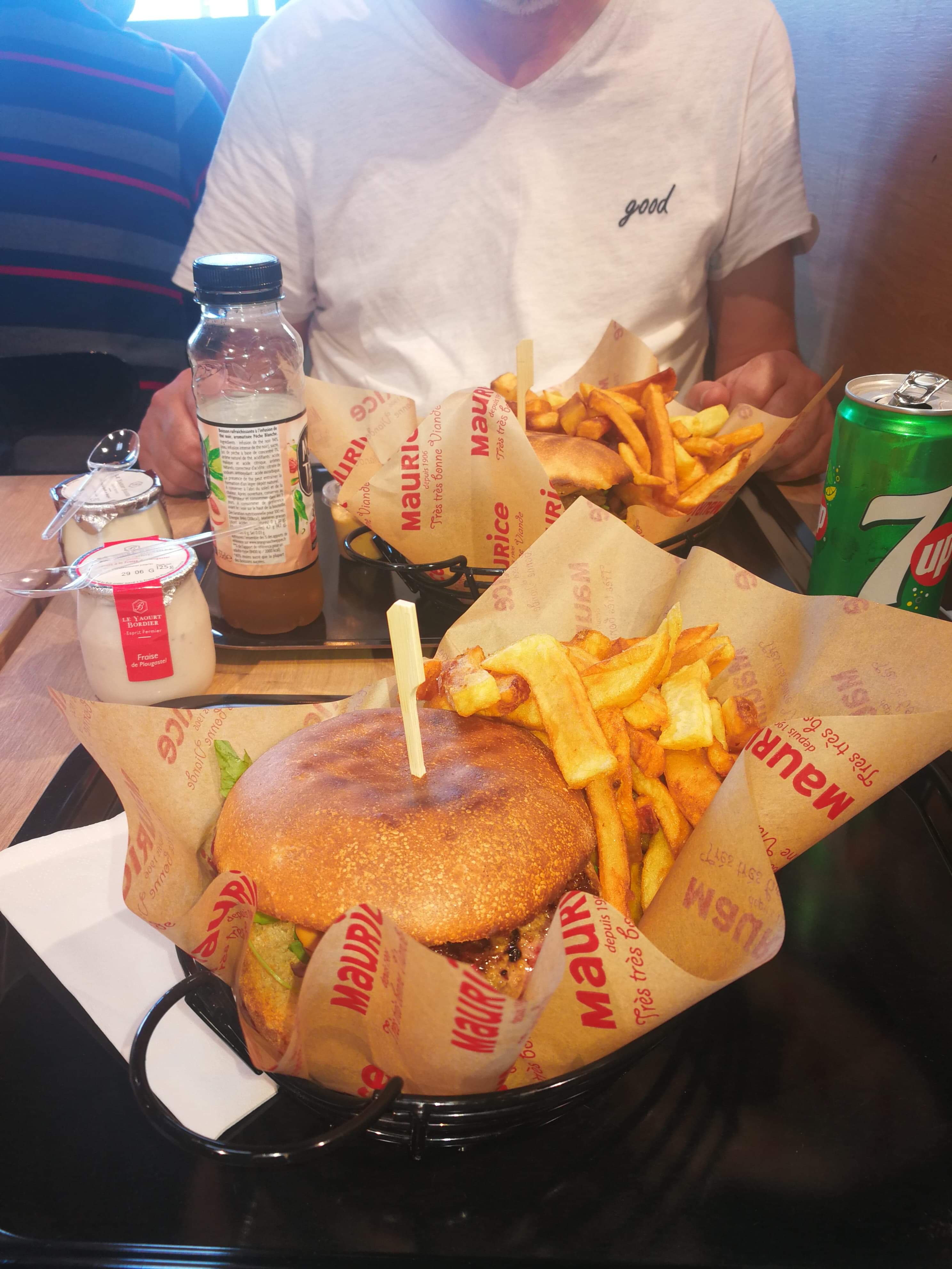 Je suis allée chez Maurice le jour du déconfinement une folle envie d'un burger et là catastrophe l'accueil zéro la personne qui a pris ma commande n'était pas plaisante politesse à revoir je lui pose des questions tout juste si je ne l'ennuie pas! et puis je l'ai vu faire les burgers à la va vite résultats steacks hachés secs pas de gôut de poivre ou sel une feuille de salade avec les bords noircies 1 rondelle d'oignon enfin la moitié pratiquement pas de sauce franchement hyper déçue je m'attendais à mieux et bien voilà maintenant catalogué à partir du moment où l'on paie 11 euros un menu on s'attend à mieux sinon aller chez mc do !