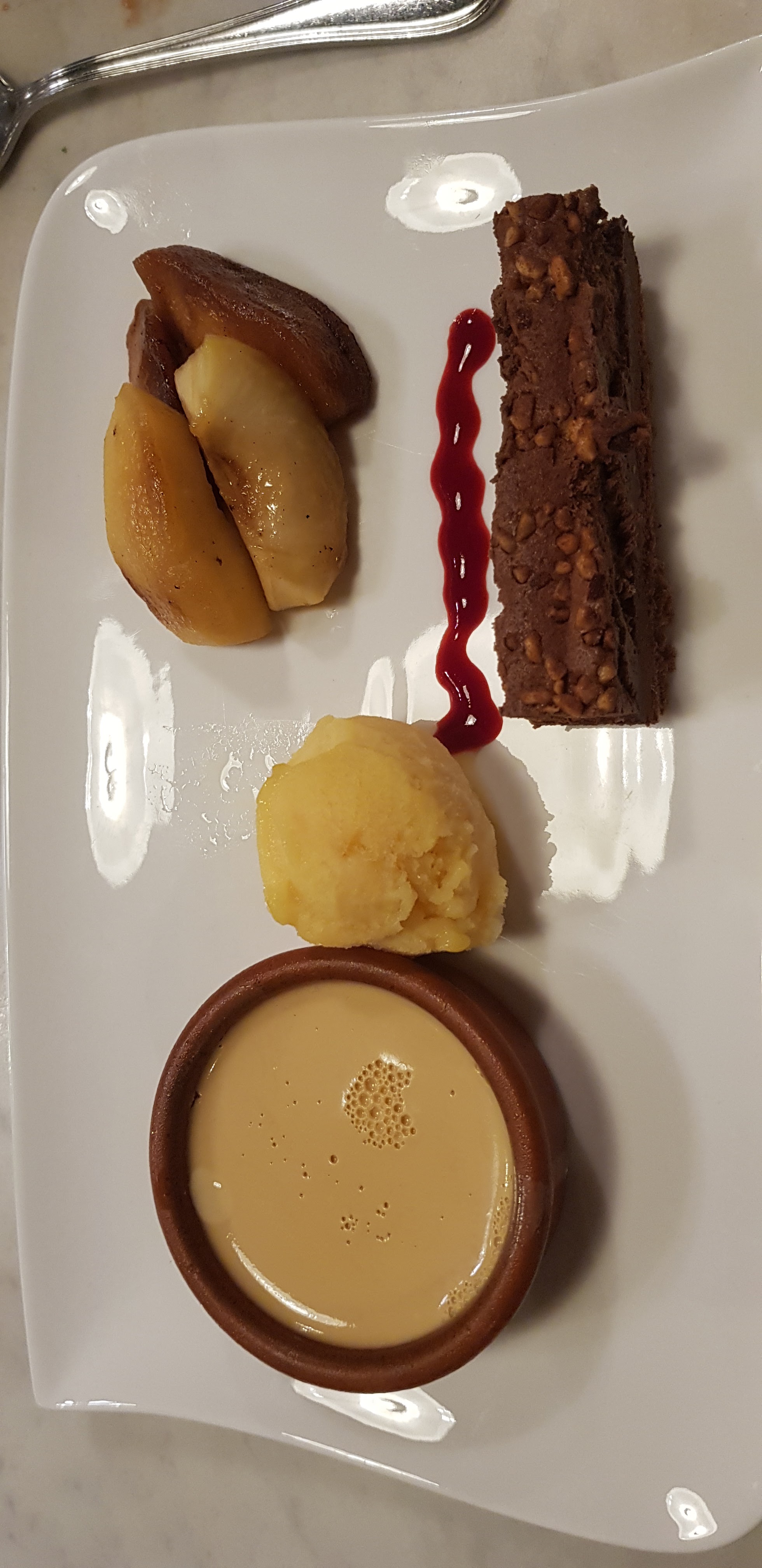 Nous avons mangé un tian d'aubergine à l'agneau, un peu cher pour trois tranches d'aubergine et trois cuillères à soupe d'agneau haché, 19 euros. Il était très bon mais pour le prix, la quantité n'était pas au rdv. Et pour la farandole des desserts à 8euros, pas très originale, une part de tarte raton aux pommes, en sachant que l'on est aux pays des abricots et des pêches 😏,un fondant au chocolat ,une boule de glace vanille et un petit ramequin de fromage blanc avec un coulis de fruit rouge,pas de quoi tombé par terre. Le tout accompagné par 4 verres de vin blanc de pays et 2 expresso pour 78 euros.