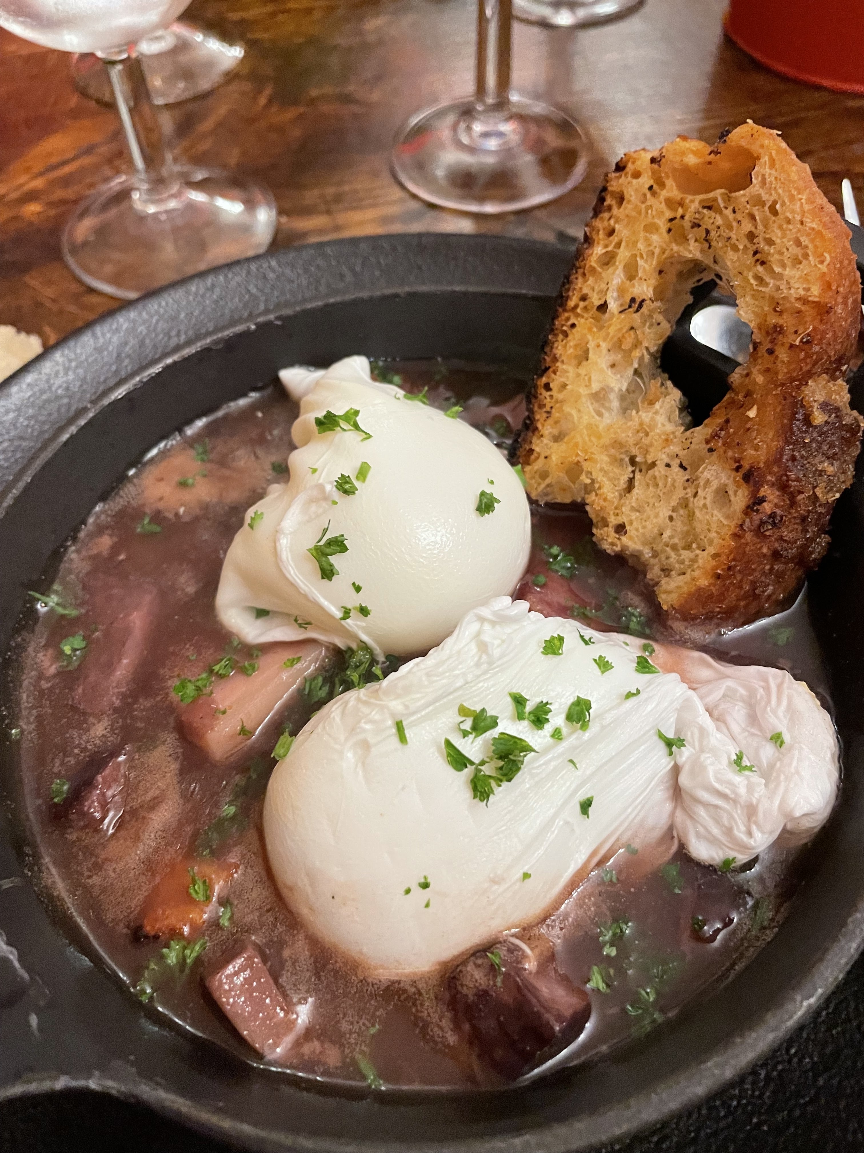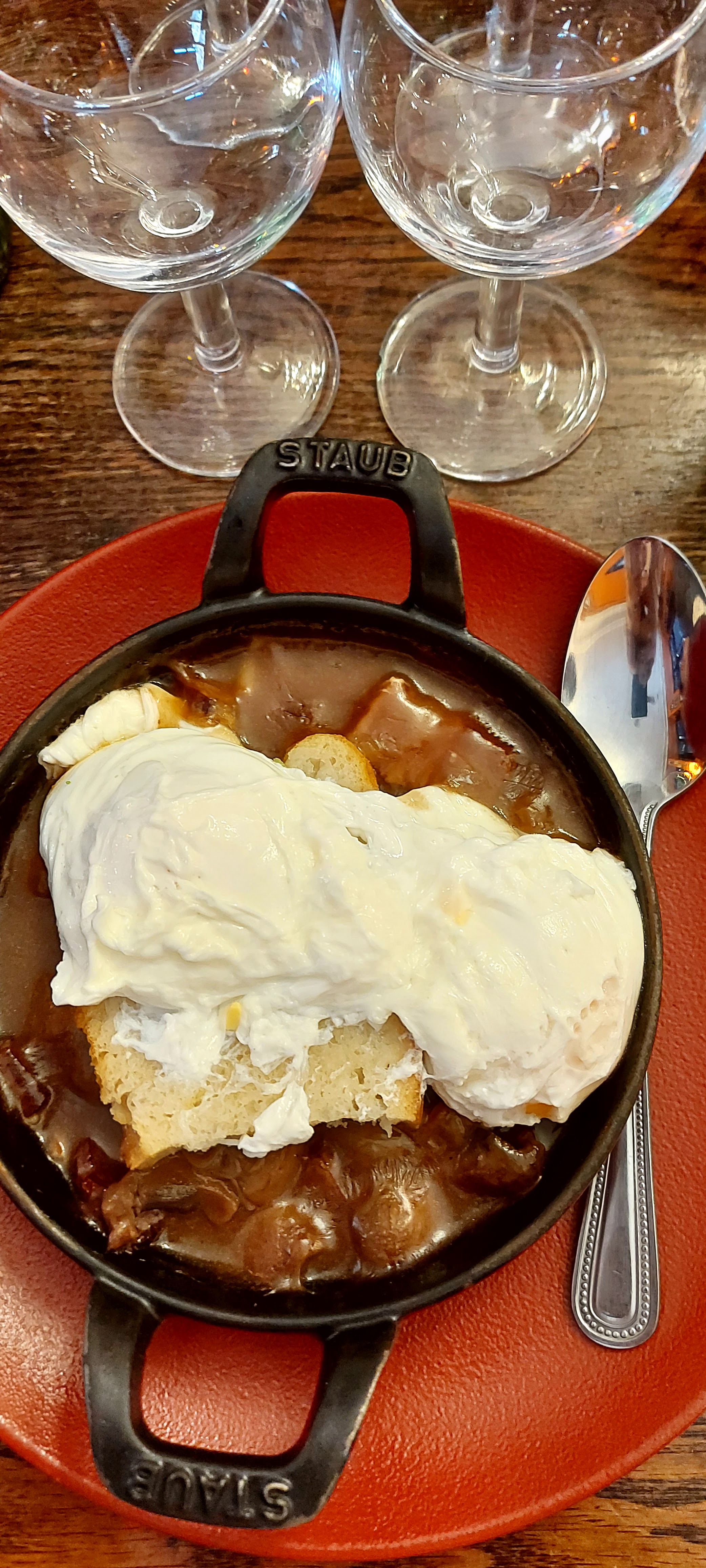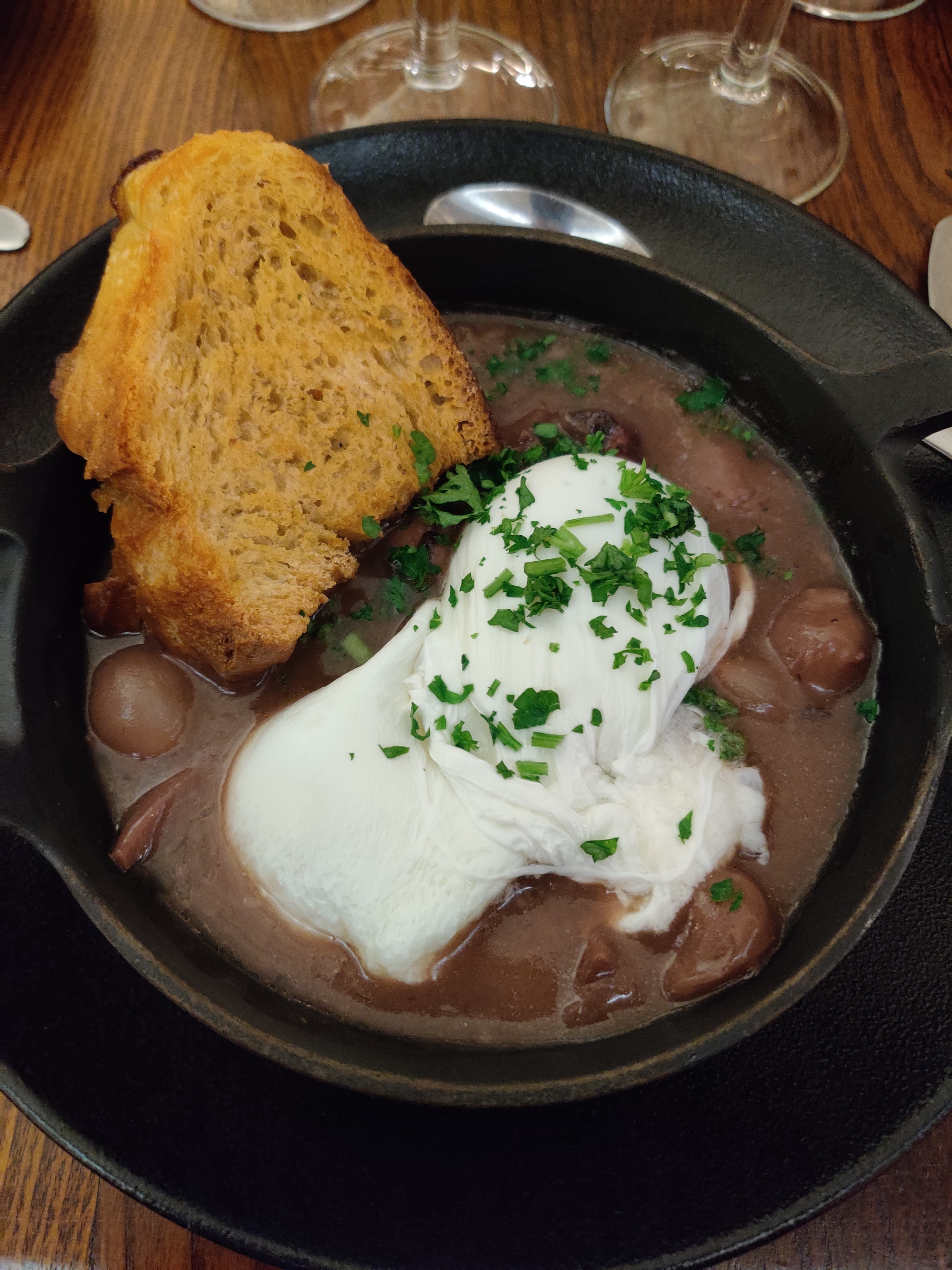 J'ai choisi les oeufs en meurette en entrée qui sont excellents. Nous avons ensuite pris des ravioles très bonnes également. Pour moi le seul bémol est le service du vin au verre. Une qualité très médiocre (un verre de morgon en apéritif puis un croze hermitage pour le repas) et servi dans une température bien trop élevée. Tout autant que le prix également. Pour résumer,un repas de très bonne qualité, un personnel très sympathique, mais un vin (servi au verre ..me concernant) de qualité médiocre pour un prix excessif.