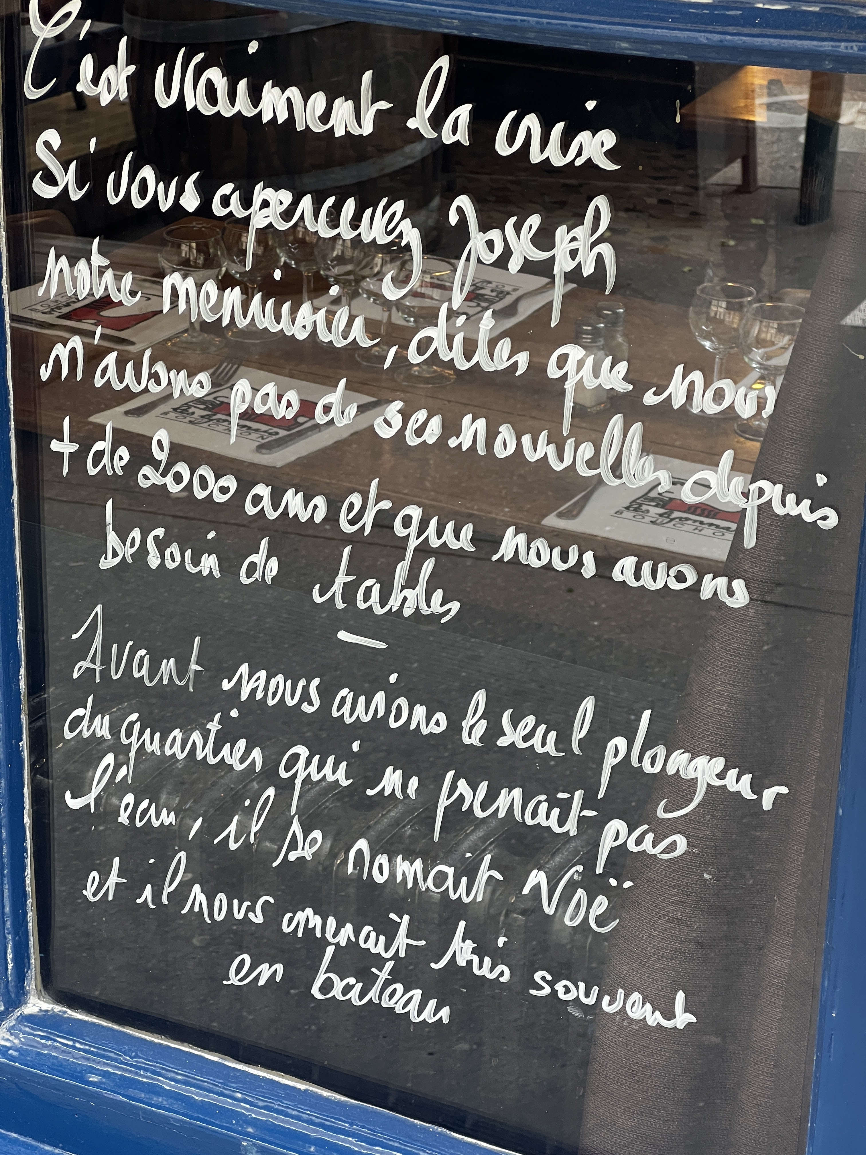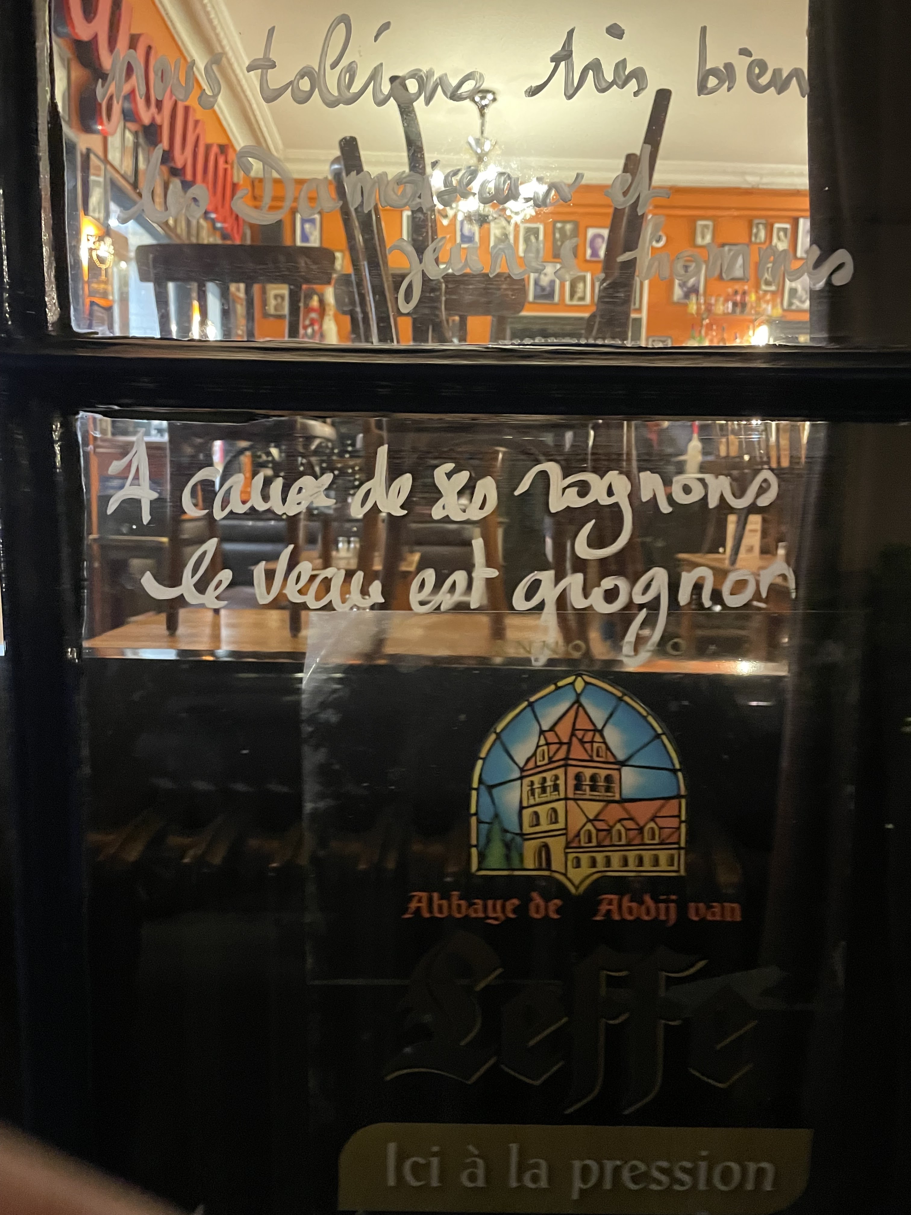 Excellente ambiance créée par le personnel qui déteint sur les clients. Le cadre est sympathique et la lecture des vitrines fait partie de l'expérience. Nous avons pris quenelle, andouillette et gâteau lyonnais, tout était très bon. Je recommande sans modération.