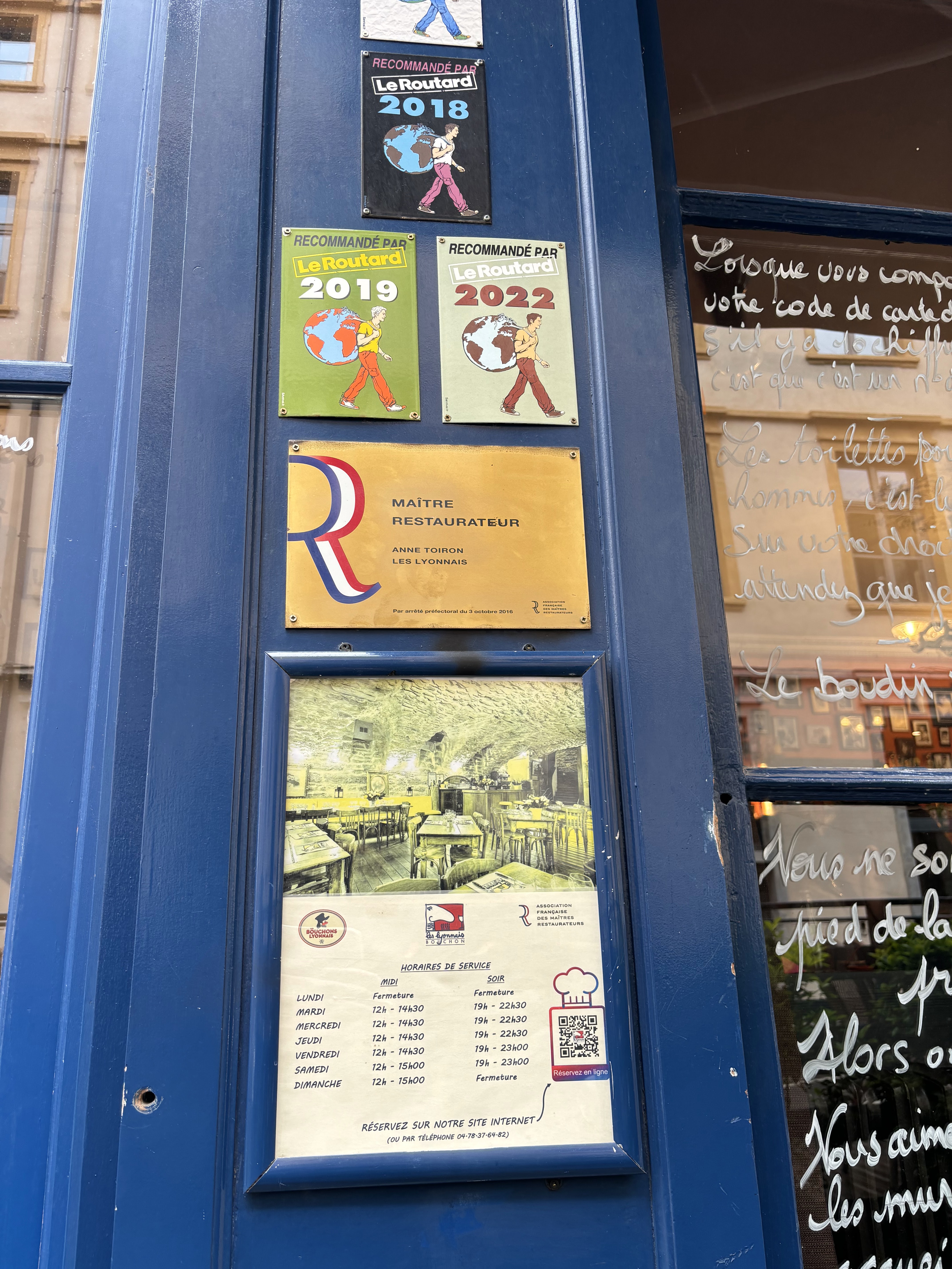De passage à Lyon,je ne regrette pas mon choix sur le restaurant.Un accueil sympa et beaucoup d'humour, un lieux typique du bouchon lyonnais. Les serveurs sont agréables et souriants.Quand aux plats ils sont trop trop bon.....Je recommande les yeux fermés 😉