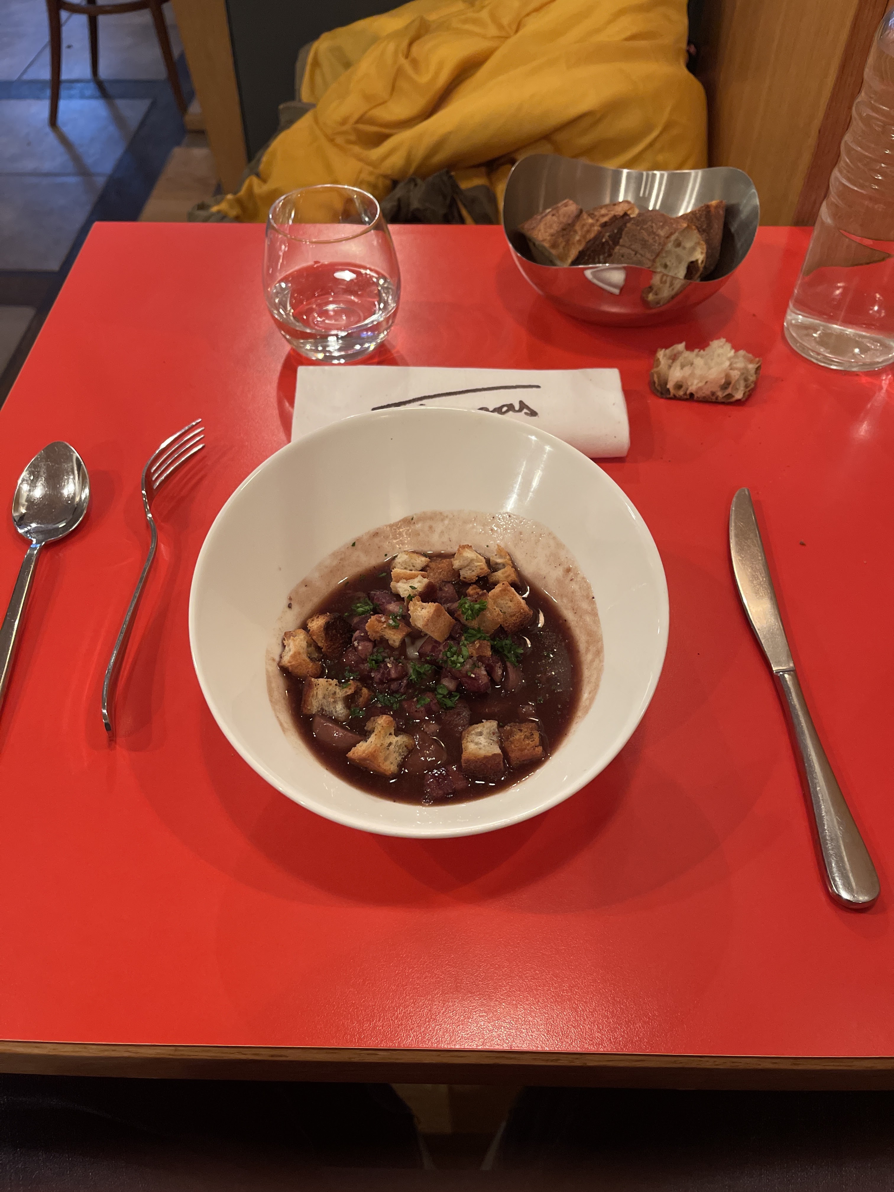 Nous venons de passer deux semaines à manger et à boire à travers Paris, Lyon et la Provence et c'était sans conteste le meilleur repas de notre voyage. Nous sommes arrivés un lundi soir sans réservation, mais ils ont réussi à nous accueillir avec seulement 30 minutes d'attente et nous avons pris un verre au café Thomas voisin pendant que nous attendions. Des entrées aux plats en passant par les desserts, tout ce que nous avions était incroyable et le personnel était très gentil. Je recommande vivement la salade d'entrée, le plat de poisson (je pense que c'était Pollock ?), le plat de bœuf et le gâteau au chocolat Lava. Nous avons également essayé notre vin préféré du voyage ici, le Domaine de Pieblanc. Nous avons fini par nous rendre à la cave plus tard dans le voyage pour acheter des bouteilles et avons découvert que le chef Thomas et les propriétaires de la cave sont des frères et une famille talentueuse ! Je vous recommande vivement de manger ici si vous êtes à Lyon !