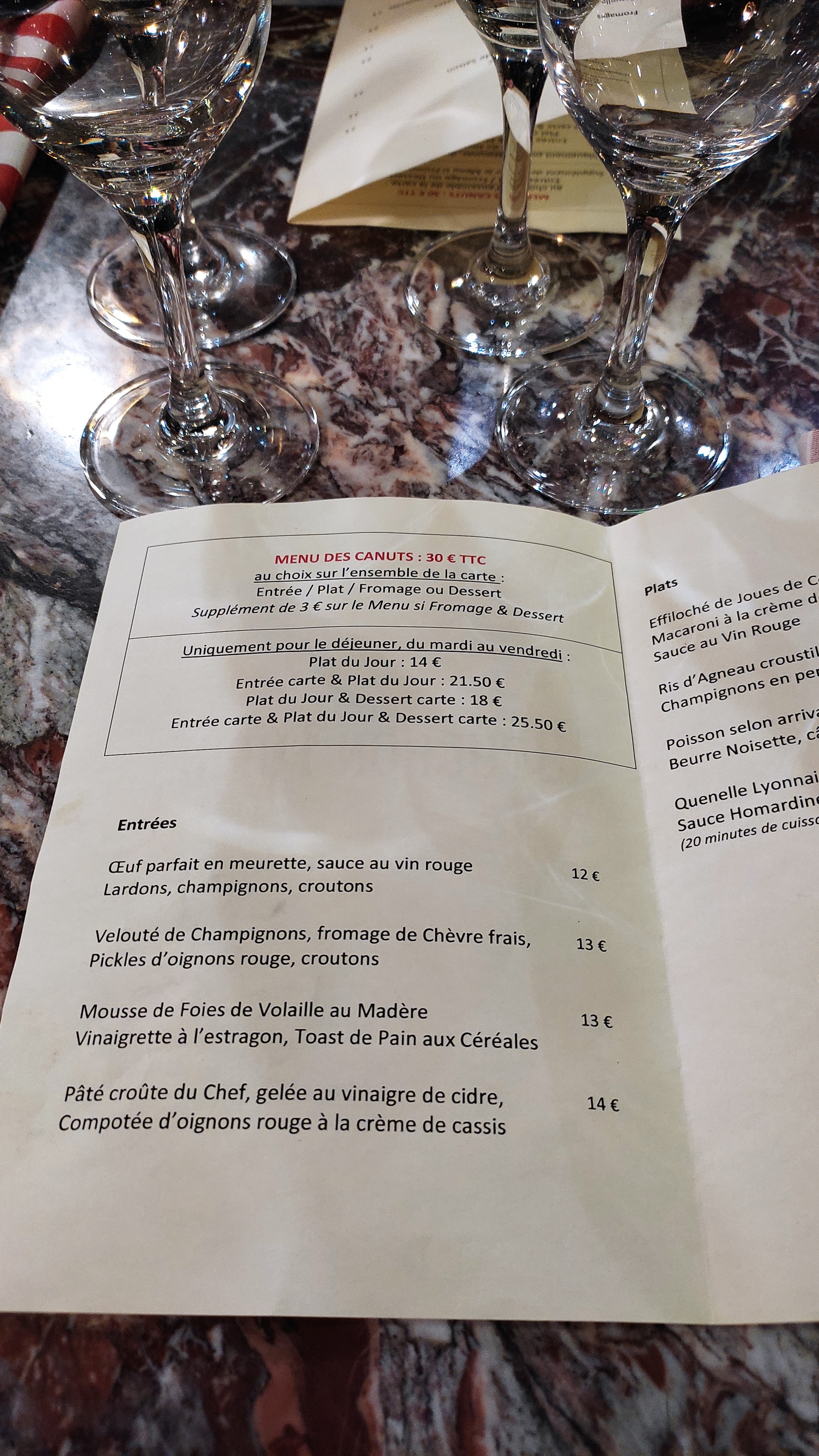 Excellent Pour notre premier bouchon lyonnais nous avons pris le menu des Canuts à 25.50€ avec 3 plats Accueil chaleureux et respectueux des mesures barrières et plats raffinés A refaire