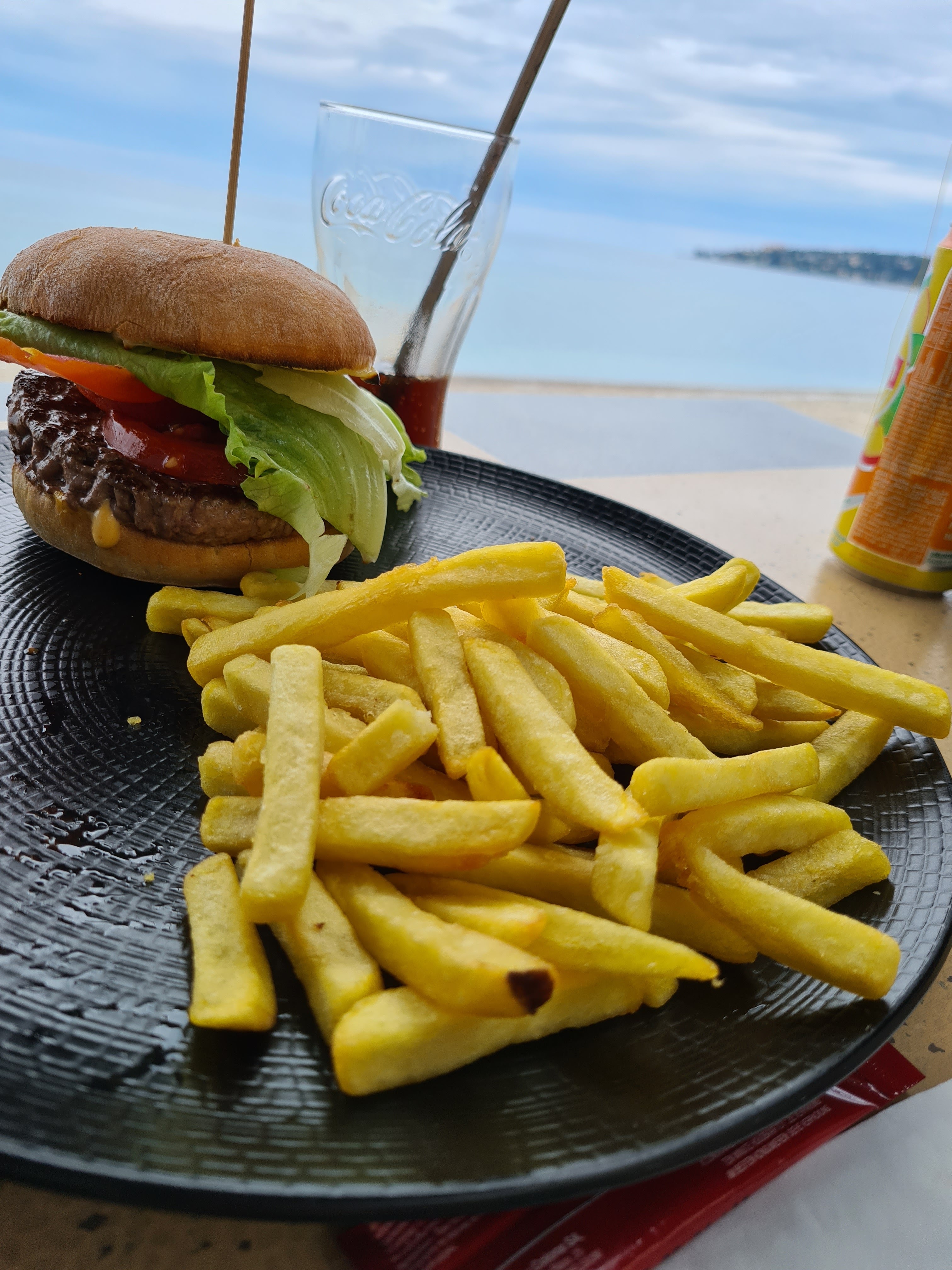 3 étoiles pour l'emplacement magnifique, en plein bord de mer, qui vaut à lui seul de manger ici. Pour le reste si les burgers sont effectivement plutôt pas mal, la portion de frites associée reste un peu légère vu le prix. Et si le menu à 13€50 n'est vraiment pas cher pour profiter à faible coup de l'emplacement, il est par contre franchement ridicule : ce que j'avais dans mon assiette était tellement infime que je pense qu'il m'aurait fallu 3 fois ça pour faire un plat entier. Idem pour le dessert : imaginez une portion normale et divisez-la par trois pour savoir ce que vous aurez. C'était vraiment exagéré, à tel point que cela me sert aujourd'hui d'anecdote pour faire rire quand j'en parle autour de moi. Par contre le Spritz à 8€ était plutôt correct au regard de ce que je vois ailleurs. Bref pour l'emplacement et les hamburgers c'est ok, mais pour le menu faut vraiment oublier, ou alors seulement dans l'idée de profiter de la vue à faible prix.