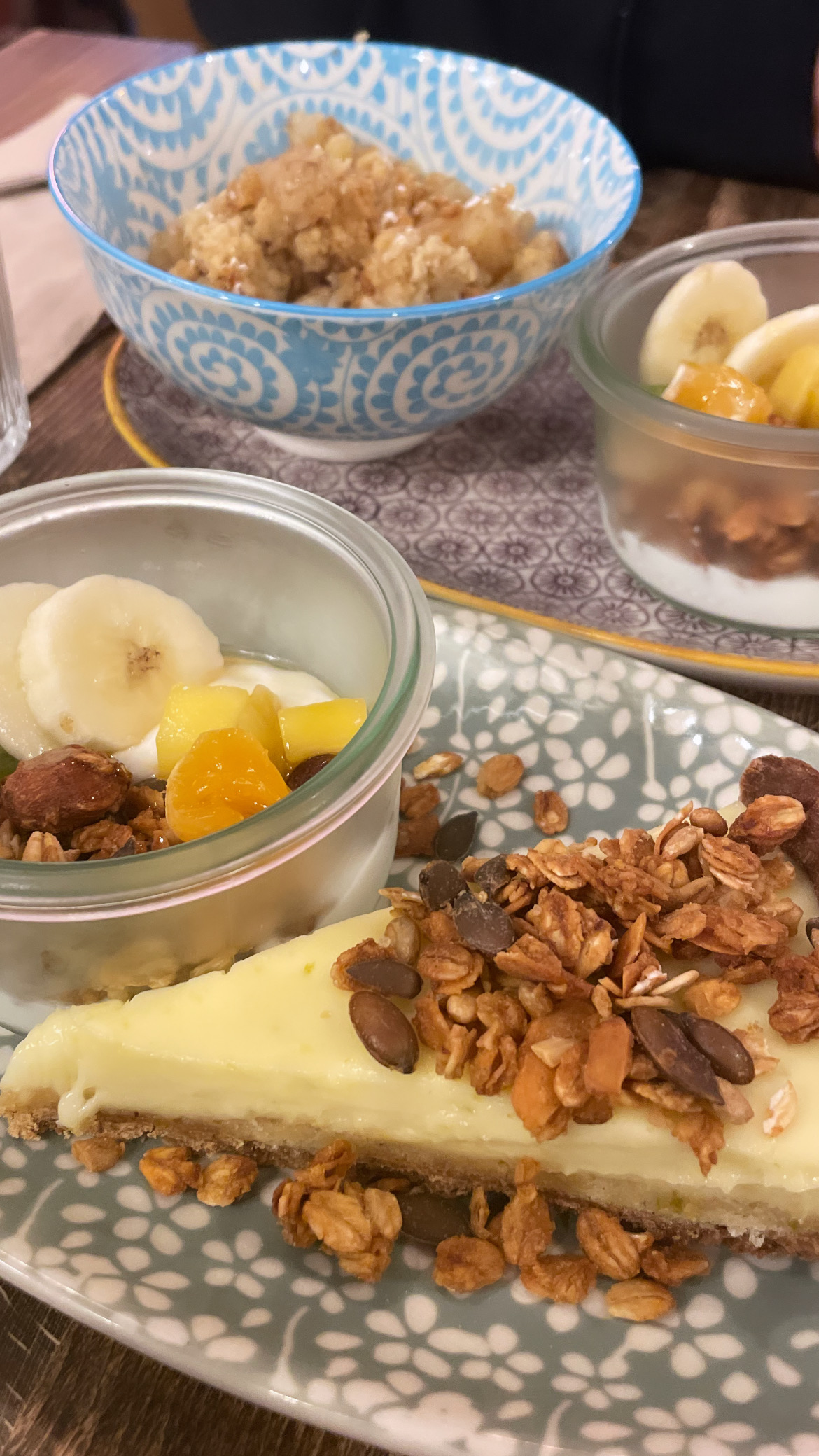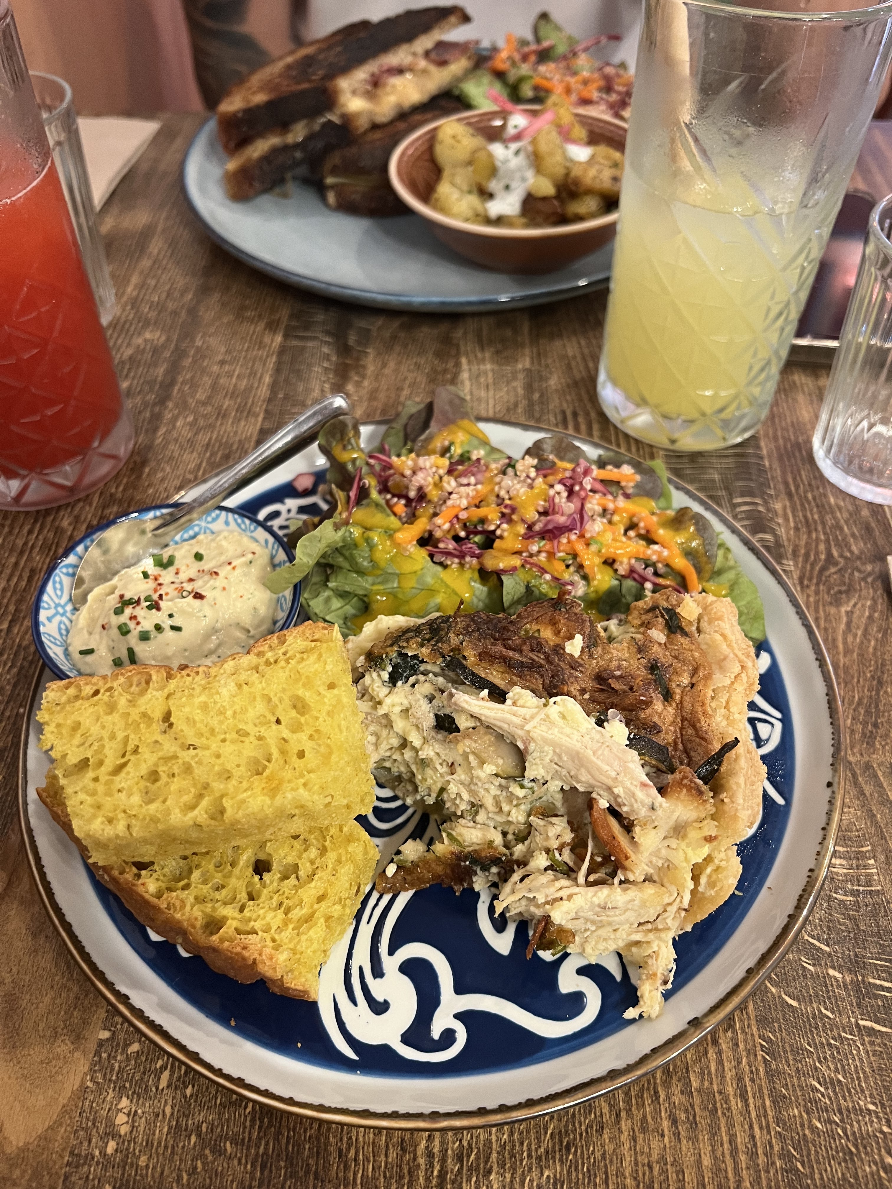 Un brunch incroyable. Au menu un plat salé, un granola avec une pâtisserie, un jus (le thé glacé était délicieux ), un grand choix de thés... Les commerçants du coin étaient jaloux de nous savoir aller au brunch Courez-y!