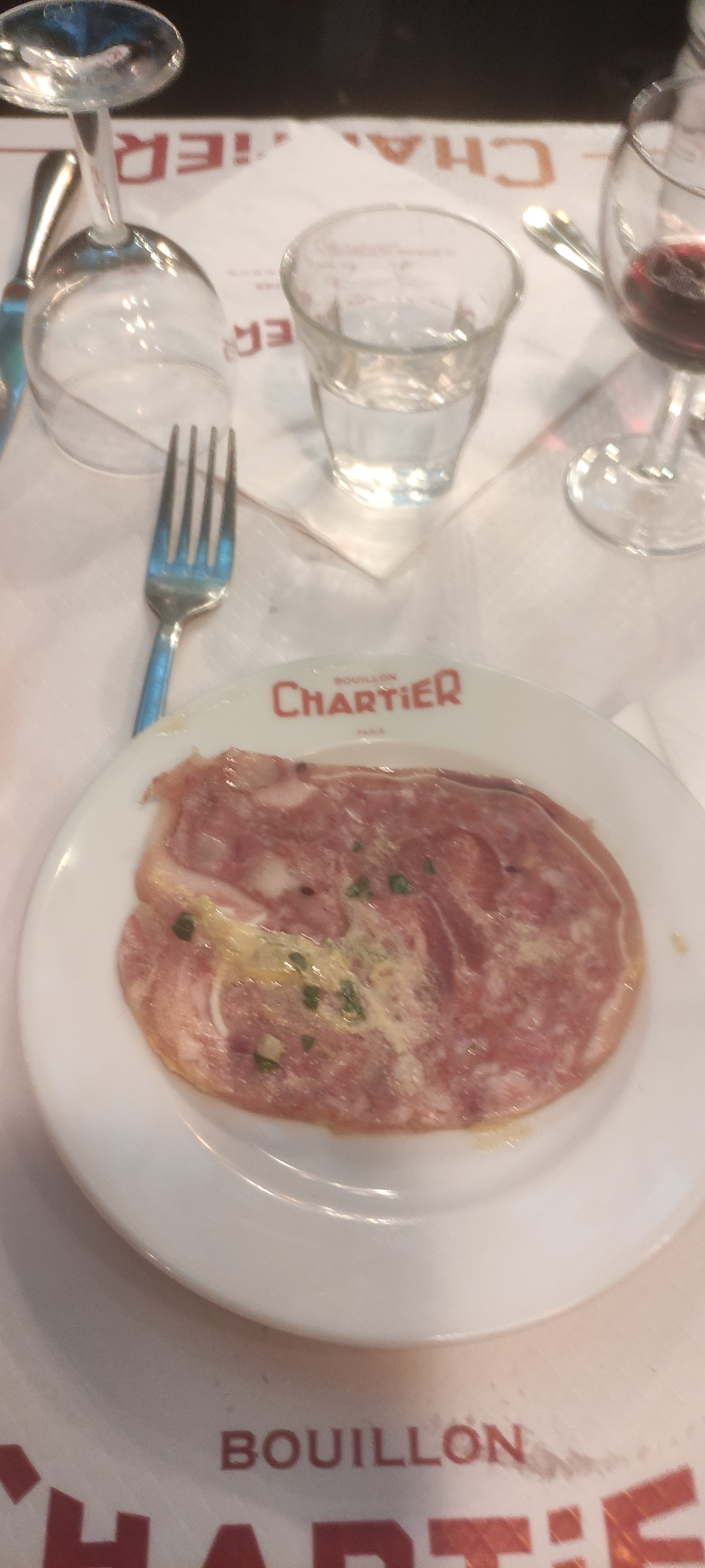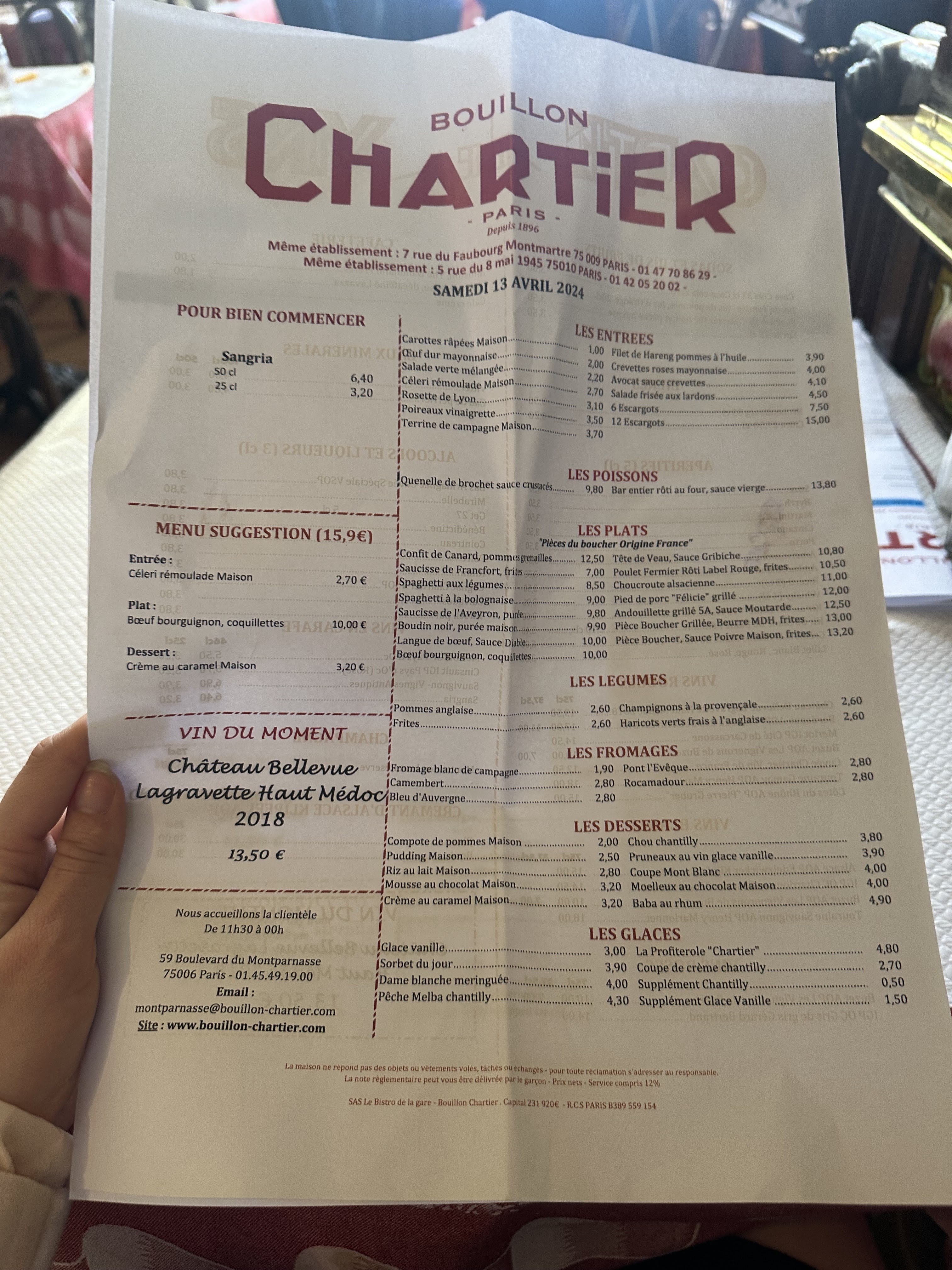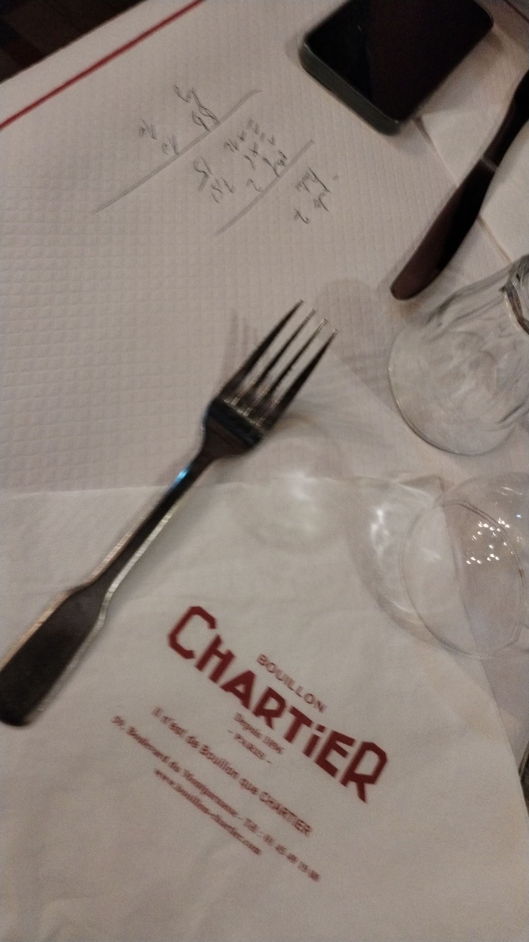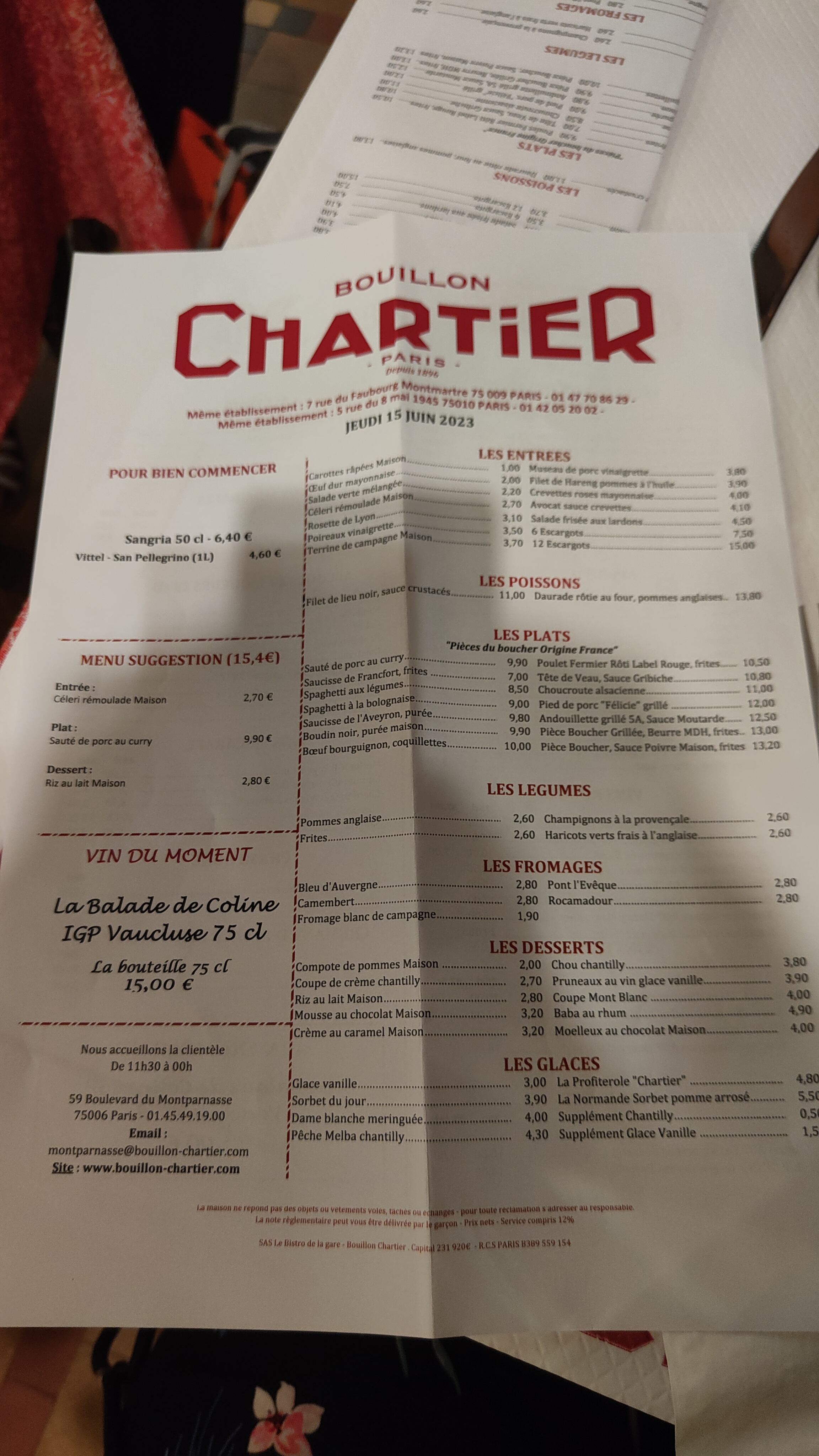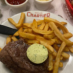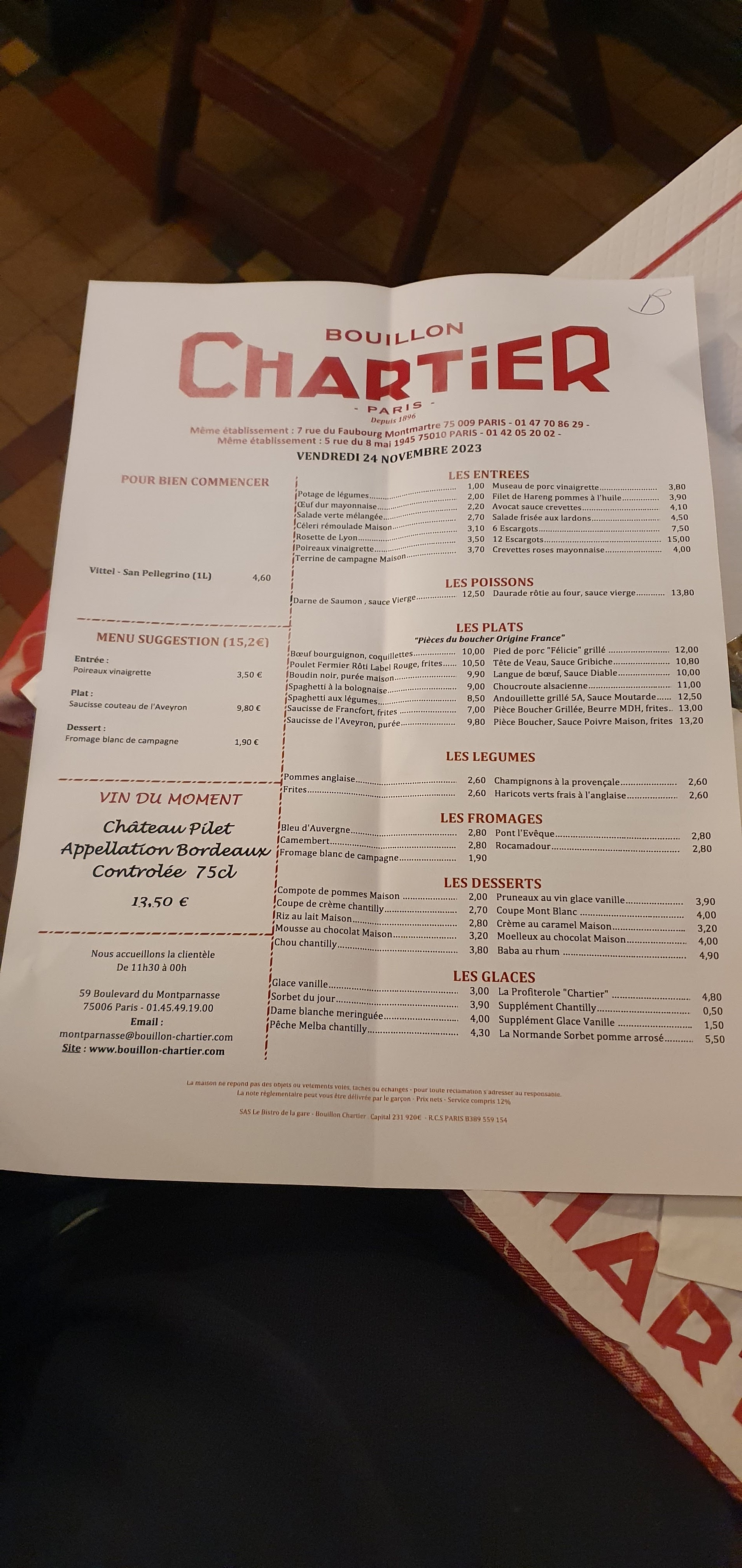 Nous sommes vers 18h30 et nous avons été installé rapidement, a notre sortie vers 20h, il y avait une longue file d'attente. Nous avons pris en entrée les escargots et la terrine de campagne. En plat la pièce du boucher au beurre avec ses frites (pas grasses du tout) et le boeuf bourguignon coquillettes. En dessert la mousse au chocolat et la profiterole Chartier. La première que l'on m'a servie, le choux était sec et j'ai fait signe a la serveuse qui me l'a changé très gentiment et là elle était excellente En somme, un repas avec un très bon rapport qualité prix (environ 20-25€ par personne entrée, plat dessert) avec des produits de qualités, un cadre magnifique et un service au top Petit plus, il note votre commande sur la nappe ☺️ et il y a des verres comme à la cantine