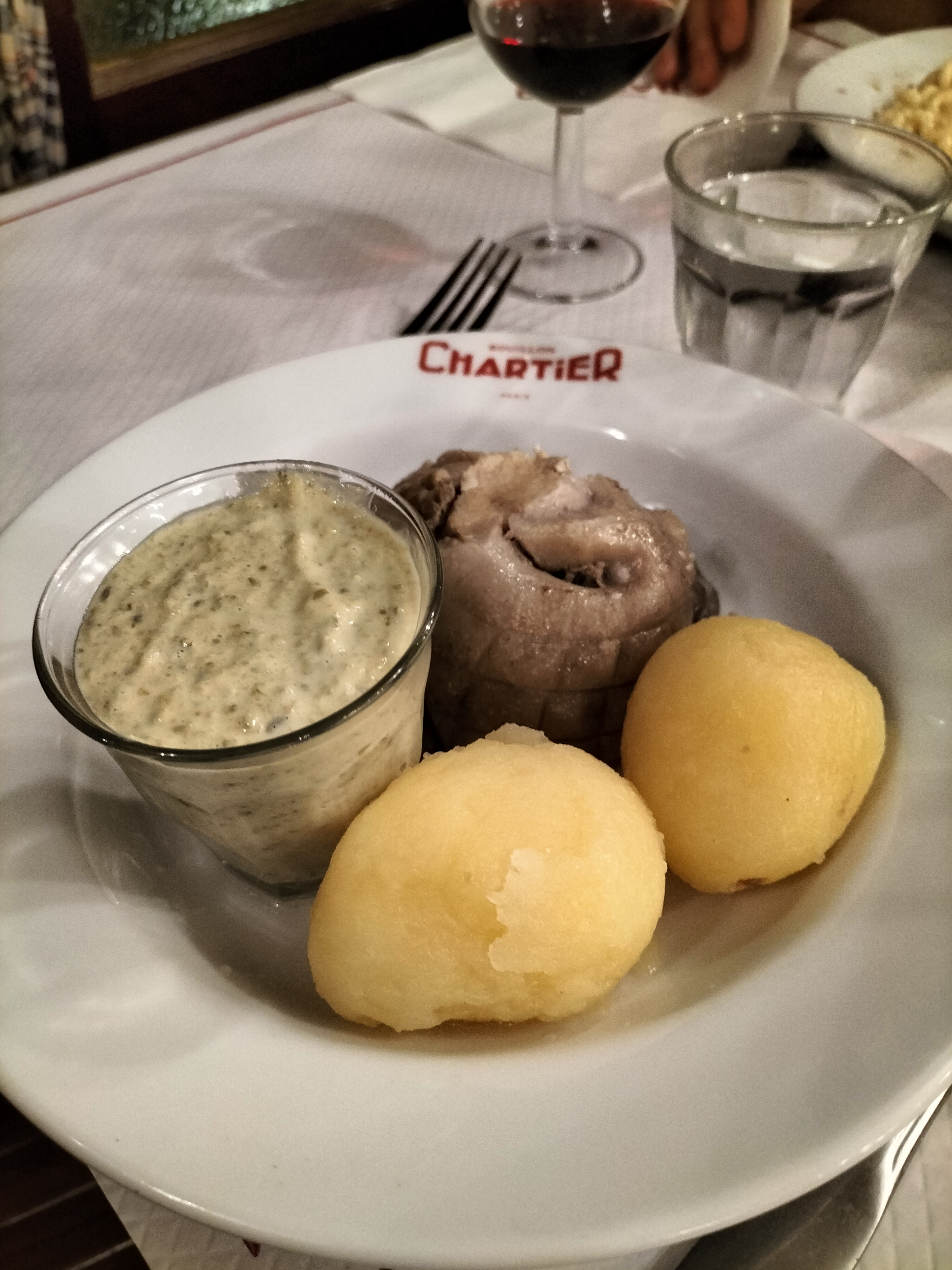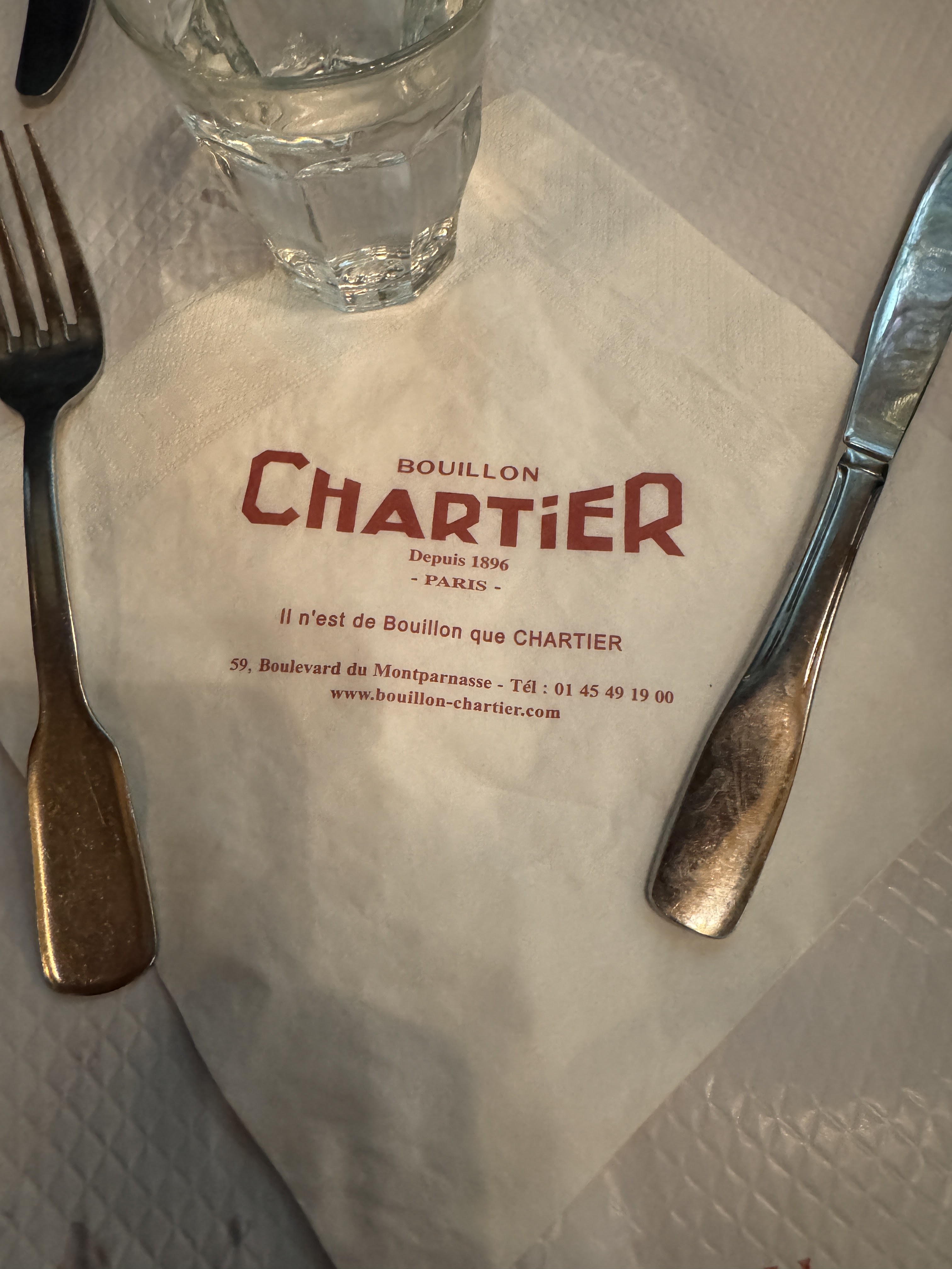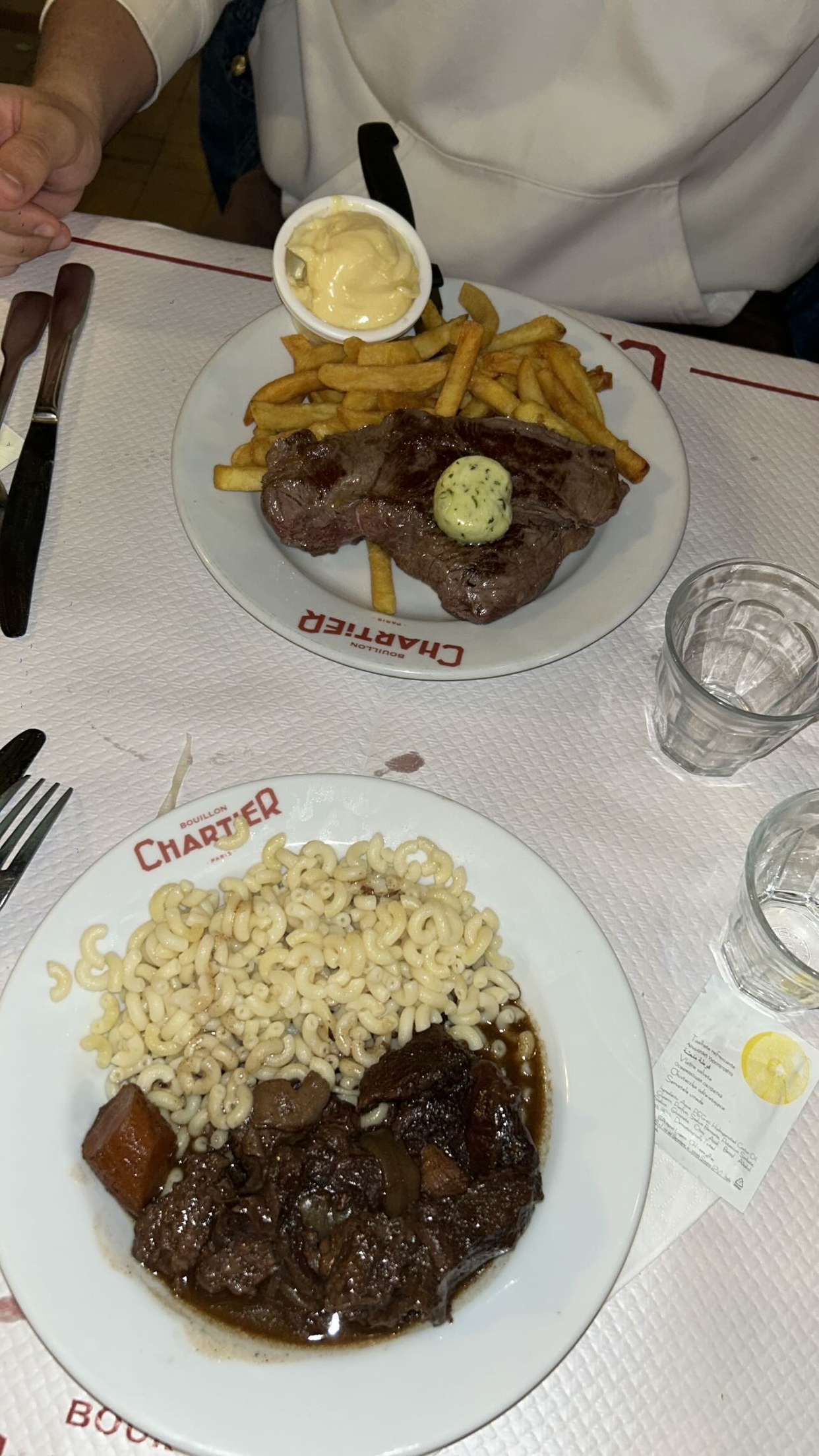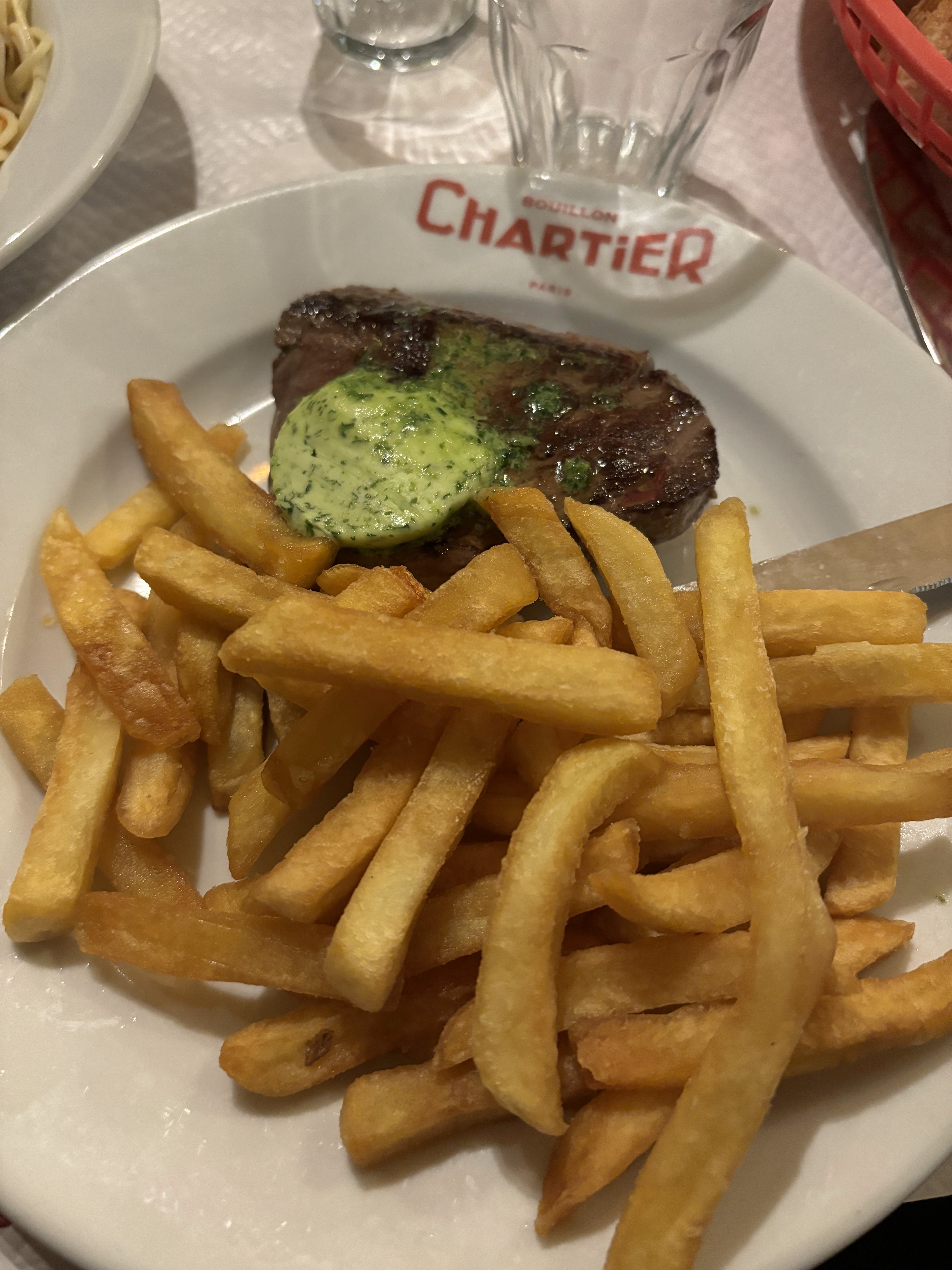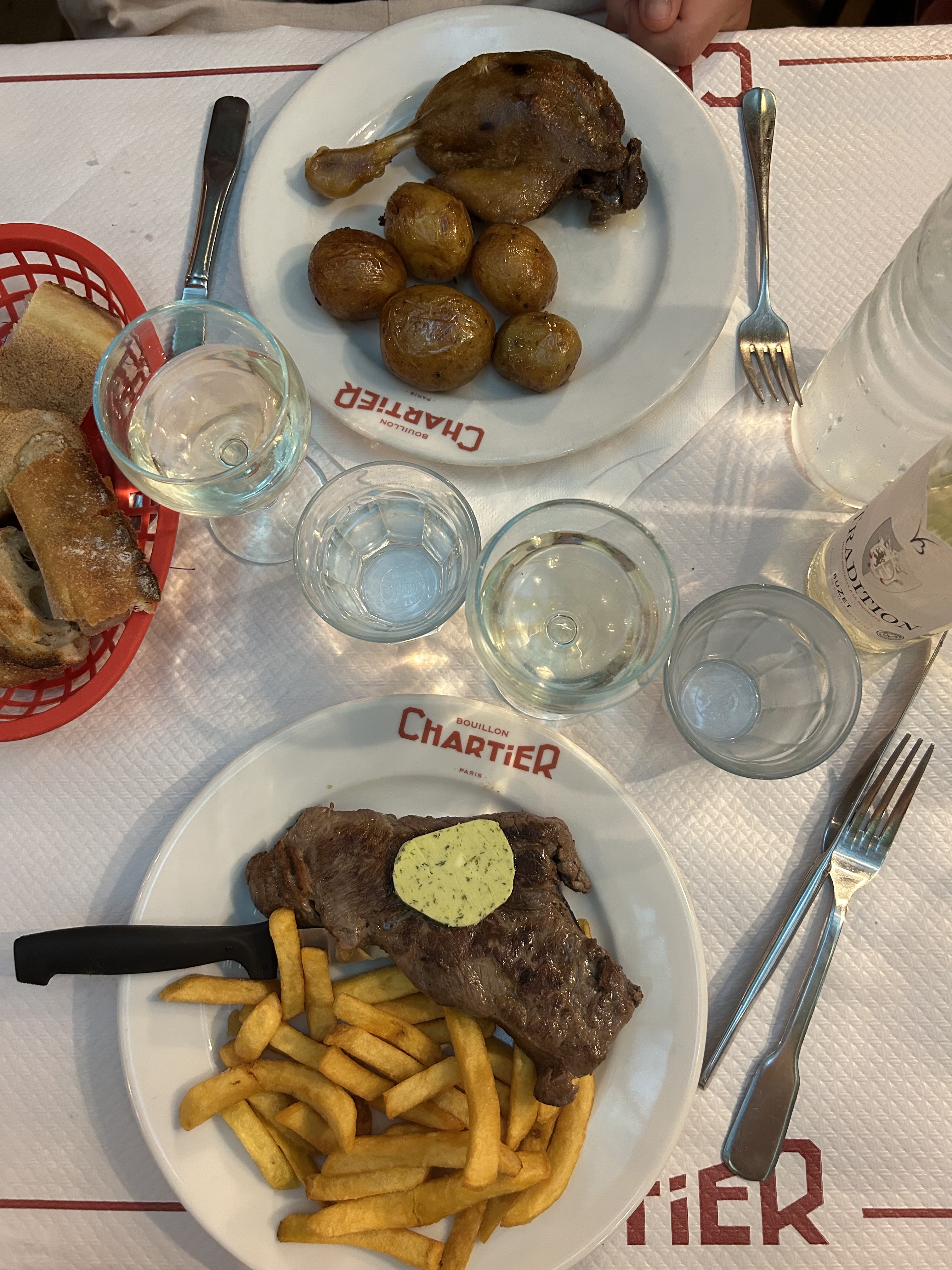 Nous sommes vers 18h30 et nous avons été installé rapidement, a notre sortie vers 20h, il y avait une longue file d'attente. Nous avons pris en entrée les escargots et la terrine de campagne. En plat la pièce du boucher au beurre avec ses frites (pas grasses du tout) et le boeuf bourguignon coquillettes. En dessert la mousse au chocolat et la profiterole Chartier. La première que l'on m'a servie, le choux était sec et j'ai fait signe a la serveuse qui me l'a changé très gentiment et là elle était excellente En somme, un repas avec un très bon rapport qualité prix (environ 20-25€ par personne entrée, plat dessert) avec des produits de qualités, un cadre magnifique et un service au top Petit plus, il note votre commande sur la nappe ☺️ et il y a des verres comme à la cantine