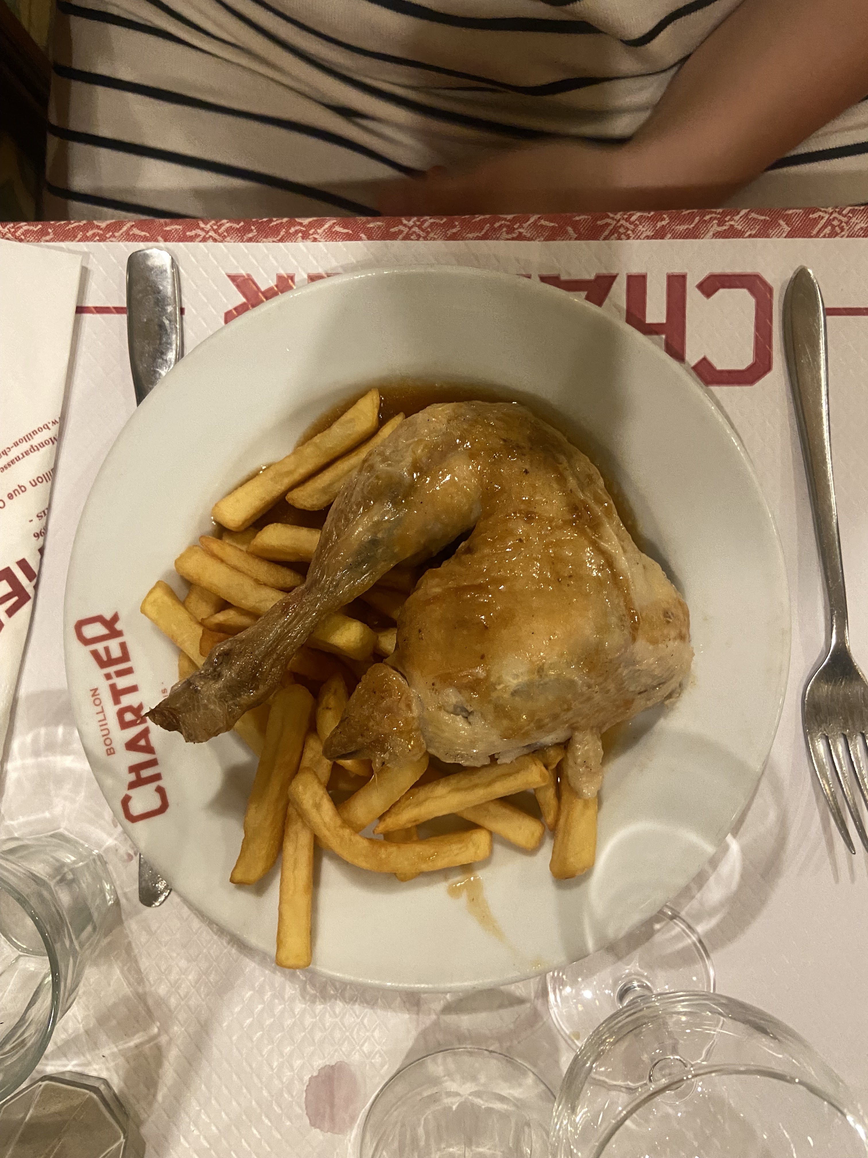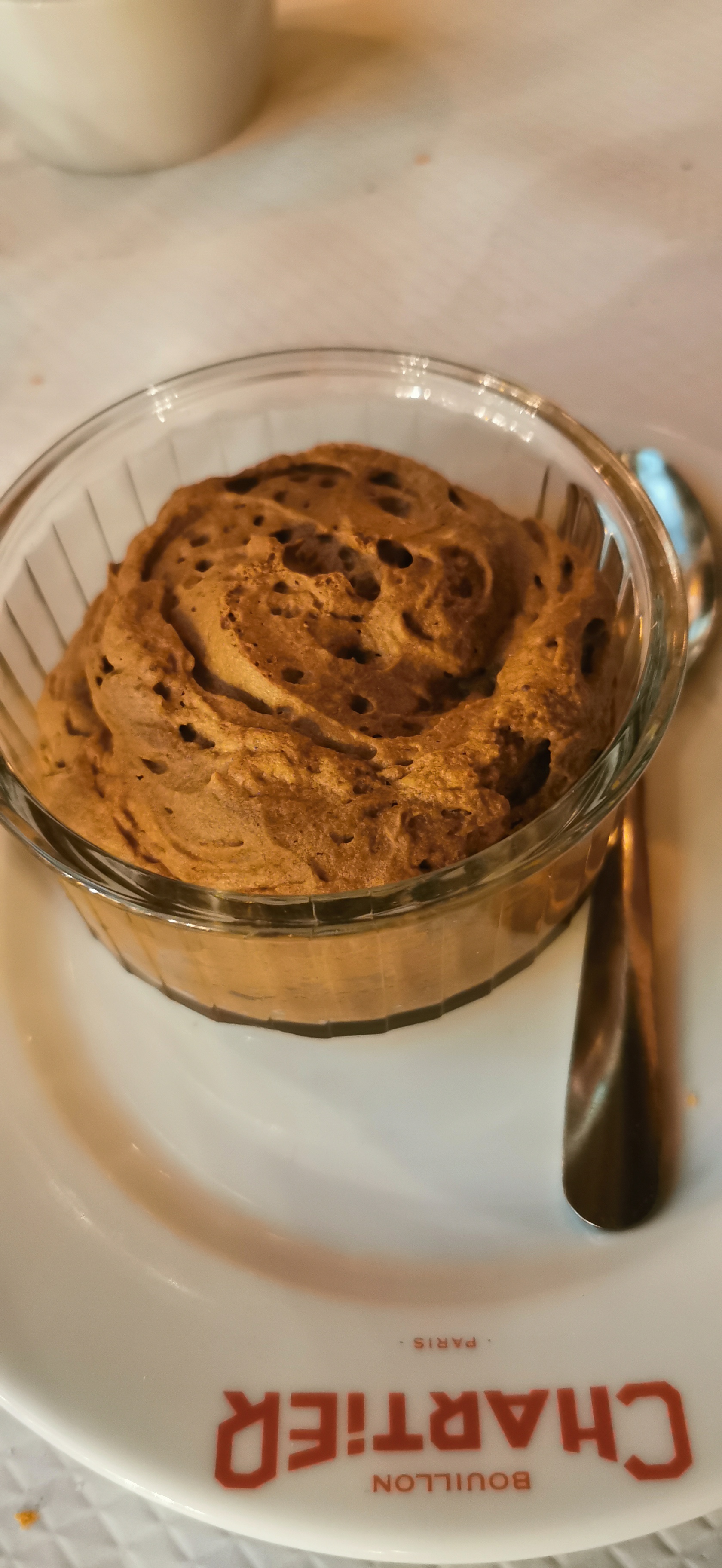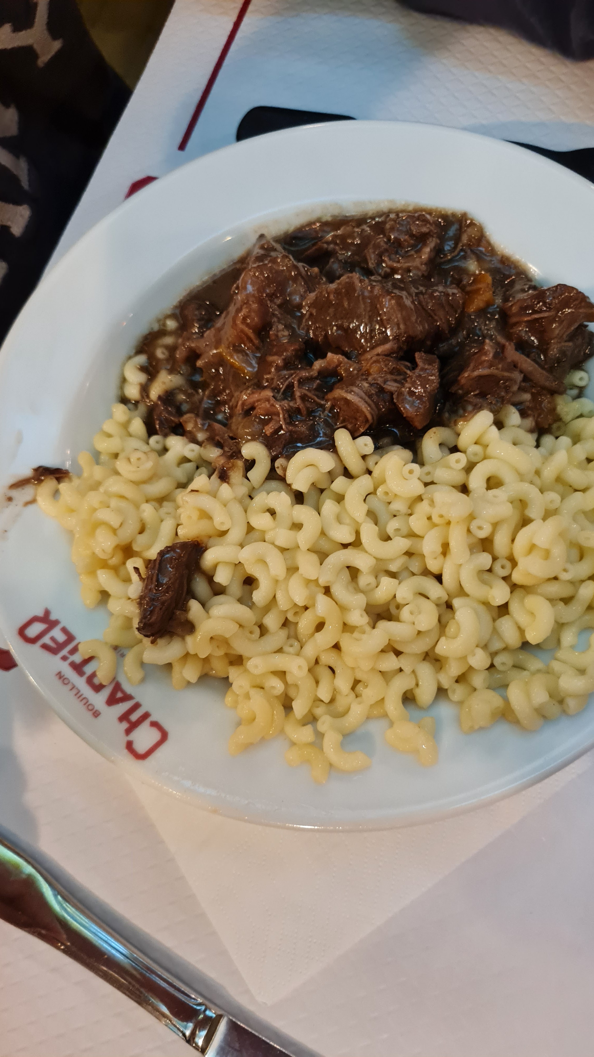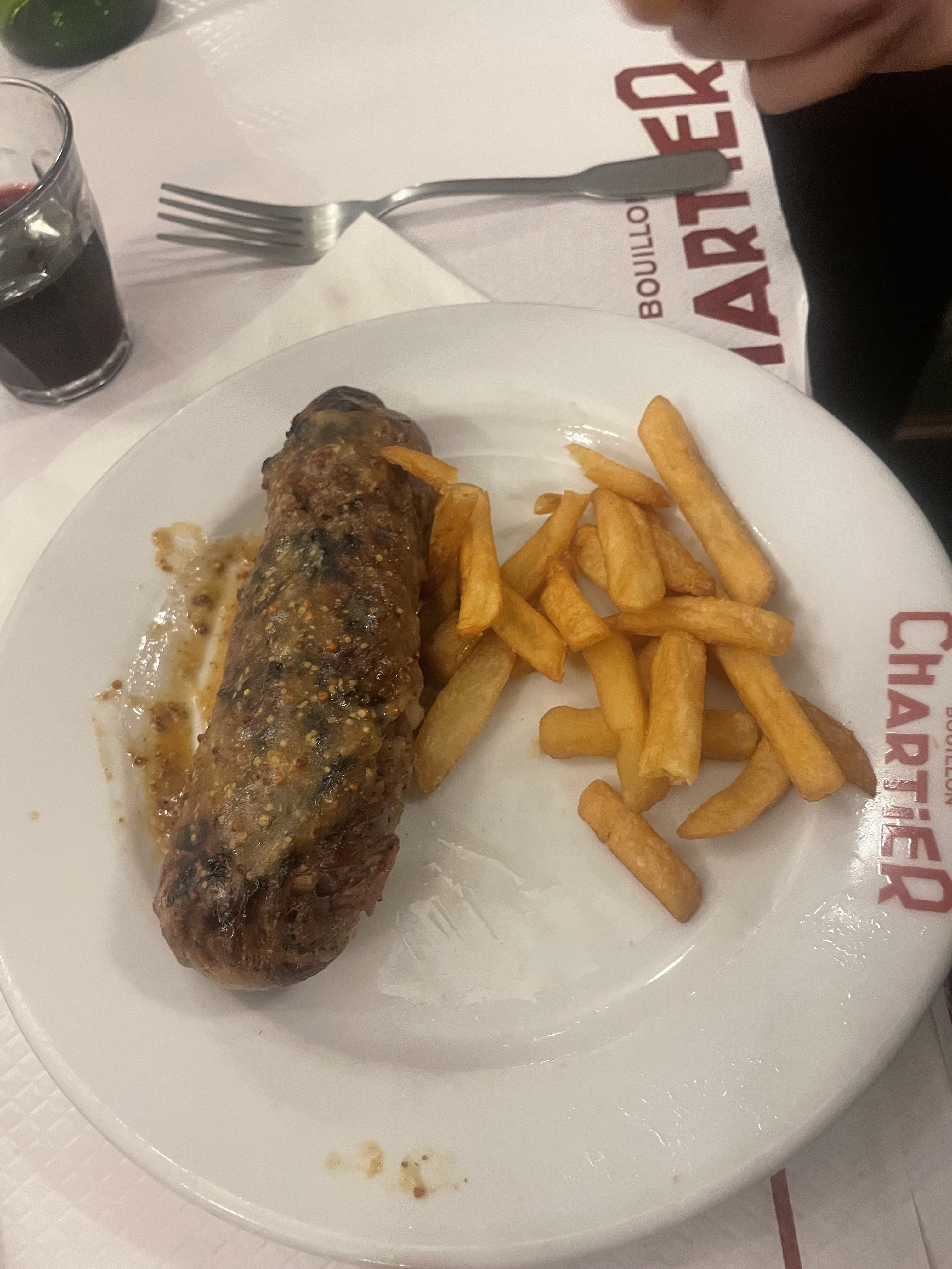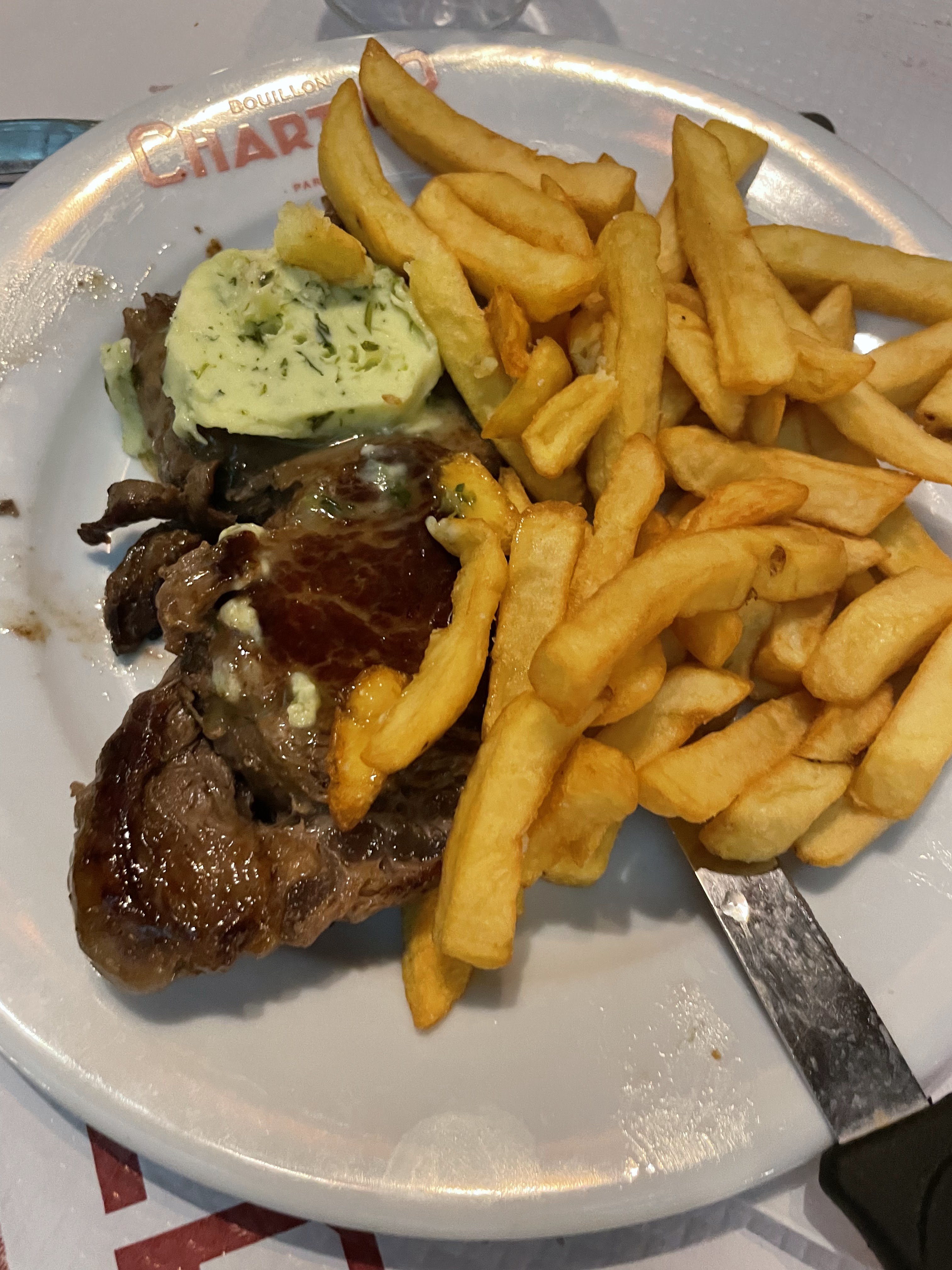 Nous sommes vers 18h30 et nous avons été installé rapidement, a notre sortie vers 20h, il y avait une longue file d'attente. Nous avons pris en entrée les escargots et la terrine de campagne. En plat la pièce du boucher au beurre avec ses frites (pas grasses du tout) et le boeuf bourguignon coquillettes. En dessert la mousse au chocolat et la profiterole Chartier. La première que l'on m'a servie, le choux était sec et j'ai fait signe a la serveuse qui me l'a changé très gentiment et là elle était excellente En somme, un repas avec un très bon rapport qualité prix (environ 20-25€ par personne entrée, plat dessert) avec des produits de qualités, un cadre magnifique et un service au top Petit plus, il note votre commande sur la nappe ☺️ et il y a des verres comme à la cantine