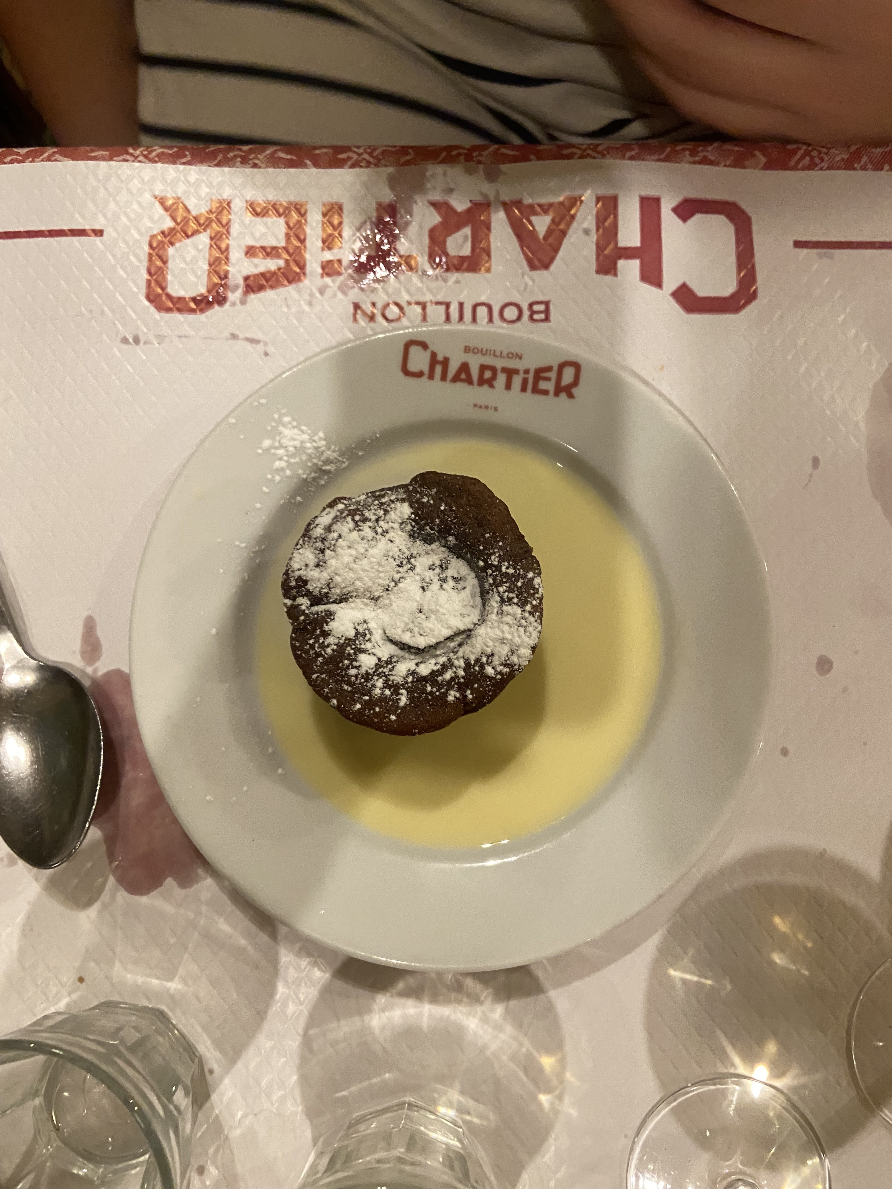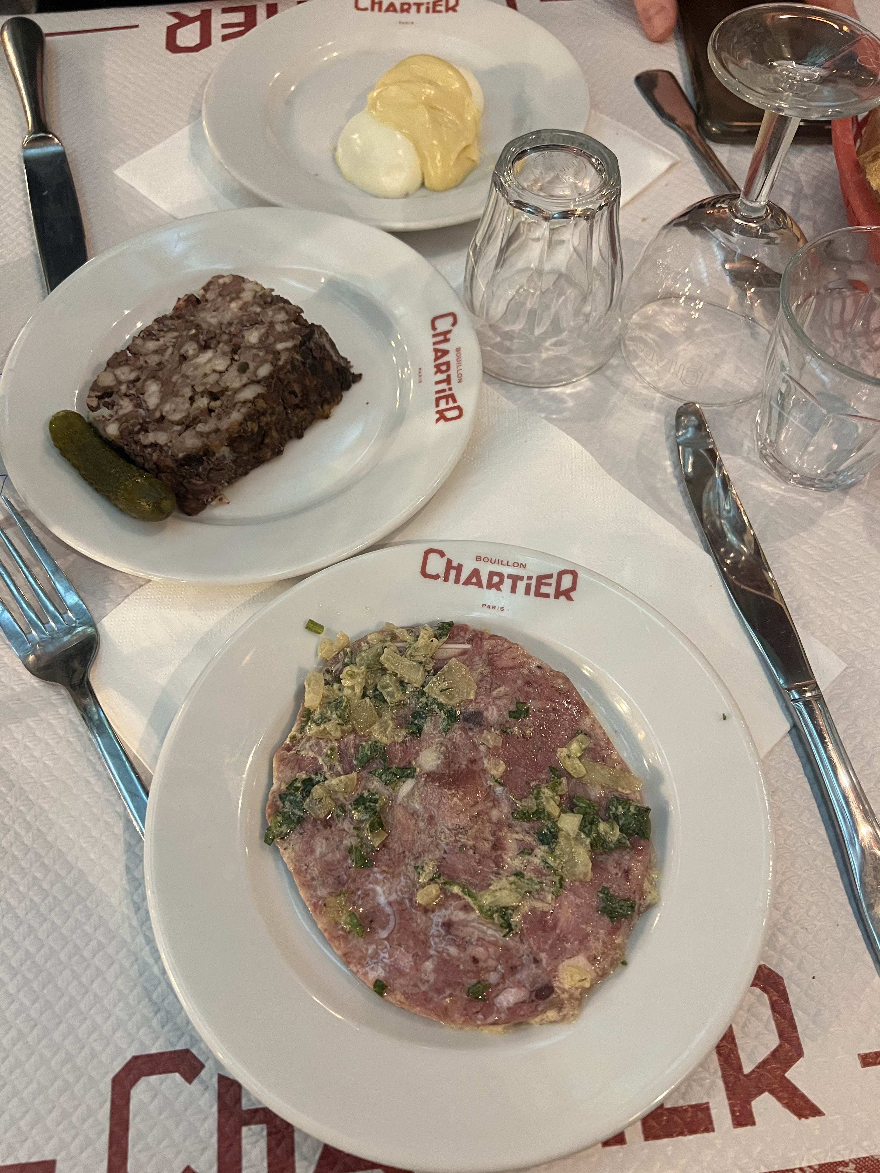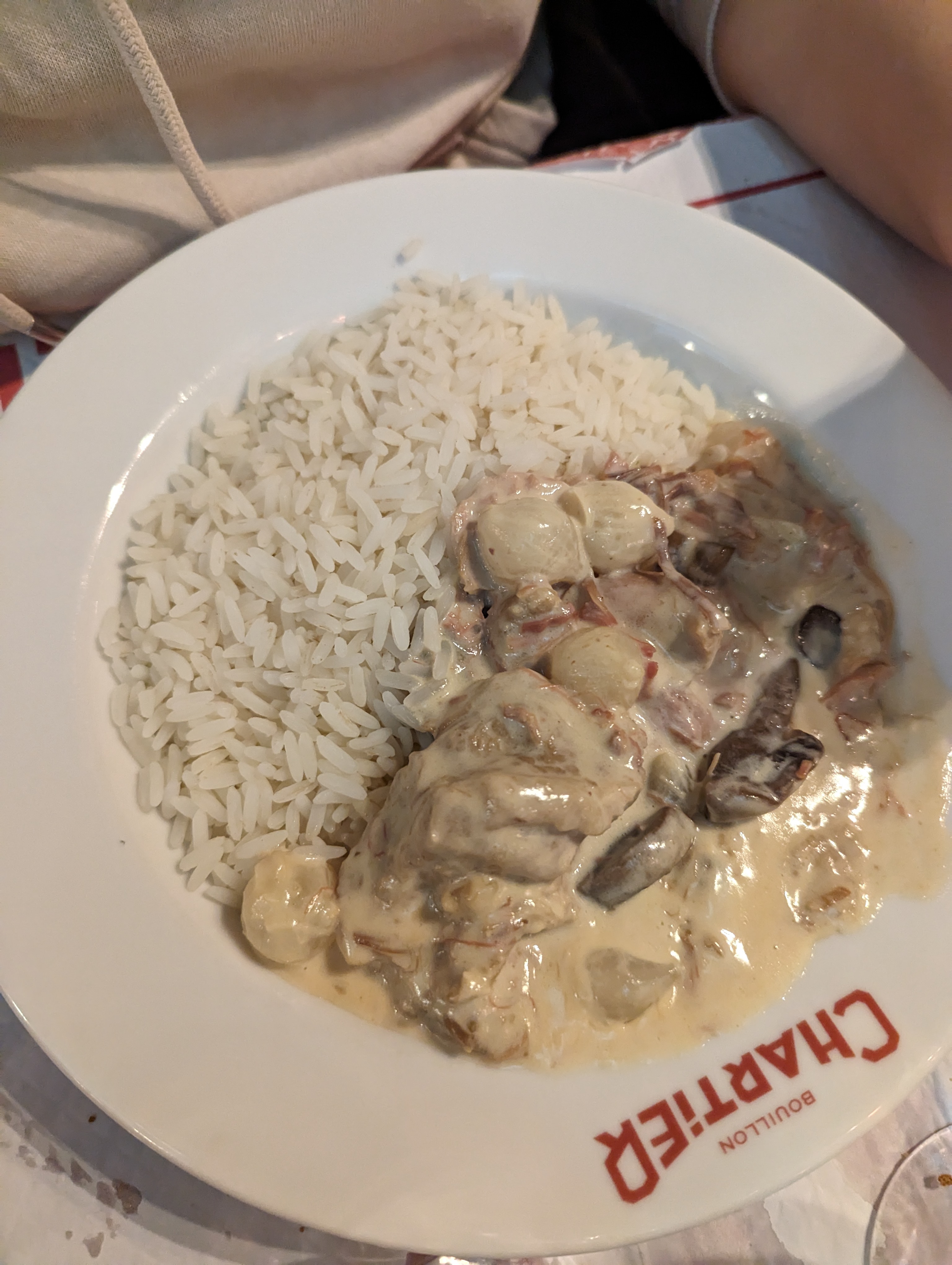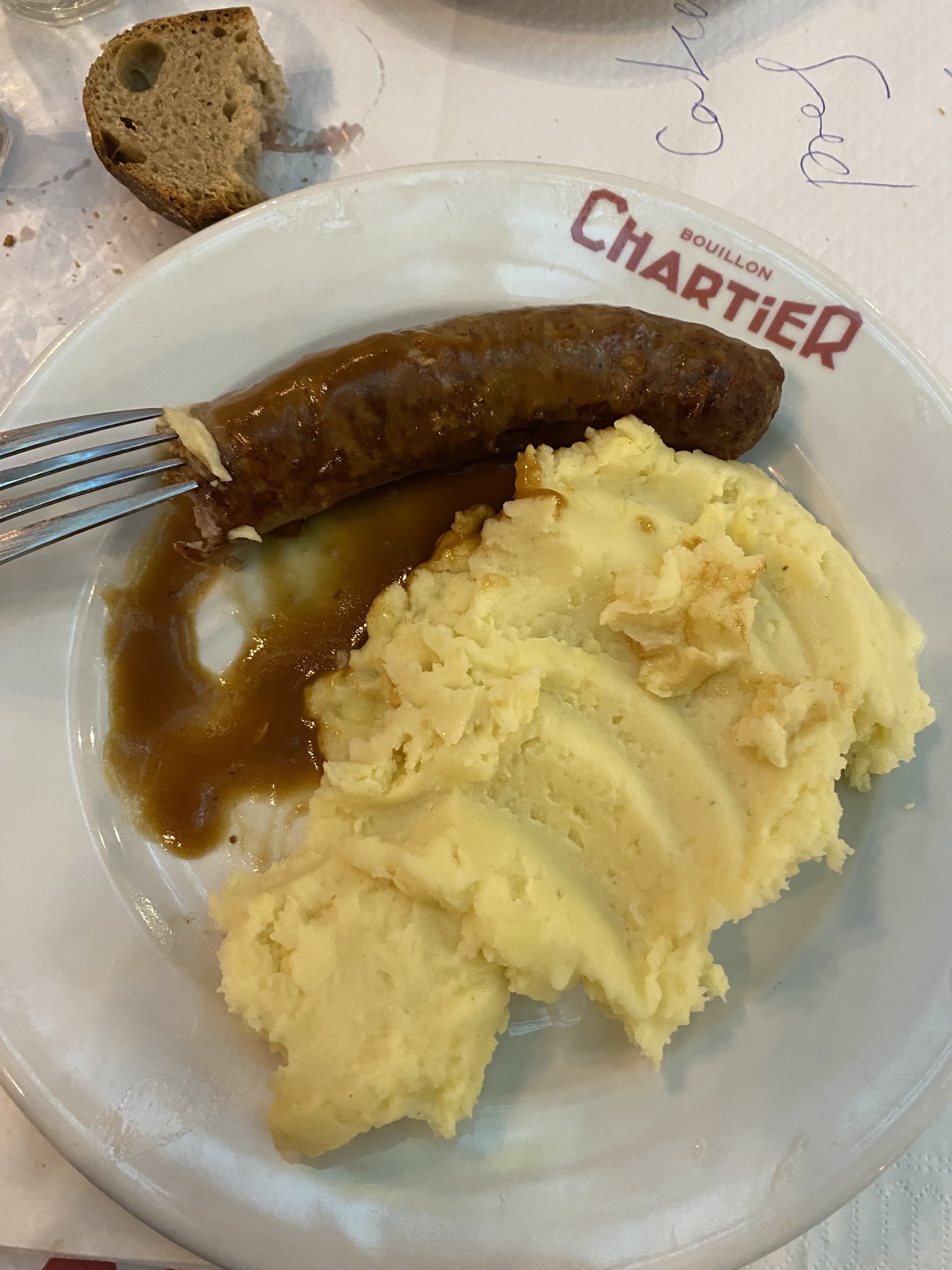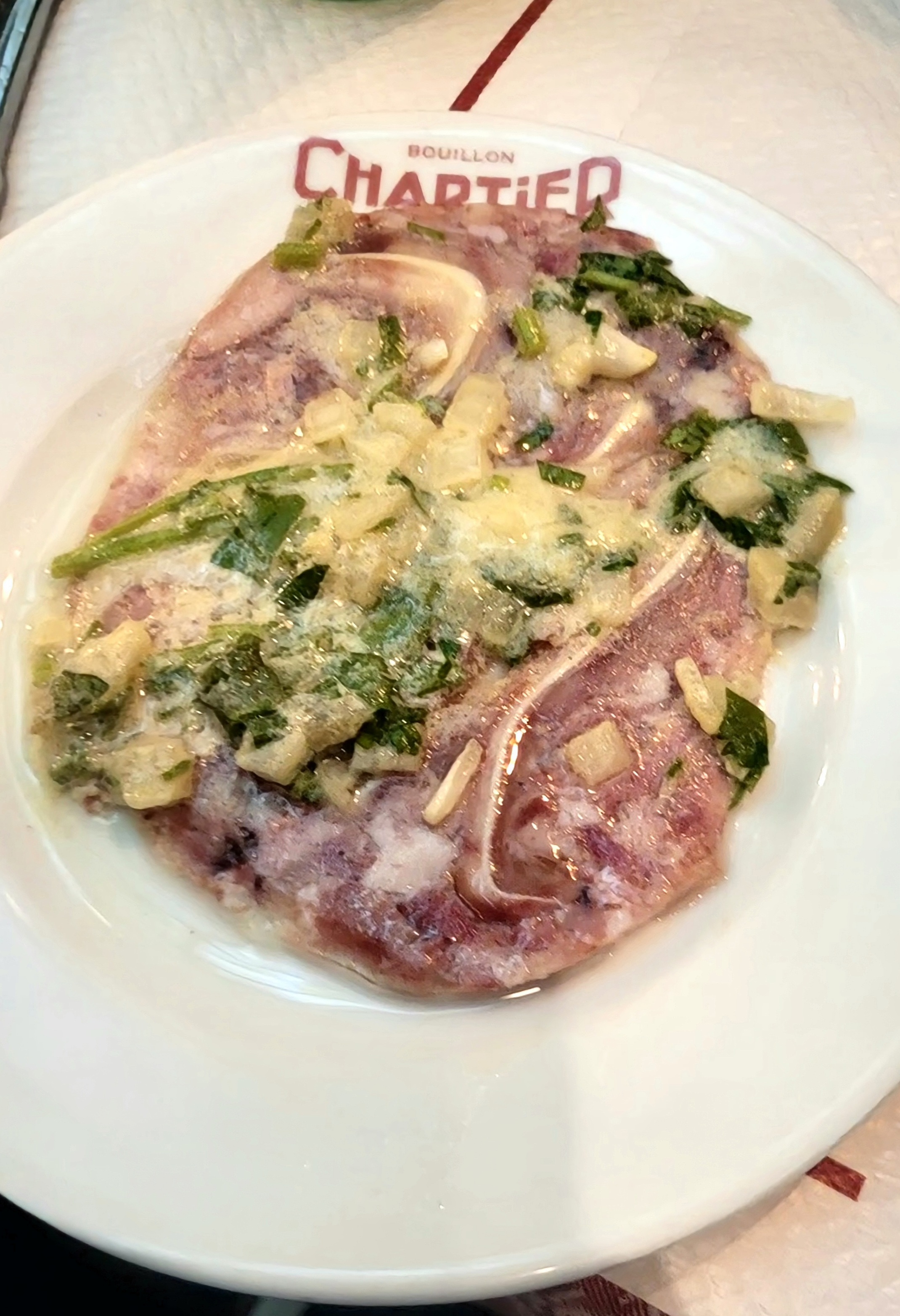 Nous sommes vers 18h30 et nous avons été installé rapidement, a notre sortie vers 20h, il y avait une longue file d'attente. Nous avons pris en entrée les escargots et la terrine de campagne. En plat la pièce du boucher au beurre avec ses frites (pas grasses du tout) et le boeuf bourguignon coquillettes. En dessert la mousse au chocolat et la profiterole Chartier. La première que l'on m'a servie, le choux était sec et j'ai fait signe a la serveuse qui me l'a changé très gentiment et là elle était excellente En somme, un repas avec un très bon rapport qualité prix (environ 20-25€ par personne entrée, plat dessert) avec des produits de qualités, un cadre magnifique et un service au top Petit plus, il note votre commande sur la nappe ☺️ et il y a des verres comme à la cantine