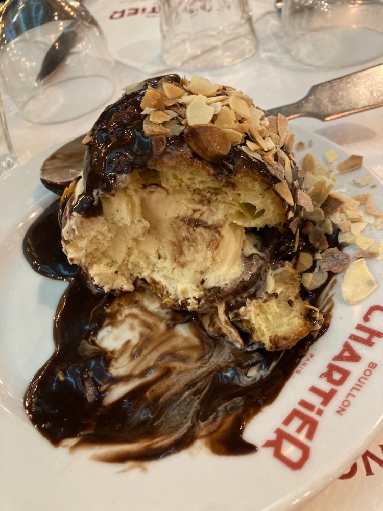 Le cadre est vraiment magnifique. On a pris en entrée 2 consommés aux vermicelles (super salé limite immangeable) et 6 escargots (tres bons) . En plat,on a pris une daurade( super bonne) et une piece du boucher (bonne mais pas assez cuite, je l’ai bien demandé bien cuite). Et enfin, on a pris une coupe mont blanc (crème de marrons un peu trop sucrée a mon goût mais tres bonne) et une profiterole Chartier (tres bonne et pas trop sucrée).