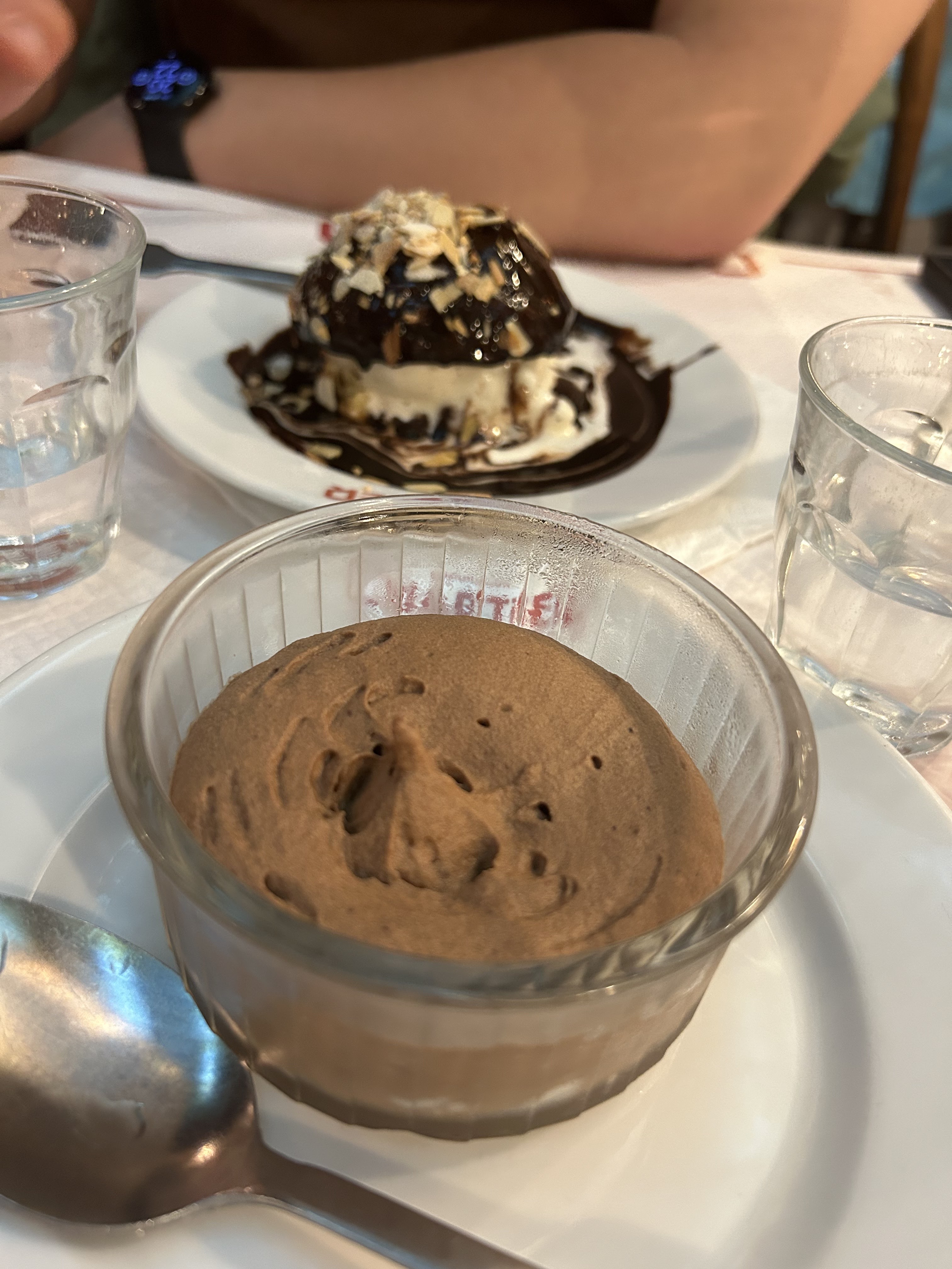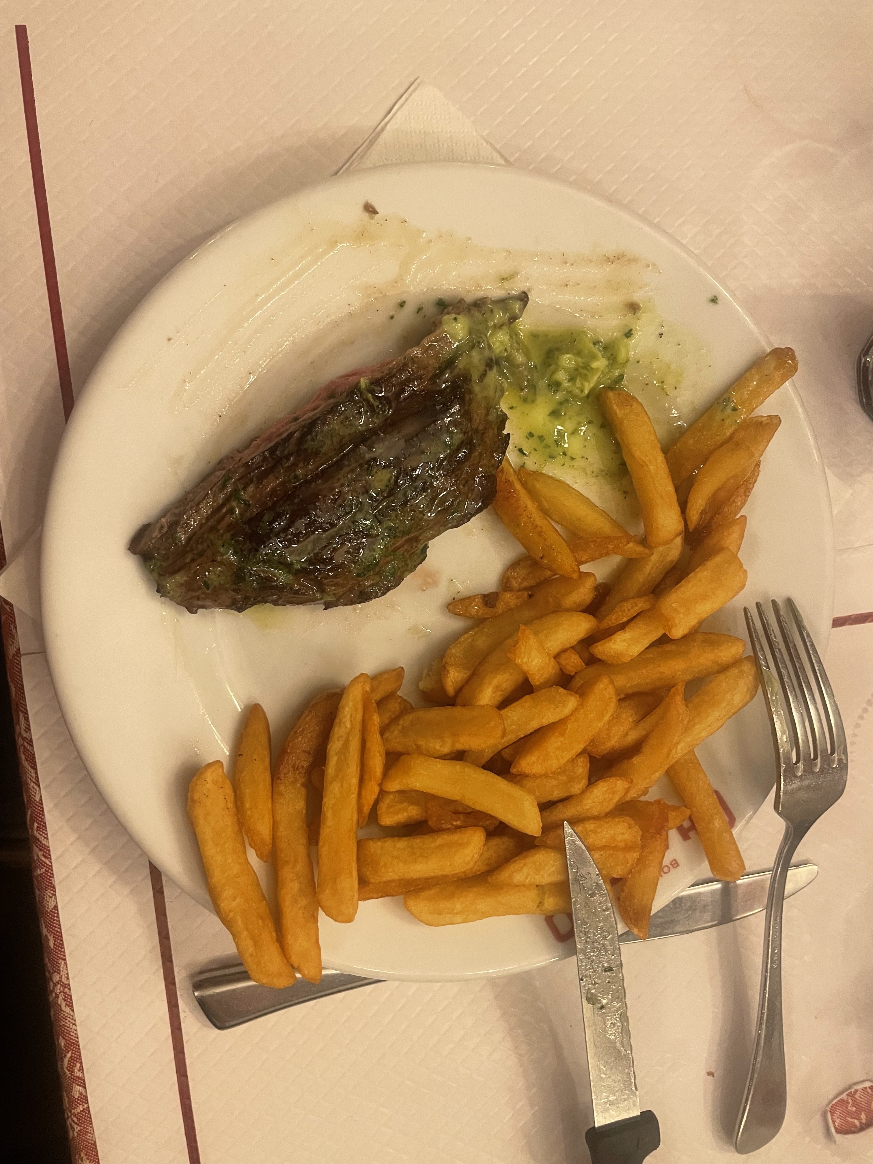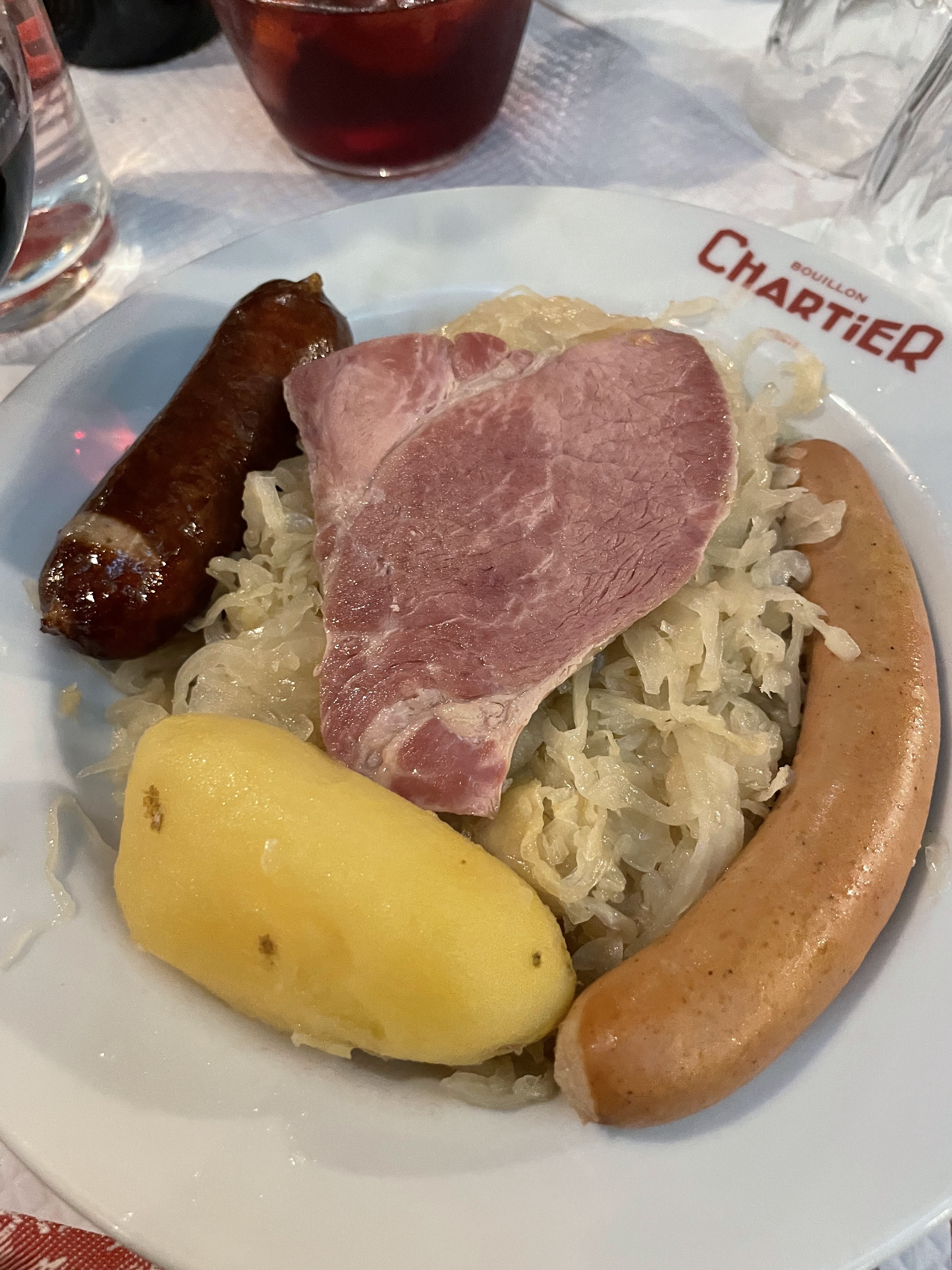 Une institution de la cuisine française, ce restaurant est à faire . Ne vous découragez pas par la queue , Ça va assez vite ! Les prix sont bas 12 euros pour un plat environ. On y croise autant des étudiants , des touristes que des familles . La salle est vraiment jolie et malgré le monde ce n'est pas trop bruyant . On y va pour manger des plats typiques français, Dans l'assiette c'est simple et efficace. On recommande en plat : - la choucroute , - la pièce du boucher , - le confit et - l'andouillette . En dessert: la profiterole ou le mont blanc. Moins de 80 euros à 4 avec entrée+ plat + dessert et vin . On en revient toujours pas 🤭
