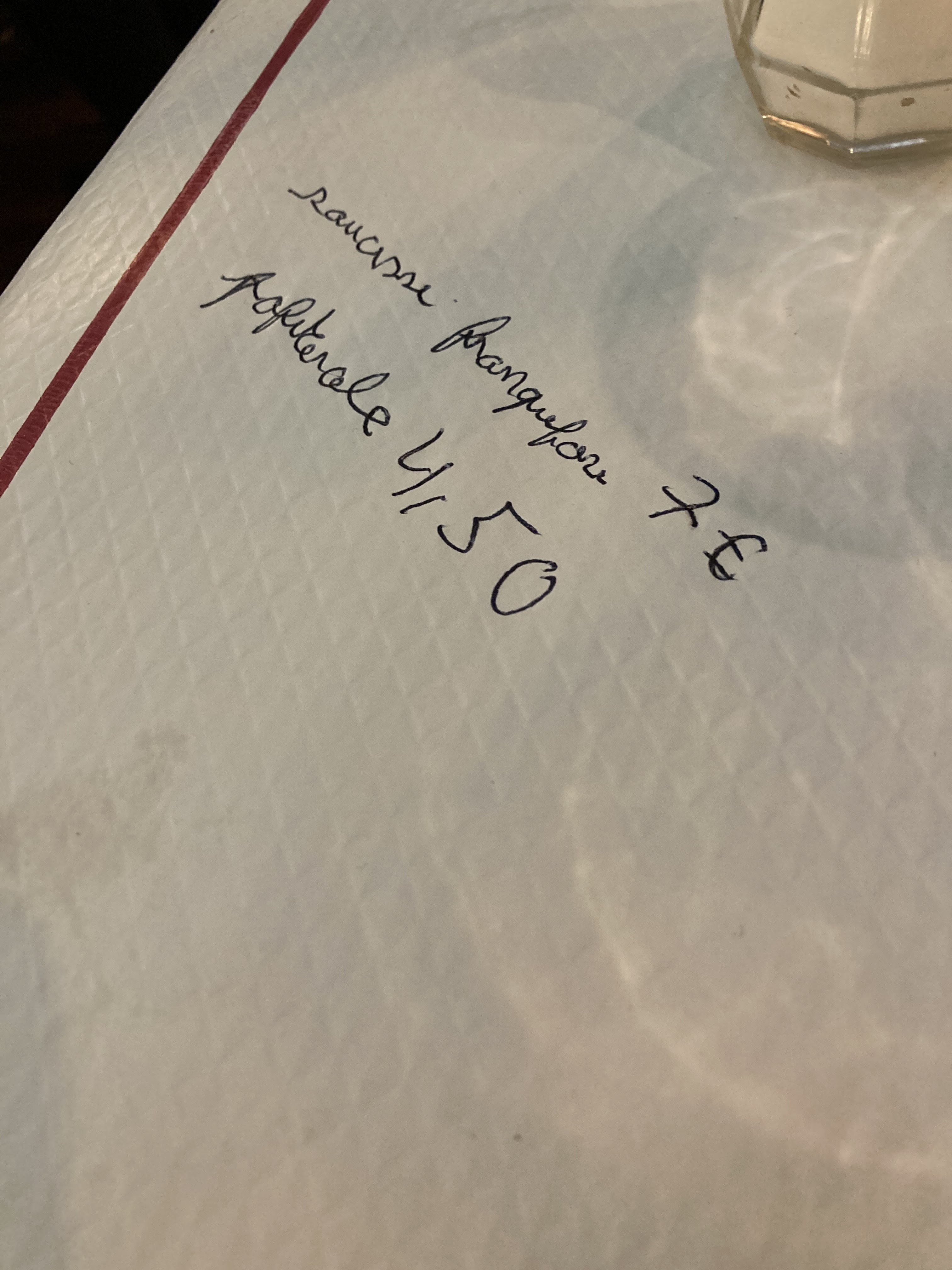 Première expérience dans un bouillon parisien !! Un peu d’attente à l’extérieur car il est impossible de réserver dans cet établissement. Le manager est un peu mal poli il faudrait penser à dire bonsoir car ça fait un peu inspecteur de police quand il arrive pour nous accueillir. Cependant, Le rapport qualité prix de l’établissement est très satisfaisant, les prix ne sont pas exorbitant pour les plats et pour le vin! Nous sommes arrivés tard du coup la cuisine fermait dans peu de temps donc nous avons eu nos entrées donc nous avons eu les plats en même temps que les entrées, un peu pressant mais bon on la chercher! Le cadre est vraiment sympa et typique où les serveurs écrivent la commande directement sur la nappe ! Respect au personnel merci pour cette expérience unique dans un bouillon parisien !