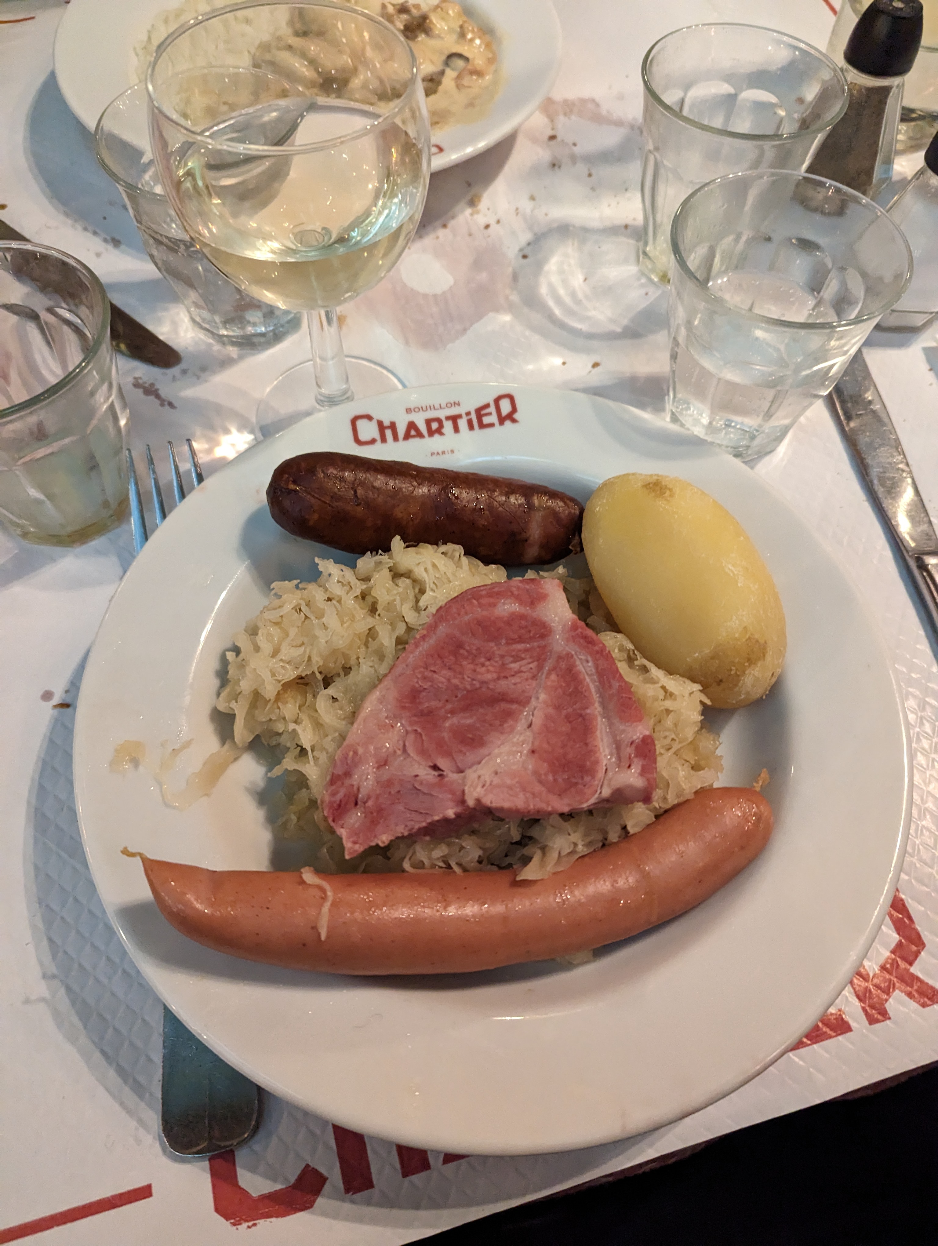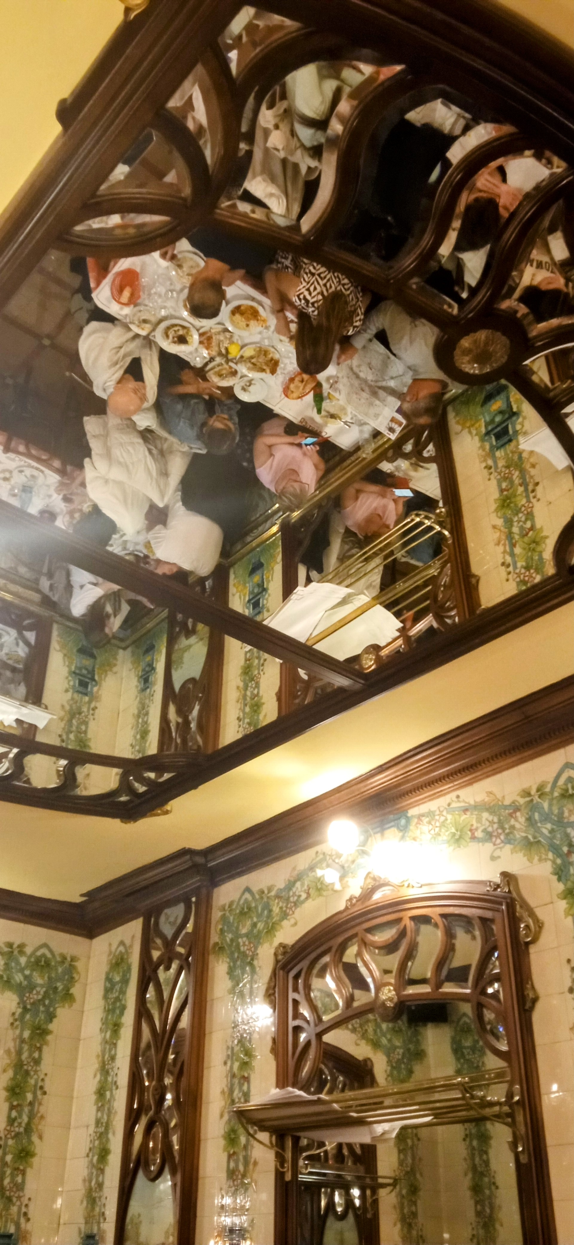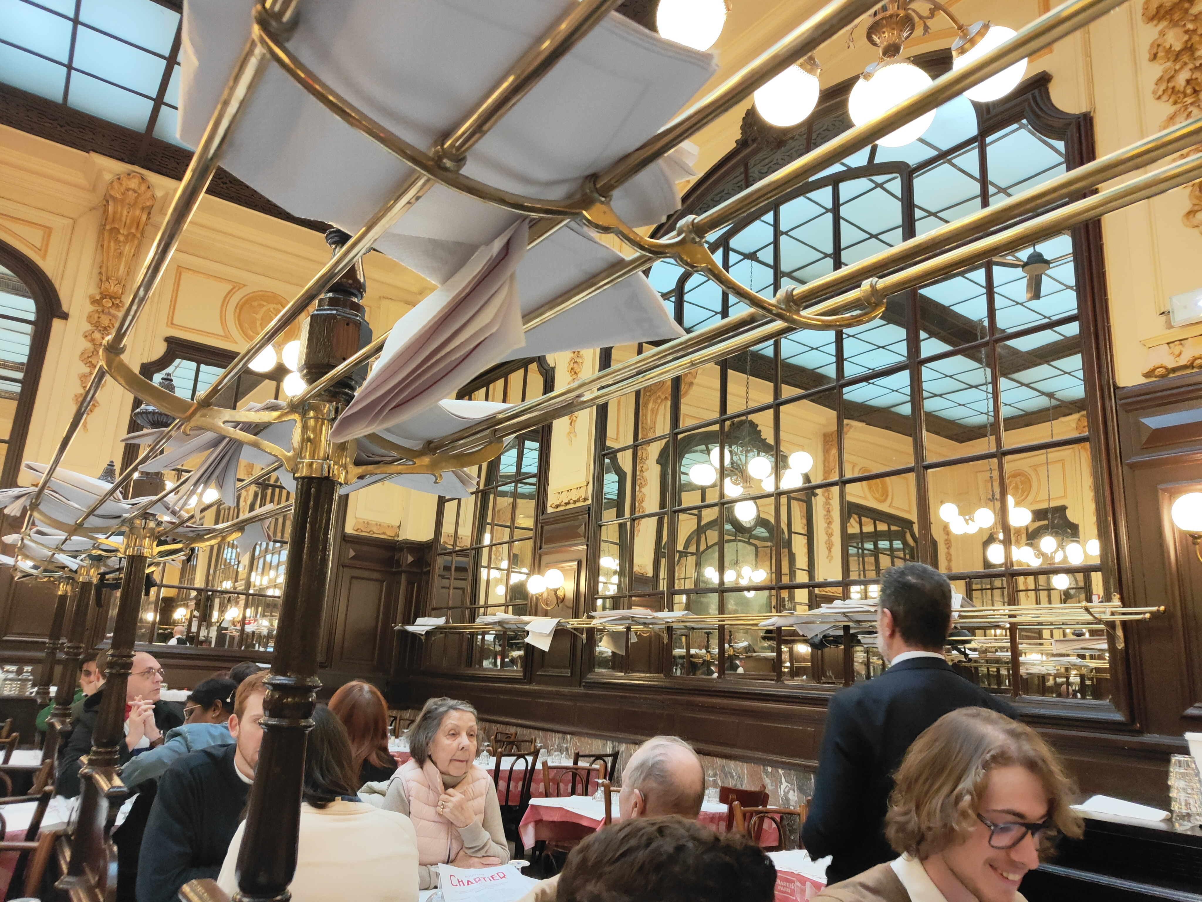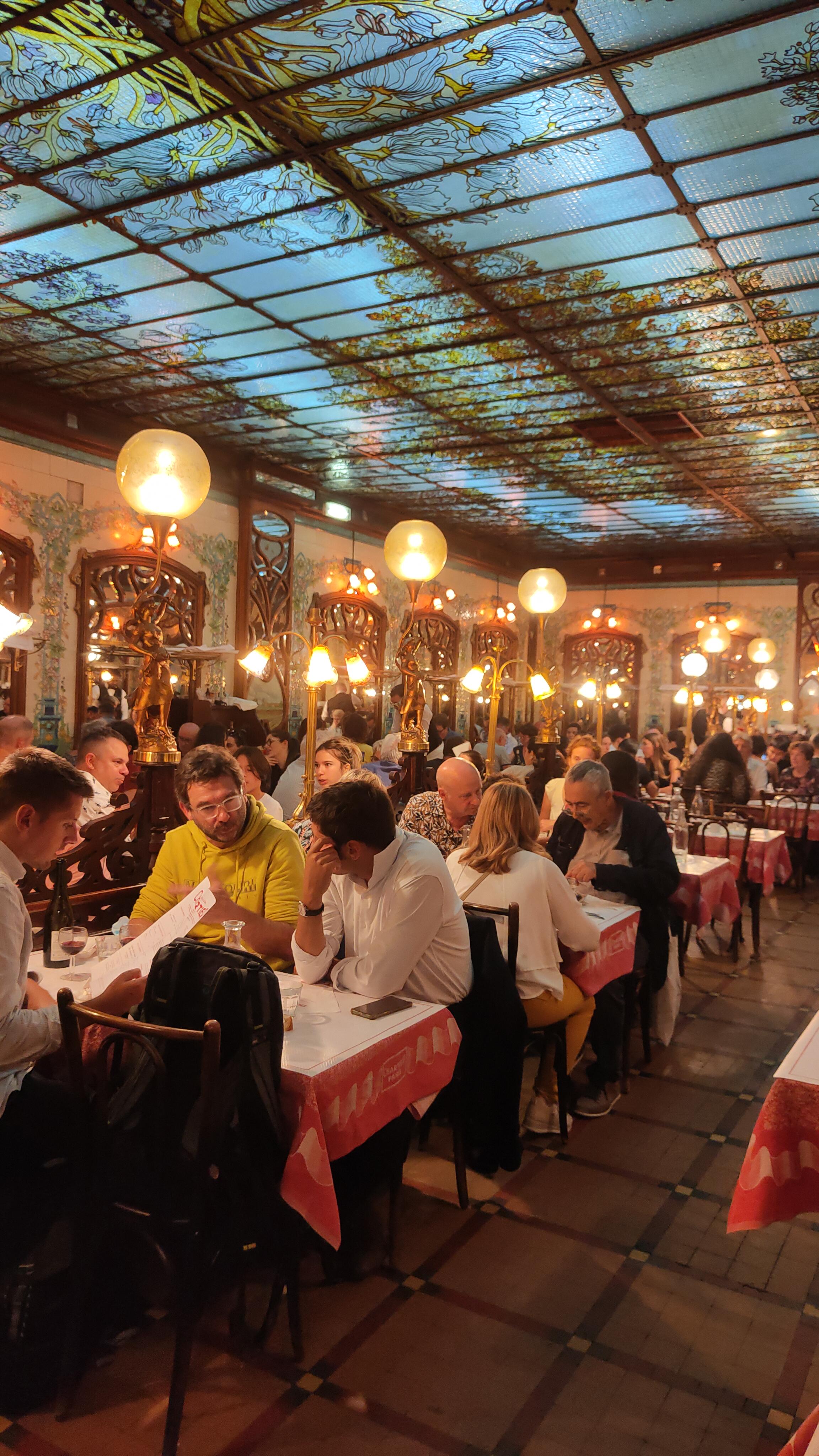 Décor exceptionnel, verrière et grands miroirs Art Nouveau. Beaucoup de clients prennent des photos. La vocation populaire du Bouillon Chartier se confirme : choix de plats traditionnels à prix vraiment doux. Mais ma choucroute (copieuse) était un peu fade. Service remarquable, et très souriant de la jeune femme portant le badge N°7, quelle efficacité avec autant de monde et un rythme de travail aussi soutenu ! J’étais installé avec deux couples à une table de six, nous avons fait connaissance et bavardé agréablement, cela aussi contribue au charme décontracté de ce restaurant !