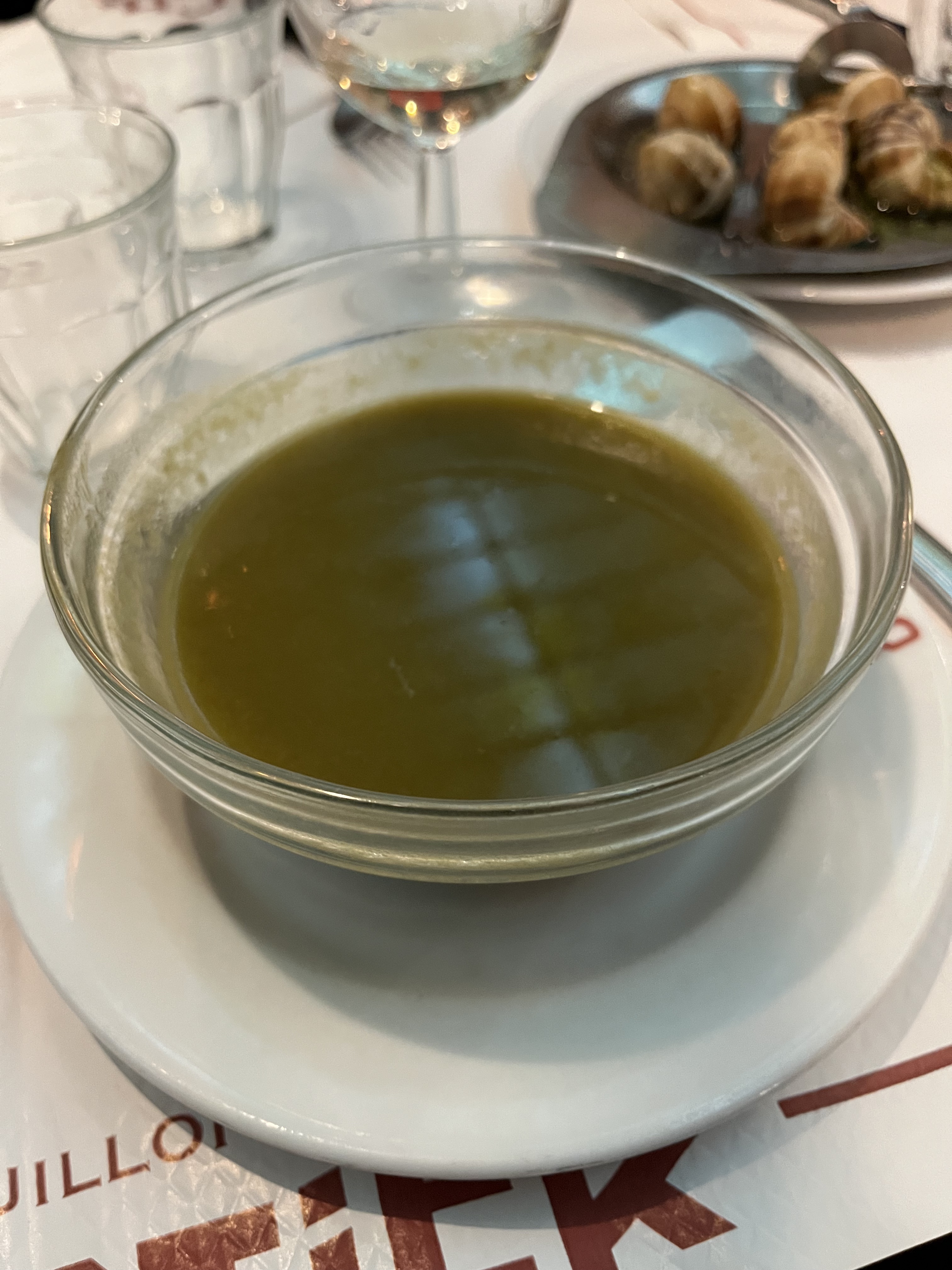 Accueilli comme une star, c’est gratien le serveur qui s’occupe de moi. Il prend la commande sur la nappe Le bouillon parisien, j’y suis. Je commande un cidre. Mince il est doux sans doute pour la clientèle cosmopolite. Les serveurs fourmillent, je suis en face du bar qui paradoxalement est un endroit calme d’où j’entends le brouhaha de la grande salle. Les clients rentrent à toute vitesse. Le décor est top vintage. Ça envoie du plat à fond . Expérience sympathique.