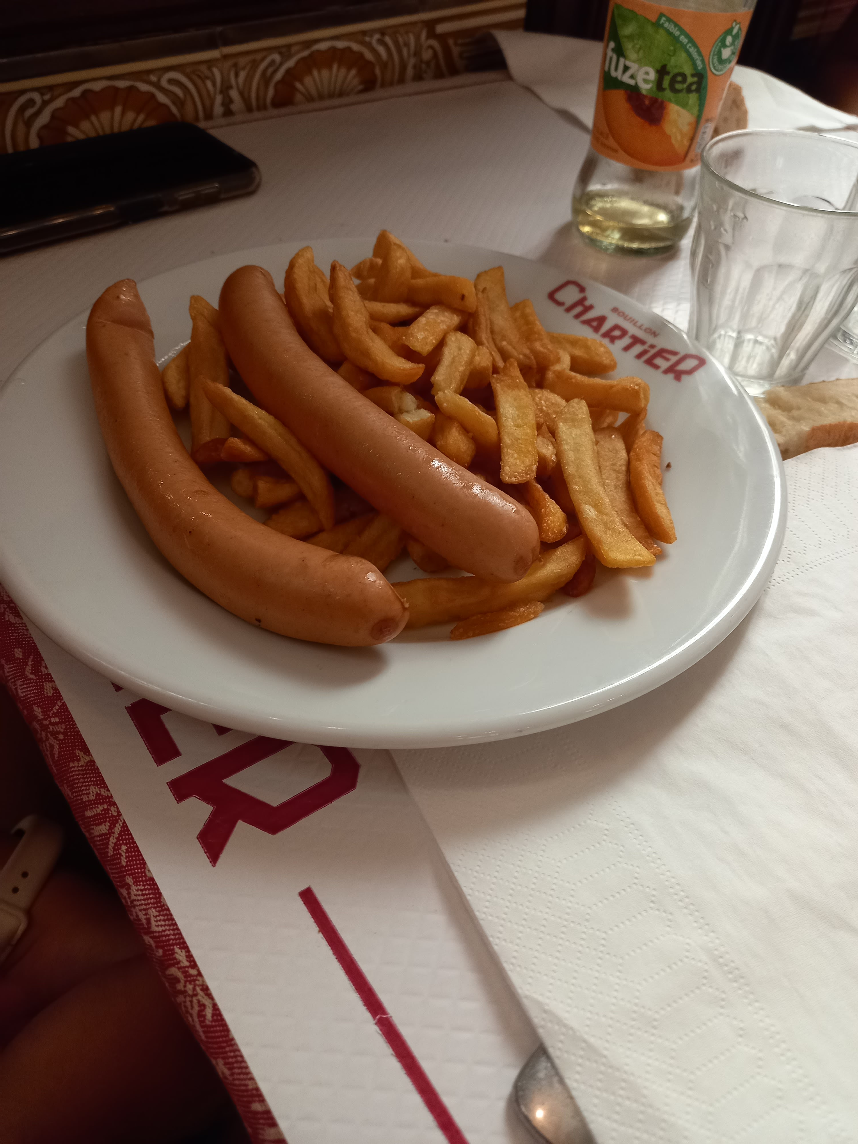Quand je vois certains commentaires je me demande où ils pensent déjeuner. C’est un bouillon! Le principe ? Des plats sans prétention et basiques servis ultra rapidement (plats apportés en 2 min max) à des petits prix. On repart après une heure max le ventre repli en ayant bien mangé. Pas d’arnaque comme certains restos où de la cuisine congelée vous est servie pour 25 euros le plat. Testé saucisses de Francfort frites. Les frites sont bonnes. La profiterole du chartier. Bon chocolat bonne glace le choux est correct. Le service est impeccable. L’ambiance très sympa.
