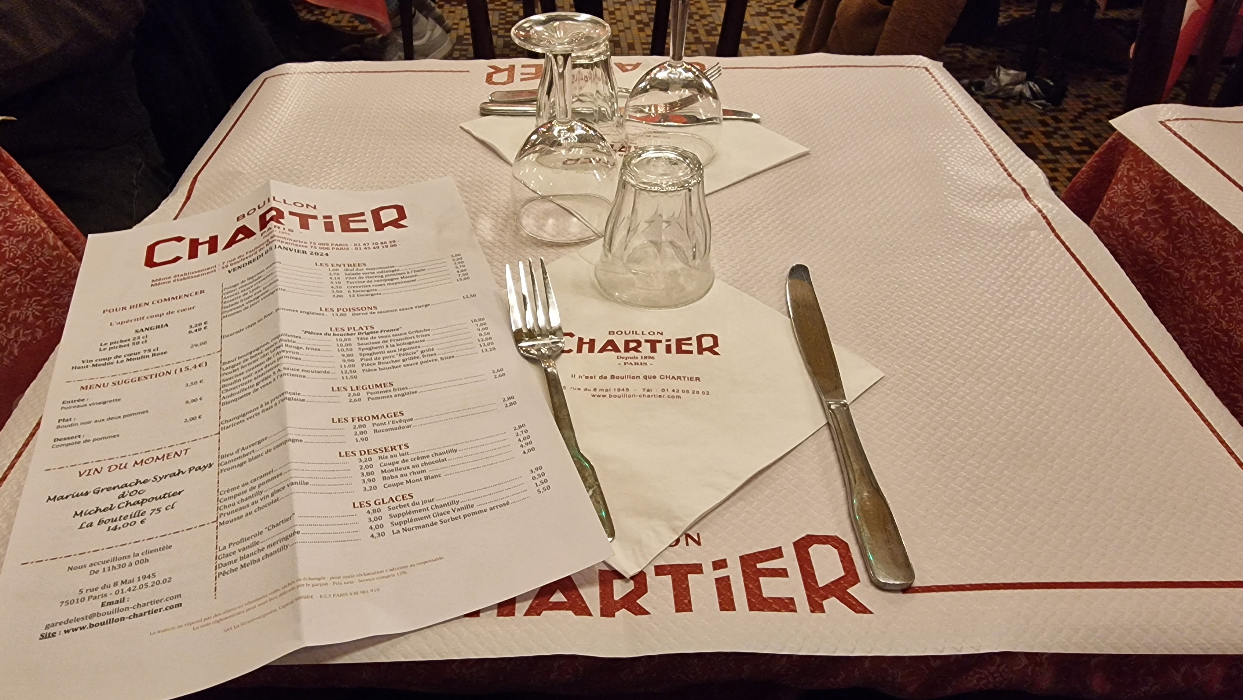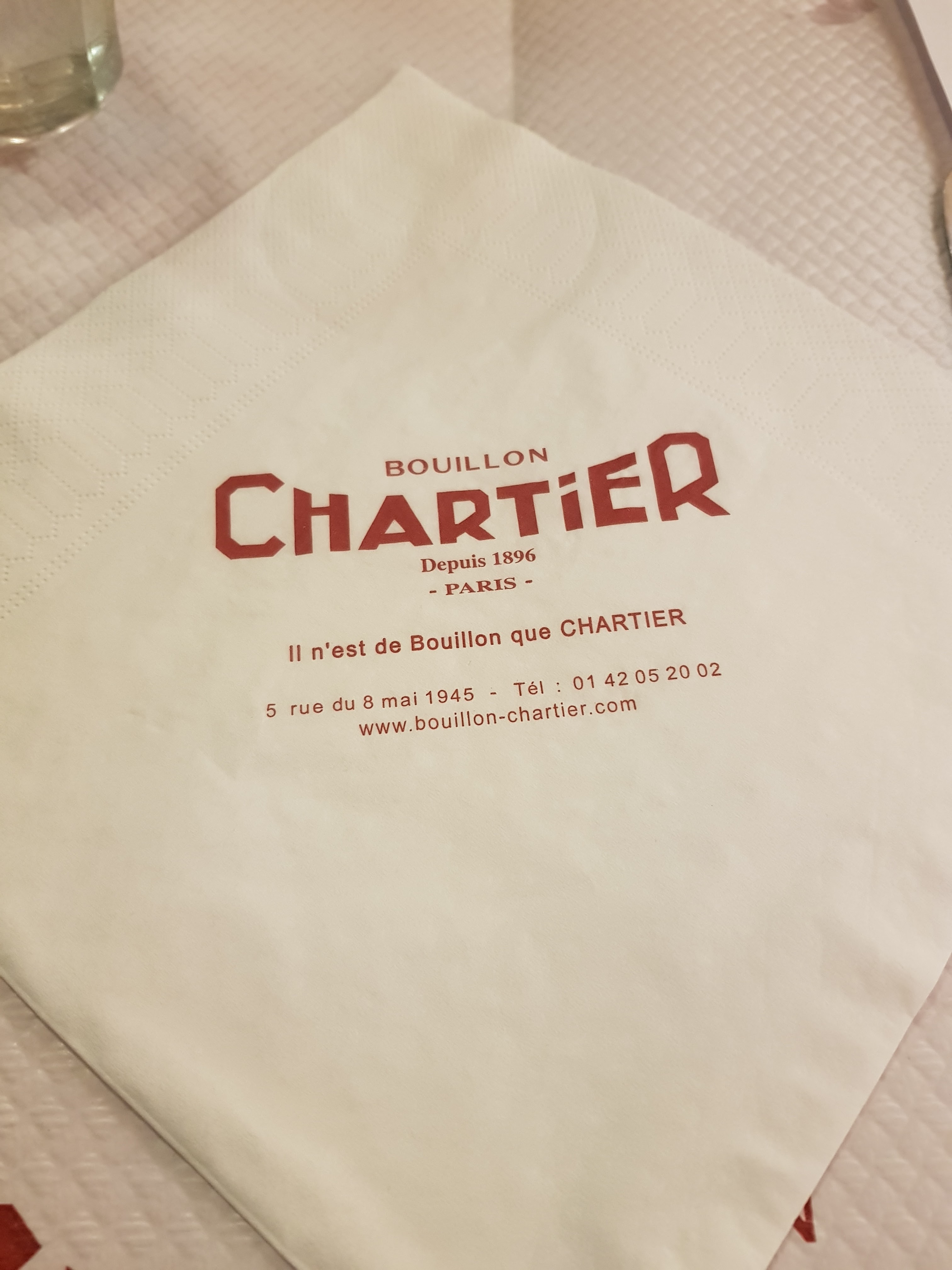 Nous sommes allés un soir de décembre, par hasard, au Bouillon Chartie de la Gare de l'Est. L'accueil a été exceptionnel, le cadre du restaurant est typique parisien, le service est rapide et irréprochable. Une mention particulière à notre serveur, dont je ne me souviens plus le nom, qui a été aimable, bienveillant et à l'écoute bien que nous ayons fait l'attraction avec nos avions en papier réalisés avec le menu, imprimé à la date du jour (ce point est important à souligner), peut-être que le serveur se reconnaîtra. Merci.