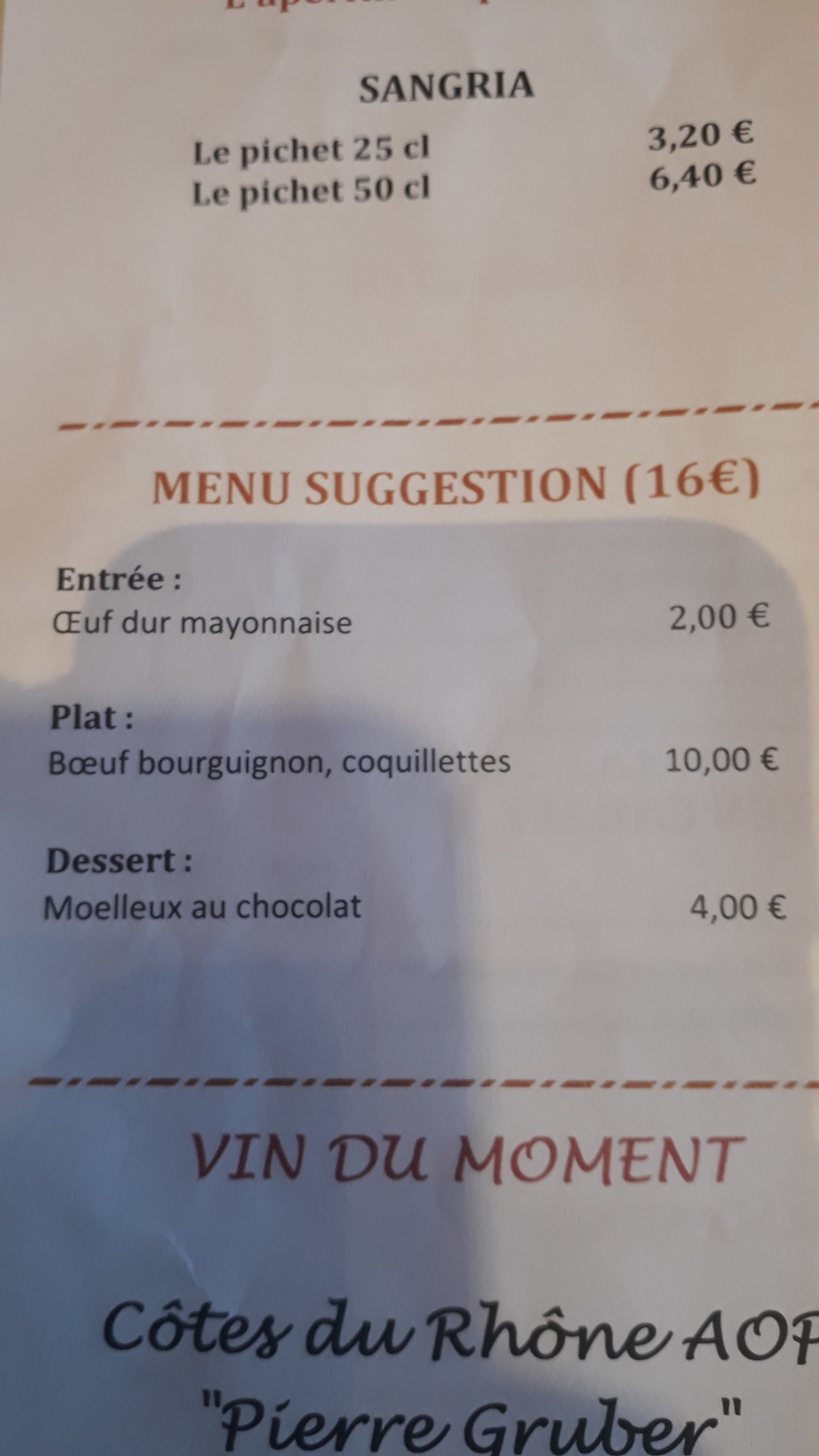 Restaurant sympathique, un cadre chaleureux, une carte simple, des plats traditionnels sans chichis qui vont à l'essentiel: nous titiller les papilles Le boeuf bourguignon était tendre et la sauce excellente. Le baba au rhum en dessert était copieux, servi avec une chantilly généreuse, et le rhum parfaitement dosé. Personnel sympathique, très poli , et courtois, attentif et réactif. Je reviendrai.
