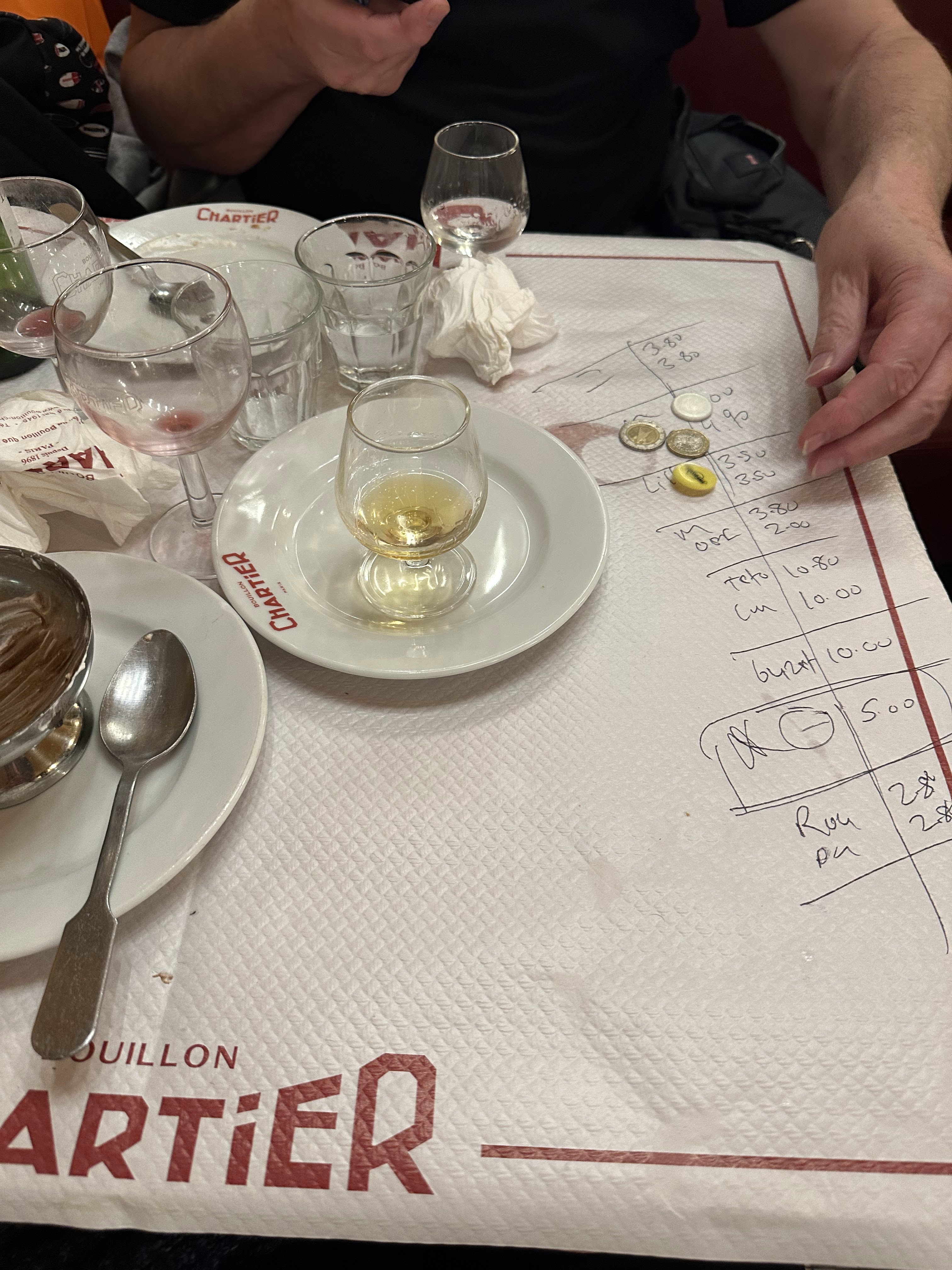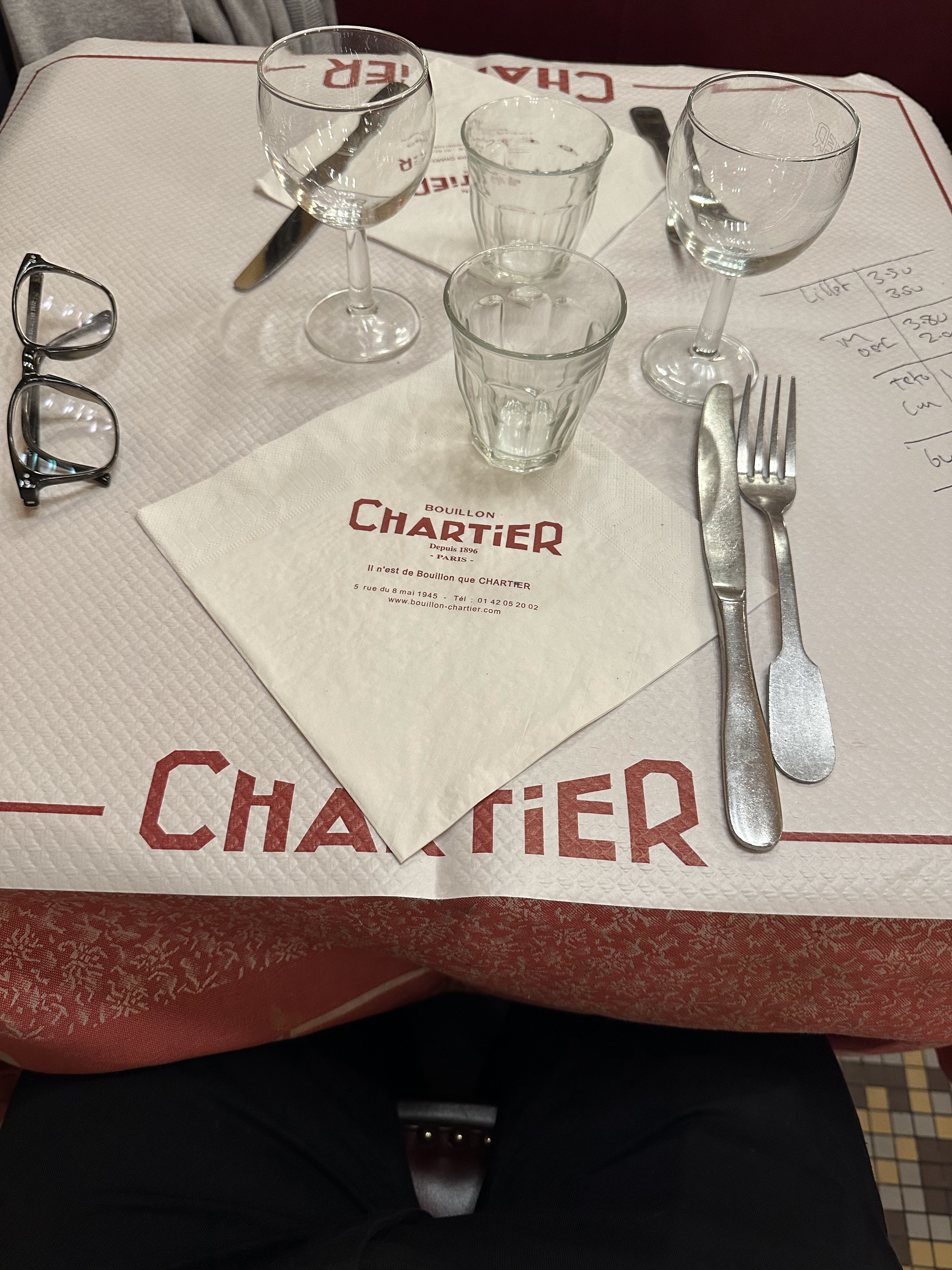Chartier ! Une institution où l'on se régale de choses simples ! C'est un Bouillon, et comme dans un bouillon tout à de la saveur, c'est gourmand, c'est étonnant, c'est croquant, c'est fondant, c'est amusant, c'est accueillant..... Un grand Merci à notre Bouillonnant serveur Stéphane s'occupant avec justesse de chaque client, passant du coq à l'âne dans un virevoltement incessant d'assiettes pleines, d'assiettes vides tout en prenant votre commande à même la nappe. La note est faite sous vos yeux en direct live en une addition des prix. Si vous voulez passer un bon moment hors du temps n'hésitez pas à pousser la porte de ce lieu certe bruyant mais charmant. À très bientôt......