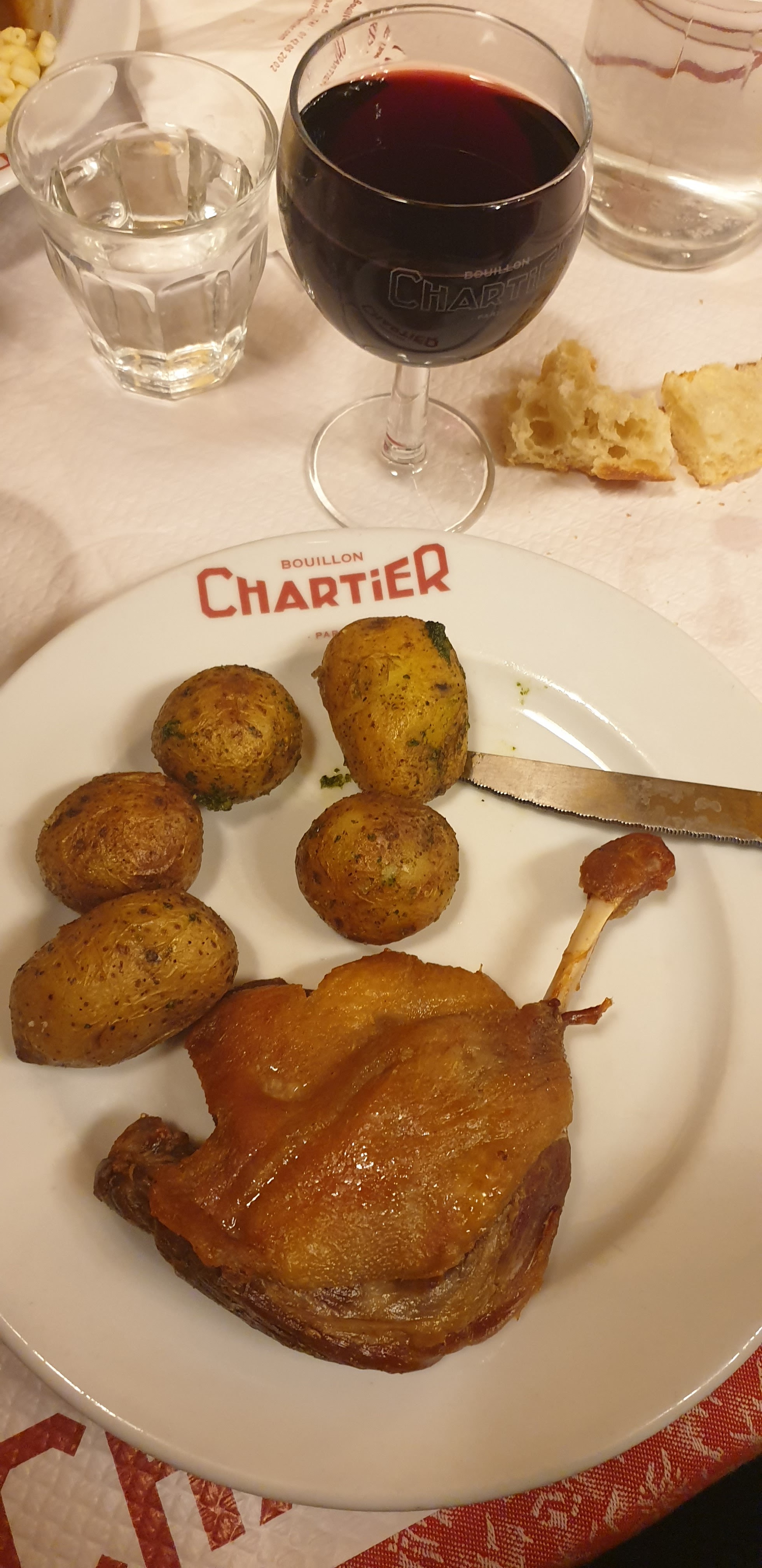 J’ai voulu découvrir l’autre bouillon Chartier après celui de grand boulevard. Dès mon arrivée, les couverts et les verres étaient sales: super l’hygiène. J’ai commandé un canard confit avec des pommes grenailles. On m’a servit 4 petites pommes grenailles: j’allais pas m’étouffer! Si le coût matière est trop cher, mettez un autre produits. La pomme de terre est à 1€ le kilo TTC. Je prends systématiquement un dessert mais là je suis parti illico presto après le plat. Je ne recommande pas: aller à un autre bouillon.