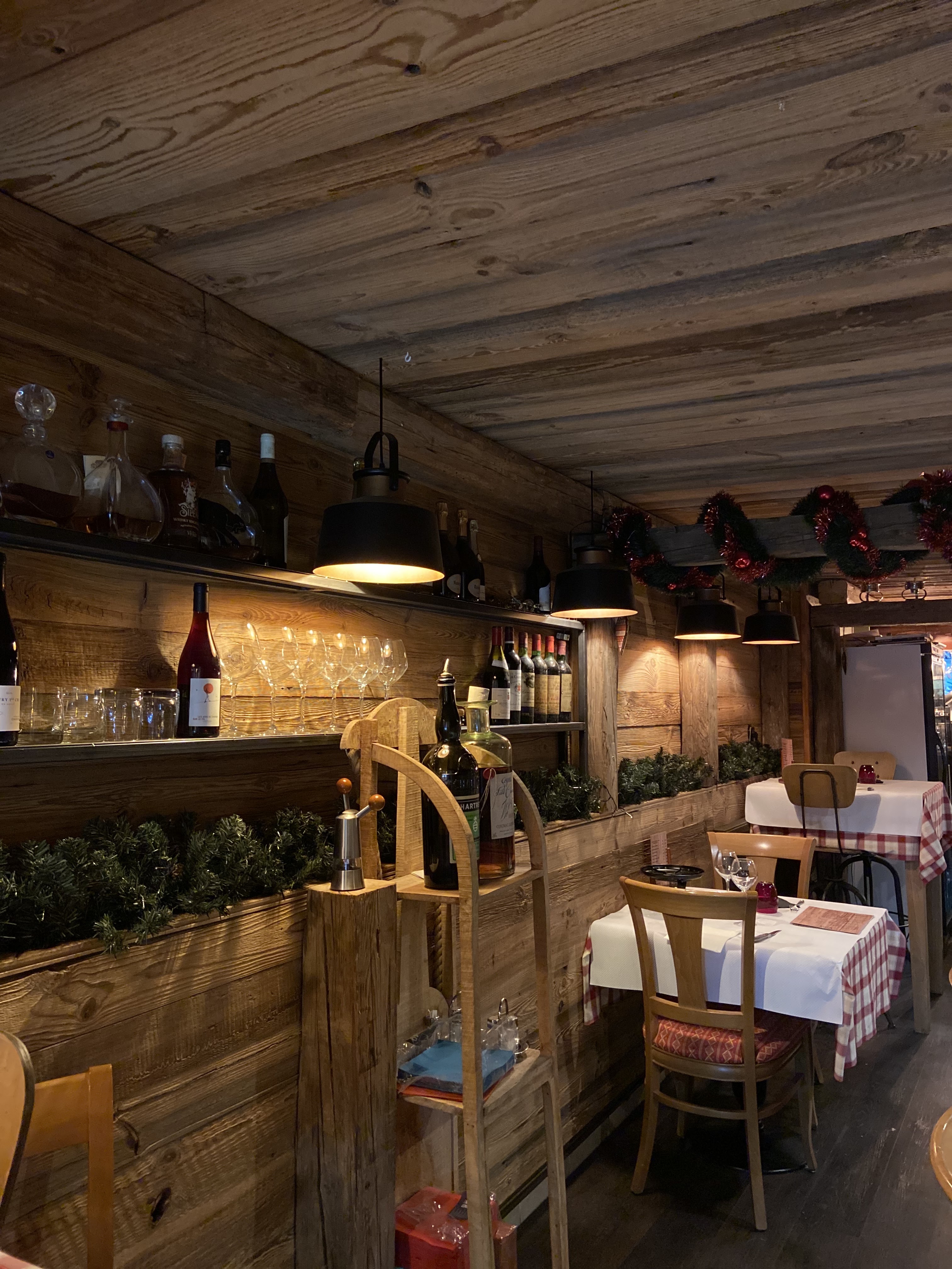 Tout petit restaurant. Ambiance chaleureuse dans un style chalet de montagne avec des boiseries (bien décorées au moment de Noël). Surtout pensez à réserver sinon.... Fondues extra. Service efficace et sympa. Prévoir de 45 à 50 €/personne. Je recommande !