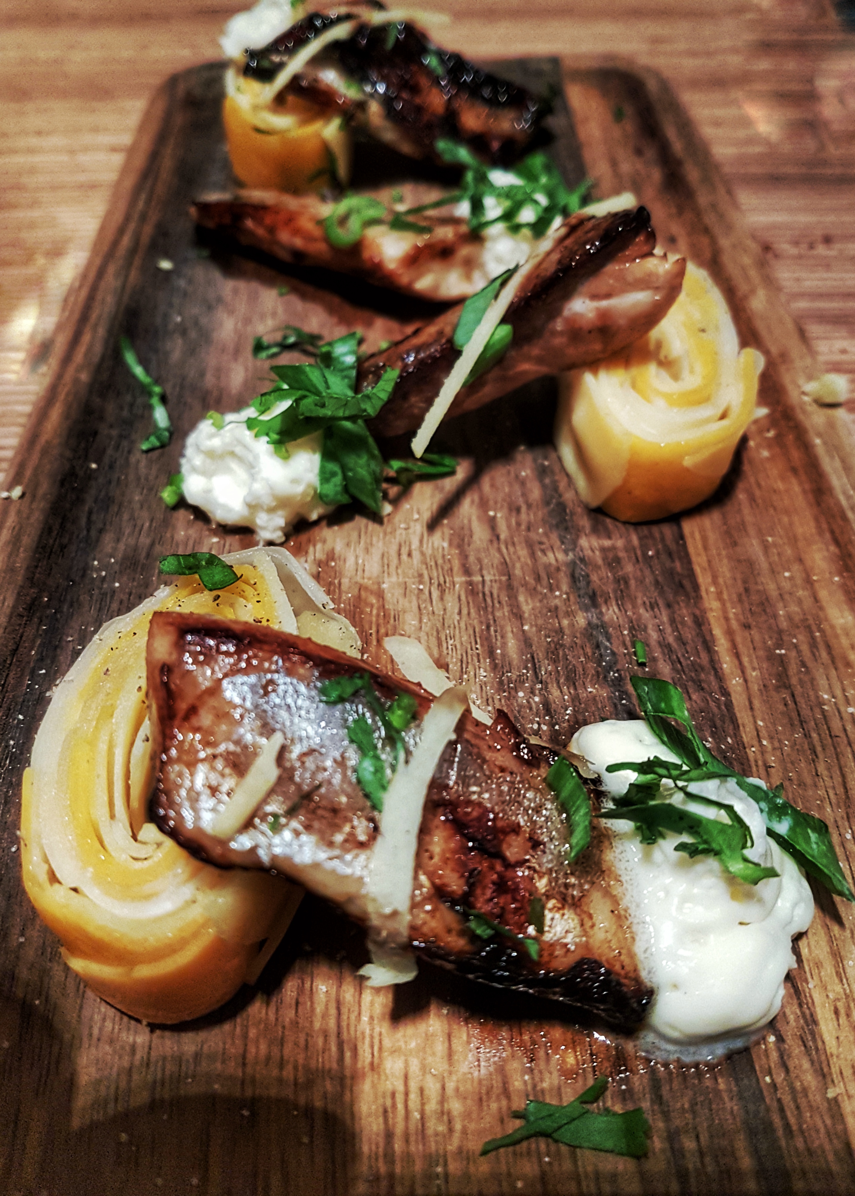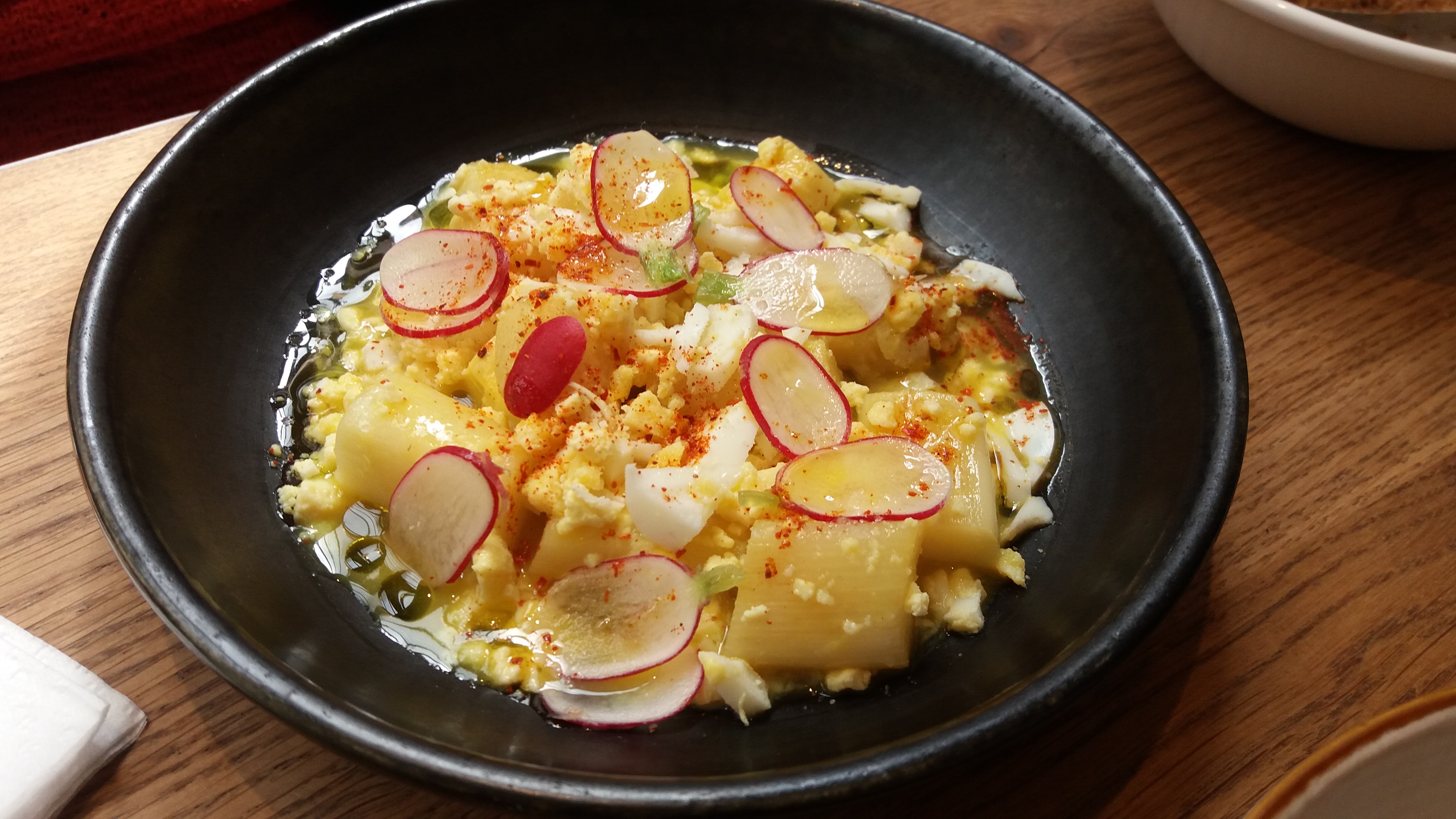Ce restaurant sert des plats en format tapas, soit des classiques comme de la charcuterie, soit de vraies créations plus de type plat de restaurant. Les frites sont bonnes et servies avec une sauce épicée, très bons couteaux au chorizo maison et très bonne caille. Moins emballée par le baba au rhum très chargé et par la Chantilly au siphon banale.