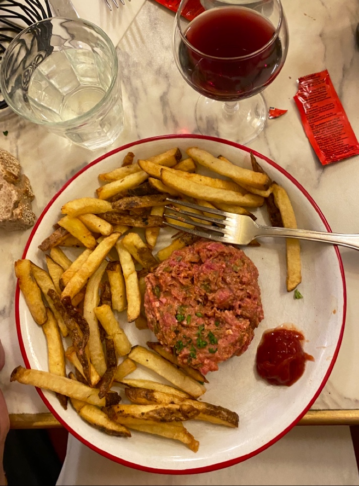Un rapport qualité prix hallucinant, avec œufs mayo à 2,50€, céleri rémoulade a 3,50, plats entre 11 et 14€, ce qui explique que le filet mignon et le poulet au vinaigre avaient été pris d’assaut. On se rattrape avec un tartare de bonne facture et des frites maison irréprochables : tout est simple, peut-être un peu basique, mais frais et pas mal fait. Service nickel, merci !