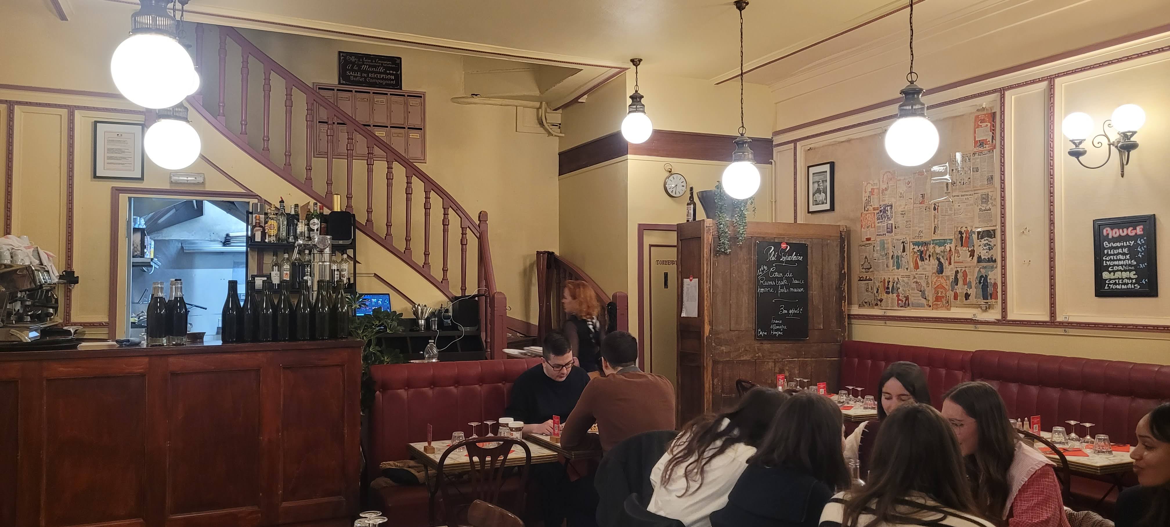 Un vrai lieu convivial avec une cuisine lyonnaise simple mais excellente du bouillon vermicelles à la côte de bœuf en passant par l'oeuf mayo et l'os a moelle, sans oublié les desserts ( baba au rhum, tarte praline, ... ) et le fromage.