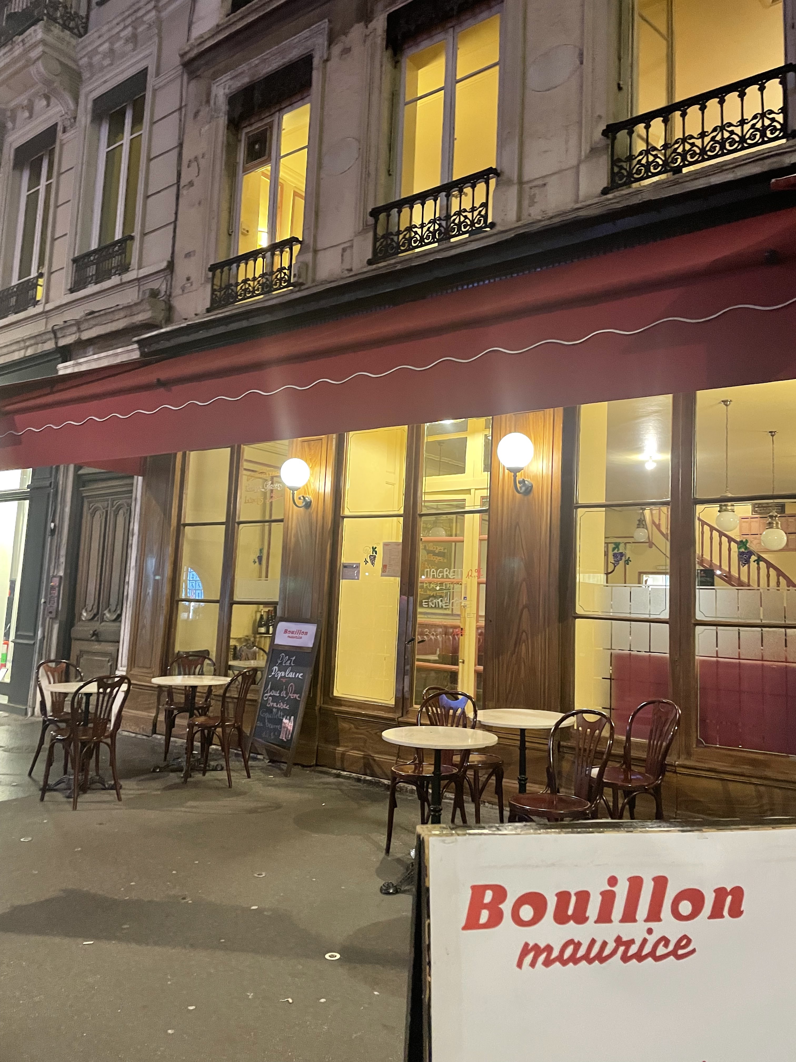 Bonjour, vous cherchez un petit resto à l'ancienne, sympa et populaire près des Cordeliers ou de la Bourse de Lyon? C'est simple: réservez une table au Bouillon Maurice (autre fois La Manille), 33 rue Tupin: des plats simples et bons, un accueil sympa, un service toujours souriant et rapide ainsi que des prix raisonnables. Un public jeune d'habitués ou de passage, quelques clients du quartier. Un excellent endroit pour faire une pause pendant vos courses sur la Presqu'île. Selon le remplissage du restaurant, l'ambiance peut devenir un peu bruyant, mais elle reste néanmoins toujours sympa.