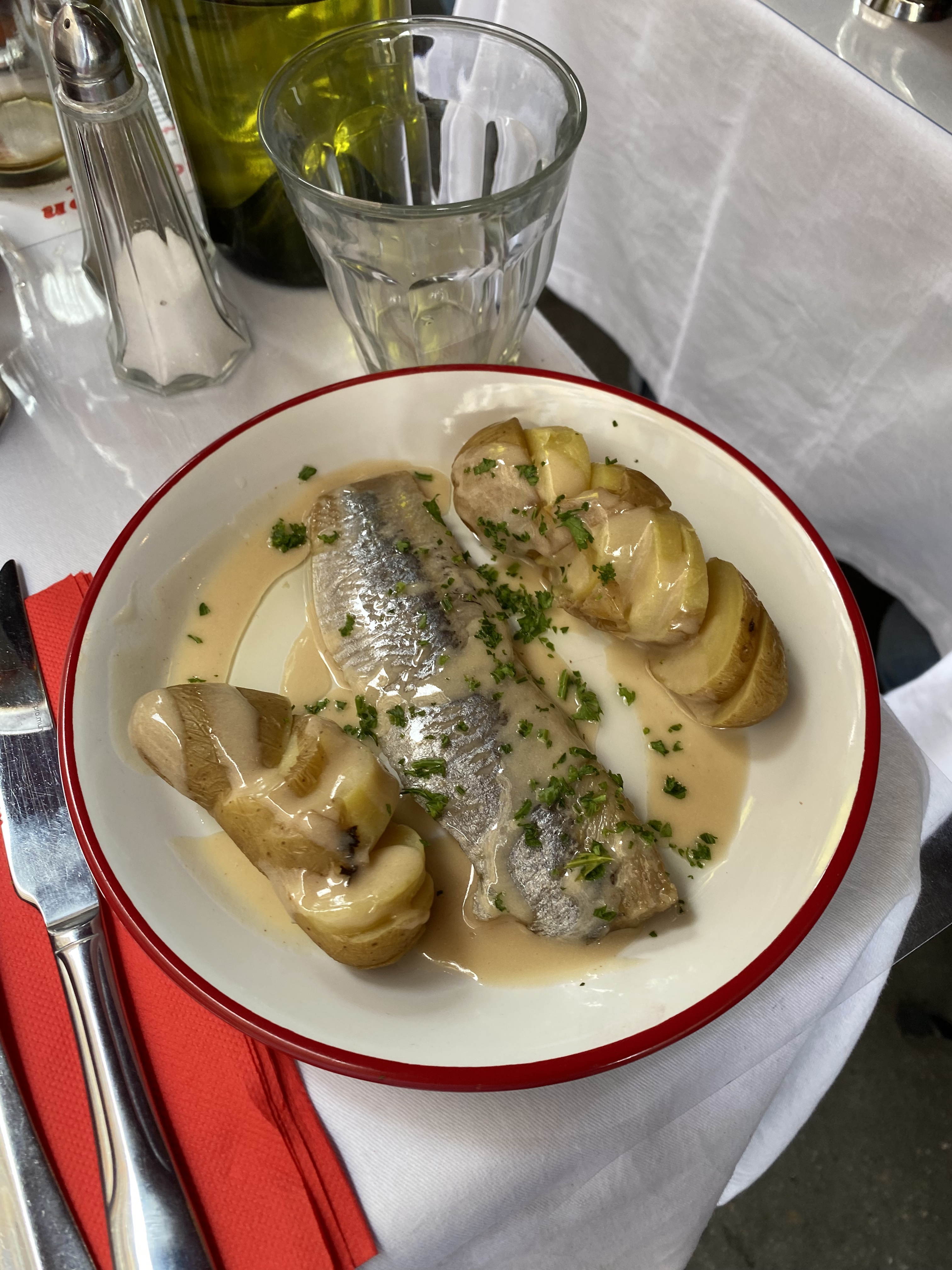 Très bonne adresse du midi . Service efficace, rapide et agréable. Nous avons choisi le bouillon de vermicelles pour se réchauffer ( beaucoup de bouillon ) , les harengs pomme à l'huile ( 1 hareng ) , un tartare frites maison ( assaisonné aux herbes , mais pas mayo , pas ketchup , pas d'oeuf . On ajoute tabasco et worsectershire ) , et une tête de veau ( un morceau fin , pommes de terre cuite à l'eau ) . Un tariquet et un viognier pour accompagner. Nous étions satisfaits des quantités et du rapport qualité prix. Attention très bruyant. A privilégier pour une ambiance tous ensemble tous ensemble mais pas du tout pour des confidences .