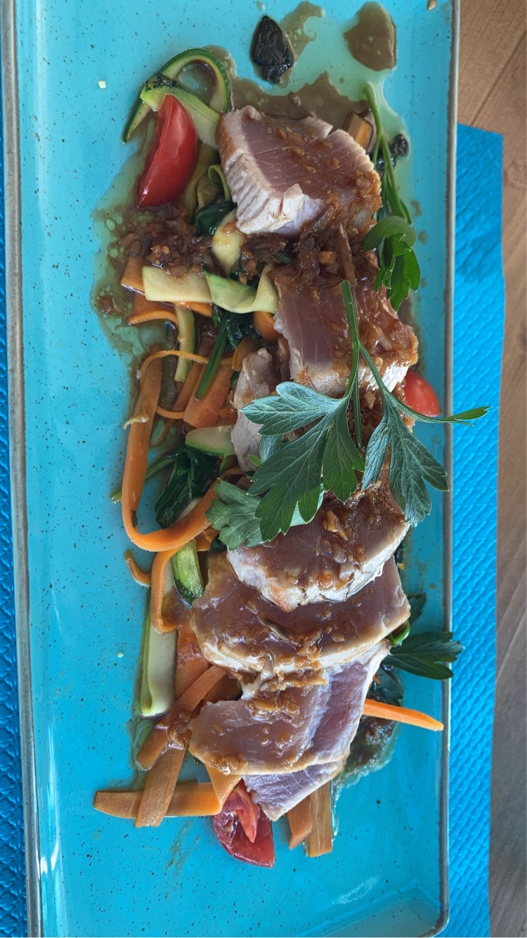 Des plats copieux présentation originale et délicieux en plus les pieds dans l'eau..