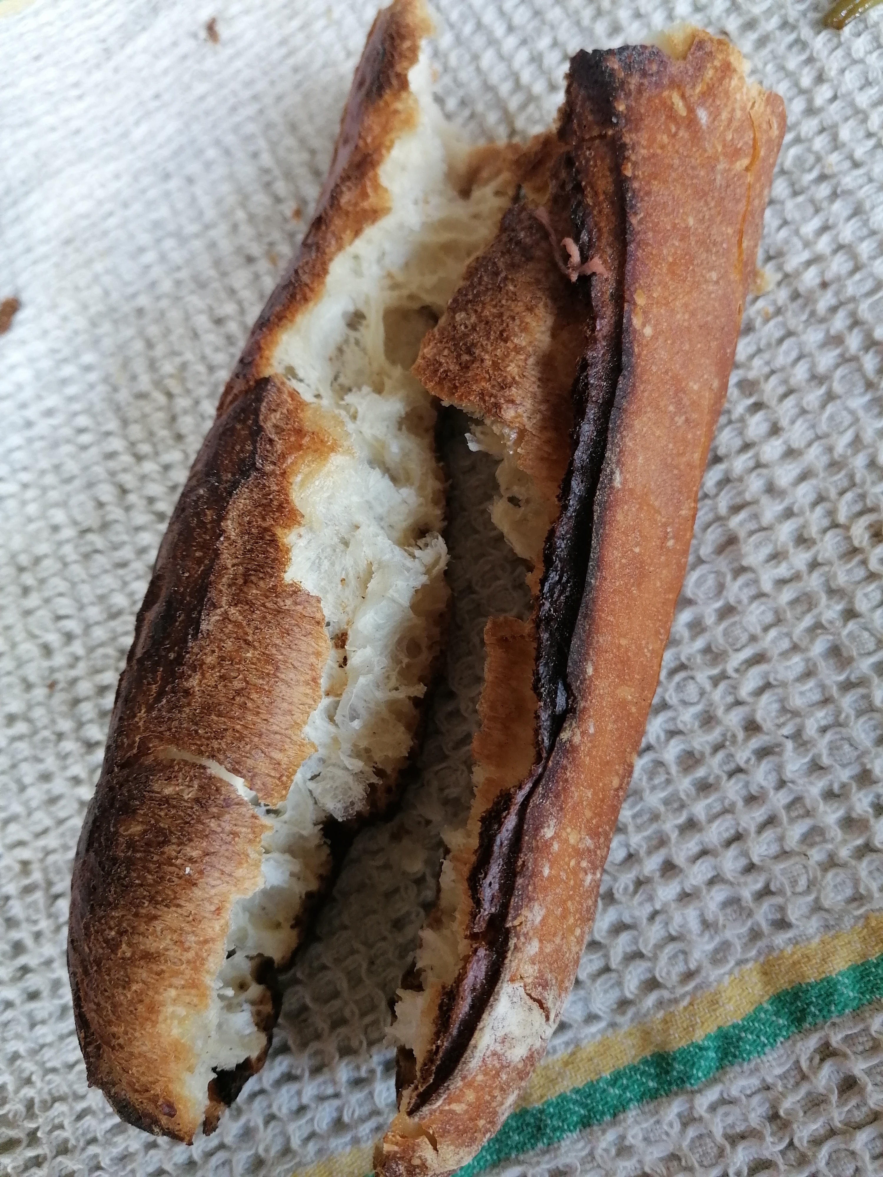 Probablement pas encore eu la recette de la baguette... Une baguette molle qui a pris l'humidité, une mie sans goût et peut-être trop cuite... Fun Fact : 'Je souhaiterais une baguette s'il vous plaît' Serveuse (pas très contente de son métier) : Une aux graines, à la farine de..., ou...? Moi : 'Eh bien une bonne baguette française simple, nature'... Je ne comprends pas pourquoi proposer de la diversité en baguette, alors que la baguette de base ne semble pas en être une... :(