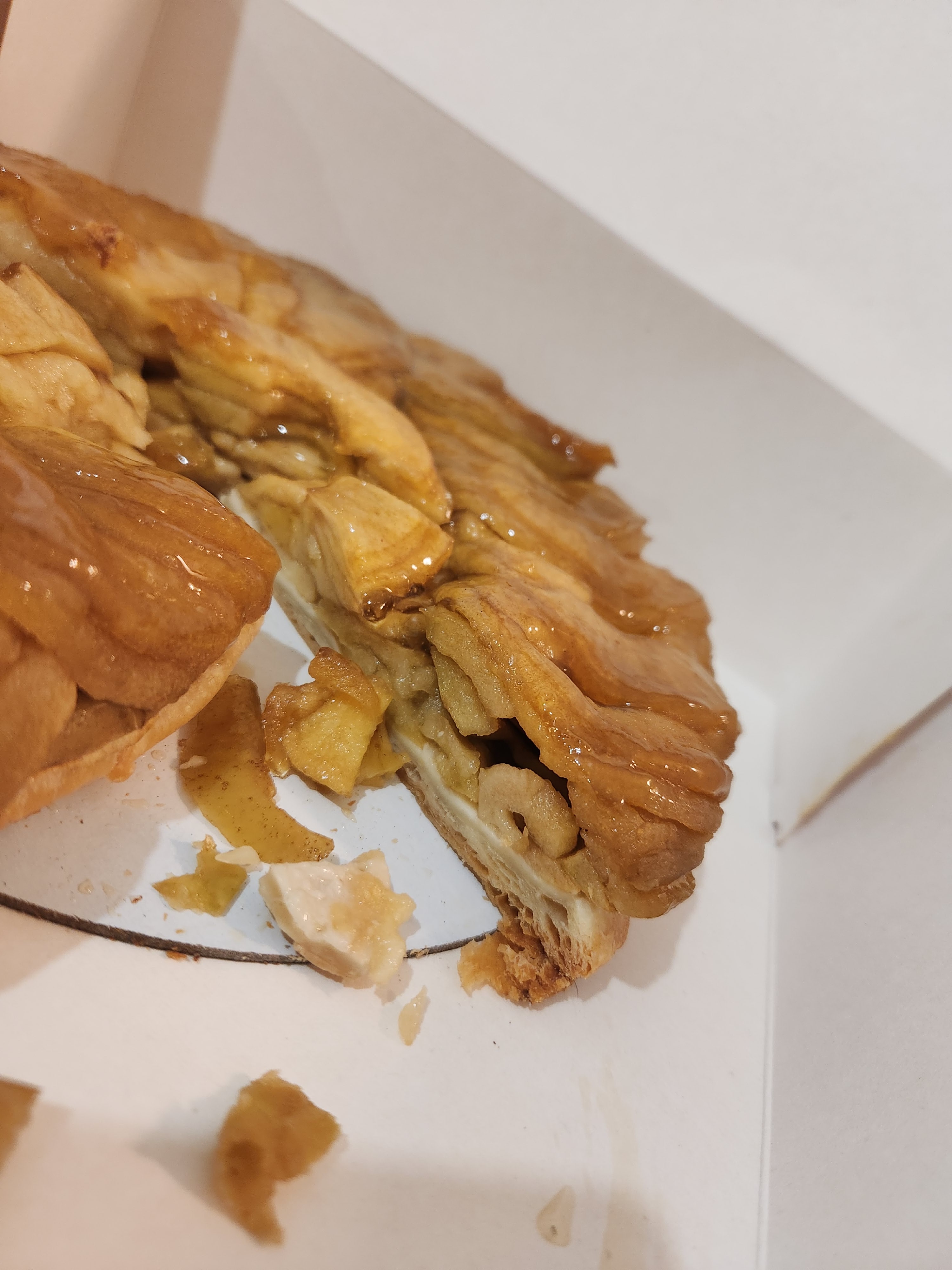 J'ai pris une tarte aux pommes qui n'en ai pas une. C'est une pâte feuilleter empiler de pomme trancher couper avec la peau qui en plus et dur et désagréable en bouche. Je recommande pas du tout cette tarte.