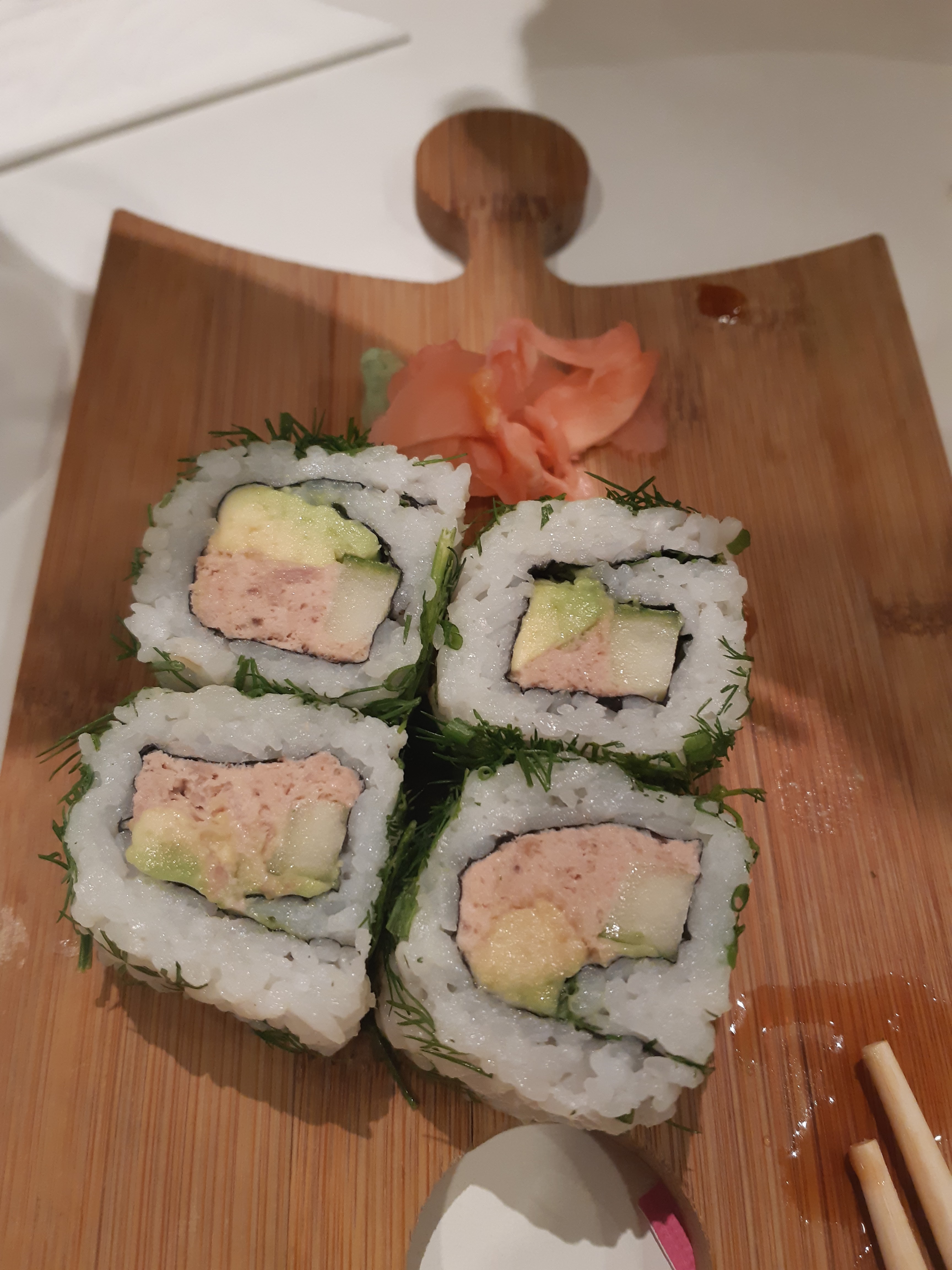 Livraison uber eat California thon excellent ; il faut absolument goûter les signature. J'ai pris le dragon eye, c'était très bon même froid à cause du temps de livraison. Sauce soja sucrée/salée + wasabi + gingembre fourni avec la commande. Je vous le recommande et je recommanderai !