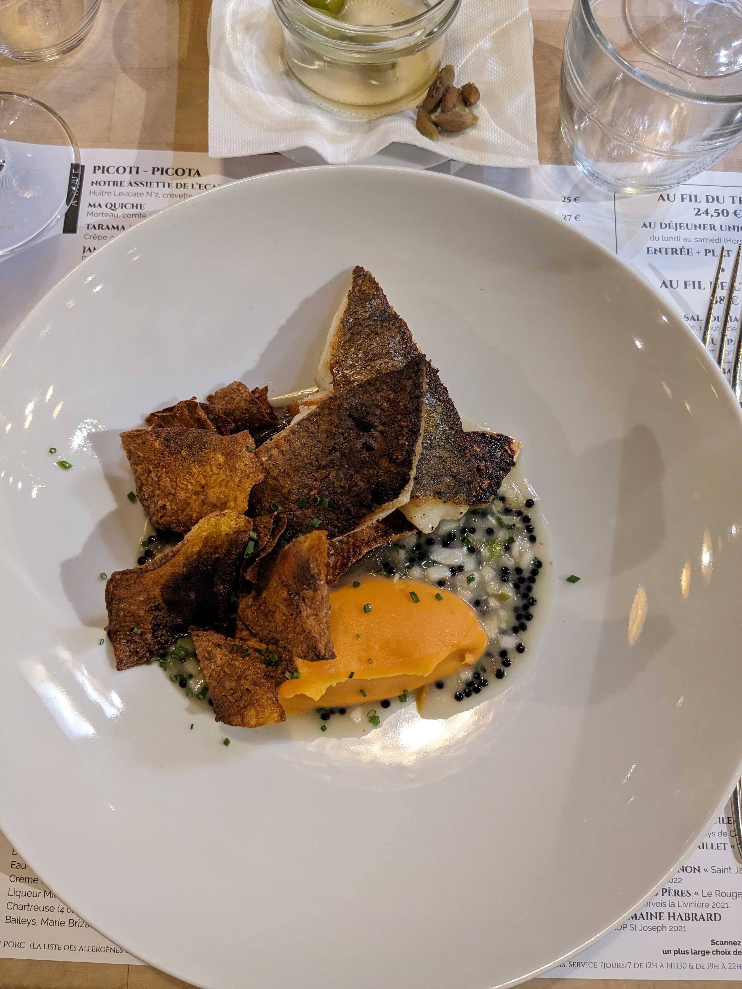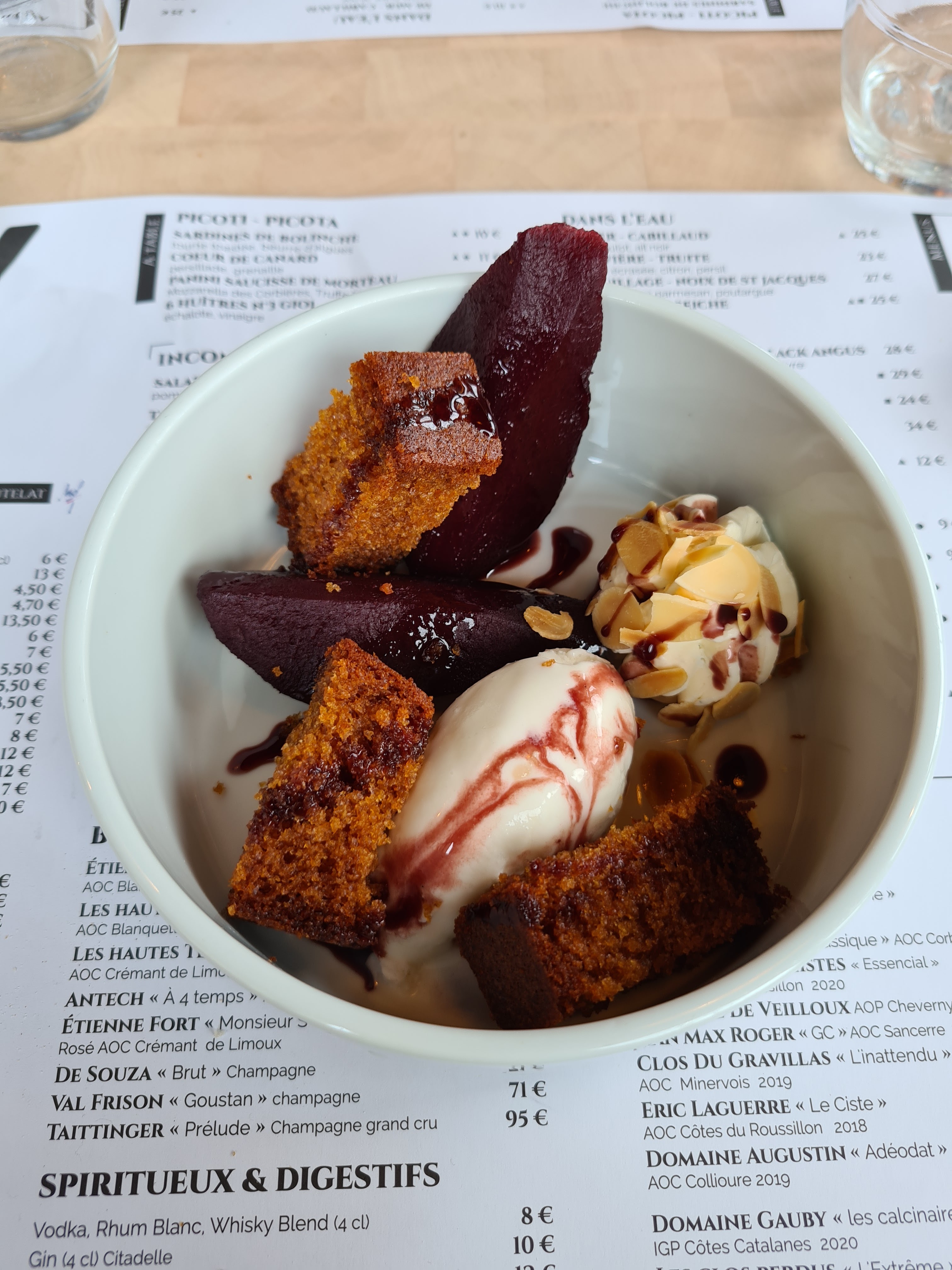J'ai profité de mon dernier passage à Carcassonne pour découvrir cette adresse plébiscitée par les guides culinaires. Les températures clémentes de la mi-Mars m'ont permis de profiter du calme de la terrasse. Je me suis laissé porté par le menu Au fil de l'hiver. L'entrée avec son Œuf Parfait bien que généreuse, m'a laissé sur ma faim. La perception dans les saveurs et les textures d'être comme à la maison. Le plat avec son Bar m'a séduit. Une cuisson des filets parfaites, peau croustillante / chair fondante. Un jeu dans les textures avec une purée de patate douce accompagnée de chips croustillantes, un sans fautes. Le dessert avec sa Forêt Noire destructurée a été une belle balade. Ma cuillère volait des enivrantes génoises cacaotées imbibées de Kirsch vers la légèreté de la crème chantilly. Elle cassait avec malice les morceaux de chocolat et tranchait avec gourmandise le sorbet aux fruits rouges.