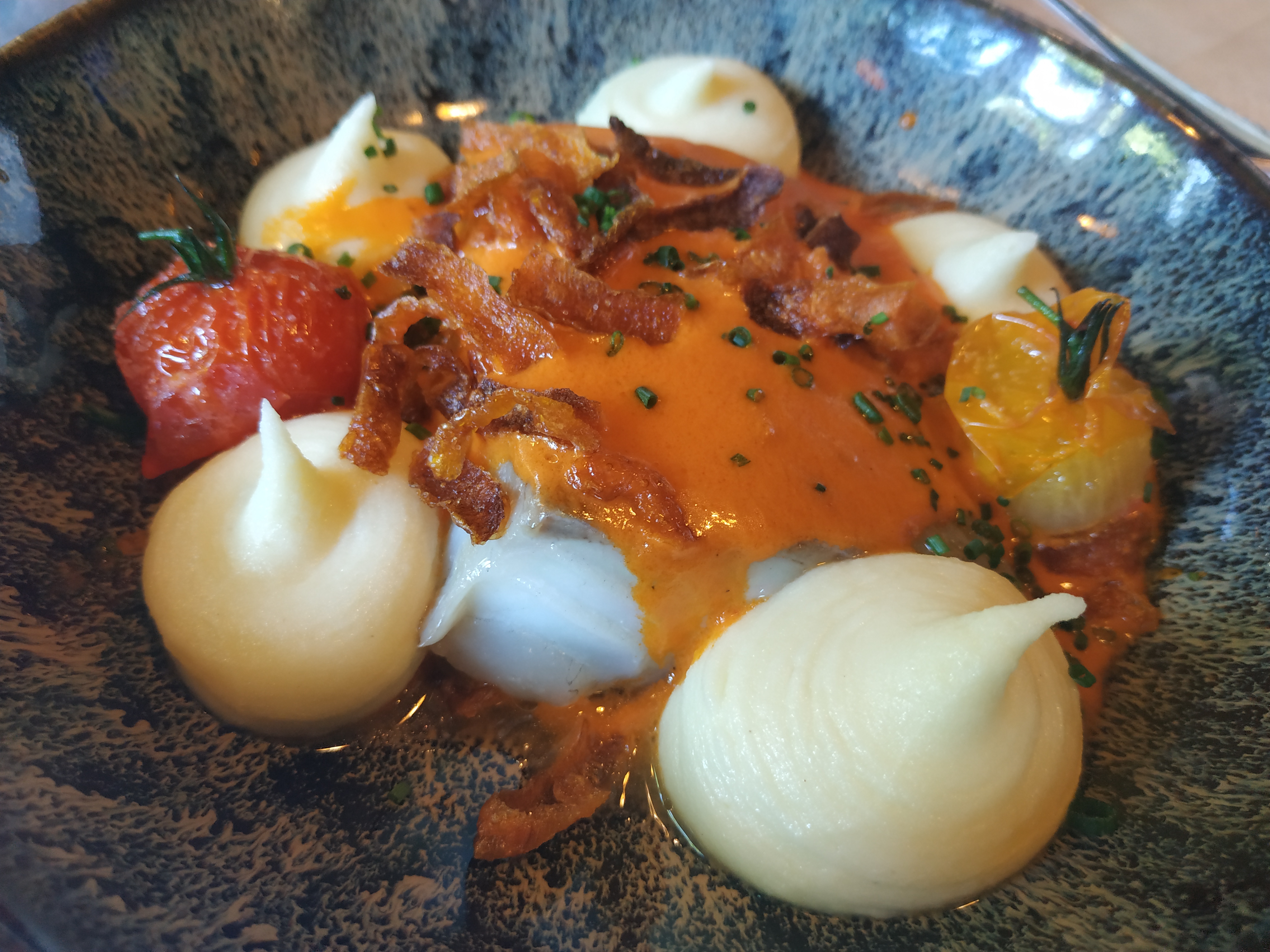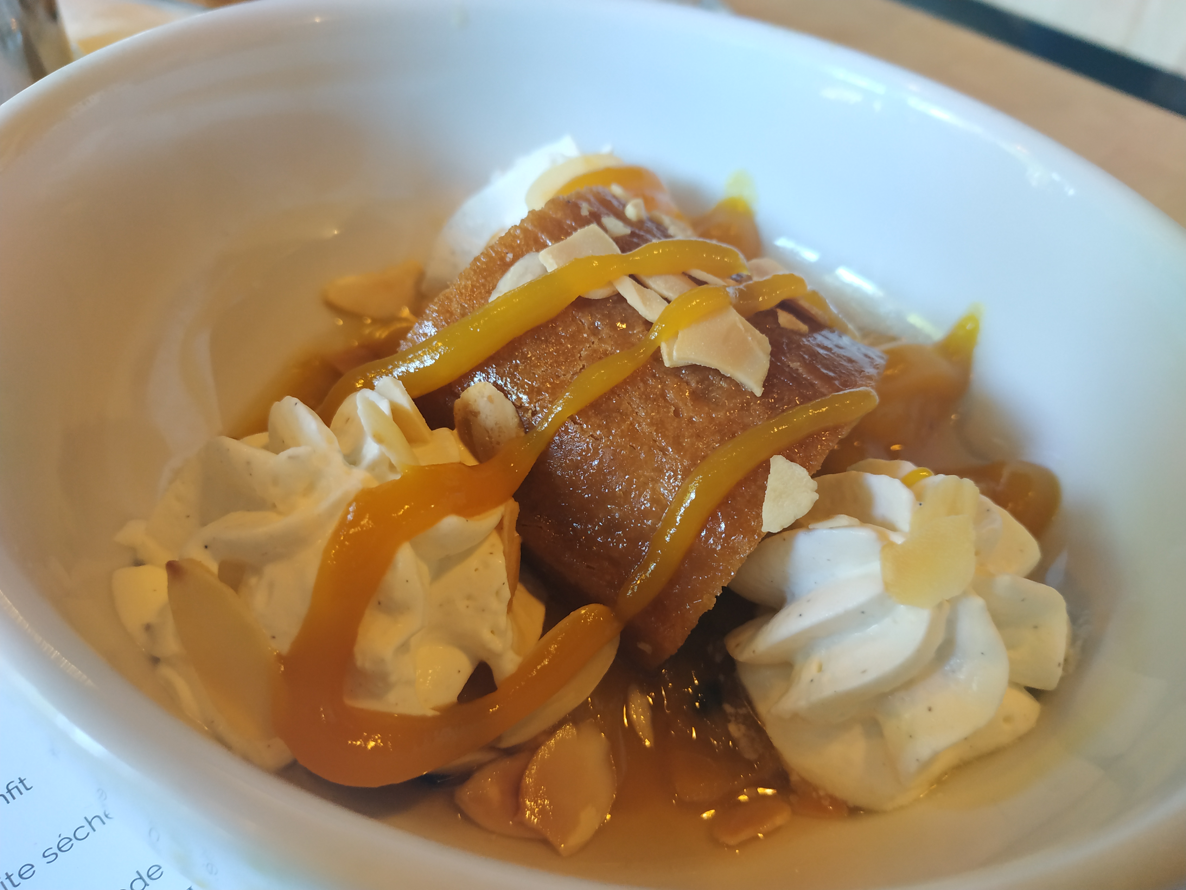 Parfait de l’entrée au dessert. Nous avons testé le menu à 24€, suggestion du jour : Gaspacho de melon verveine menthe, merlu, purée au jus de soupe de poisson et carottes rôties. Et enfin tarte tâtin et sa quenelle de crème chantilly (bien épaisse 😋)