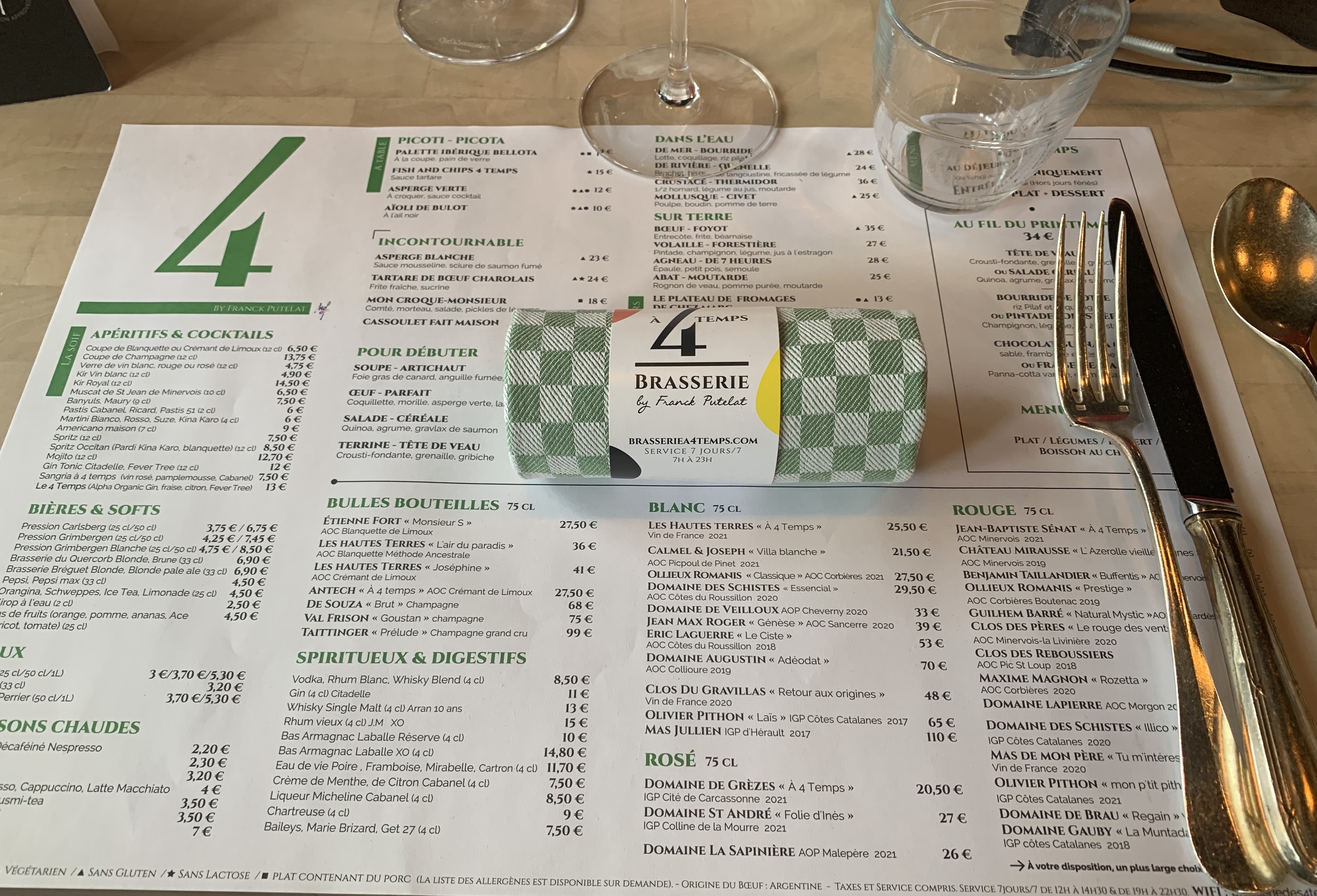Excellente soirée passée à la Brasserie des 4 temps, tous les serveurs sont agréables, le service est rapide et menu complet était exquis ! Le repas se termine en apothéose avec un dessert fabuleux ! Je reviendrai sans hésiter, une excellente adresse à Carcassonne.